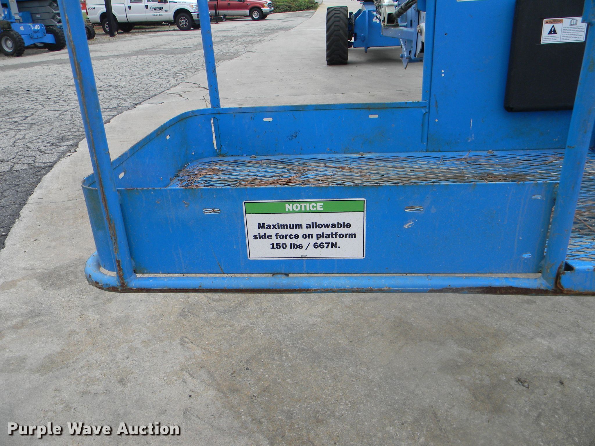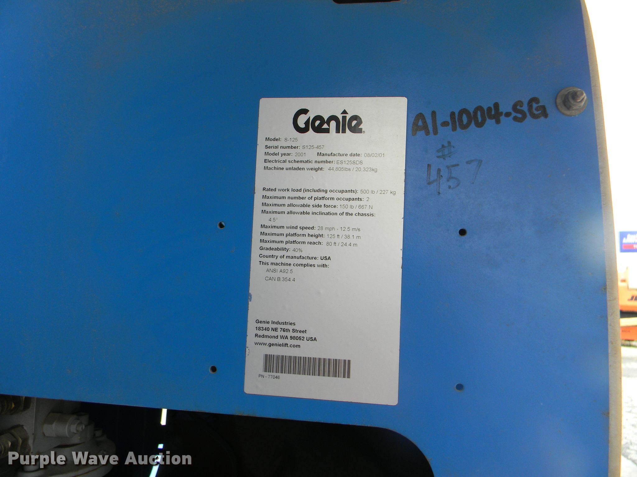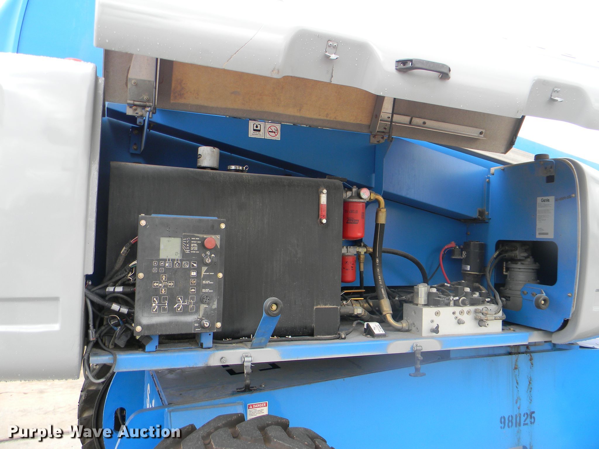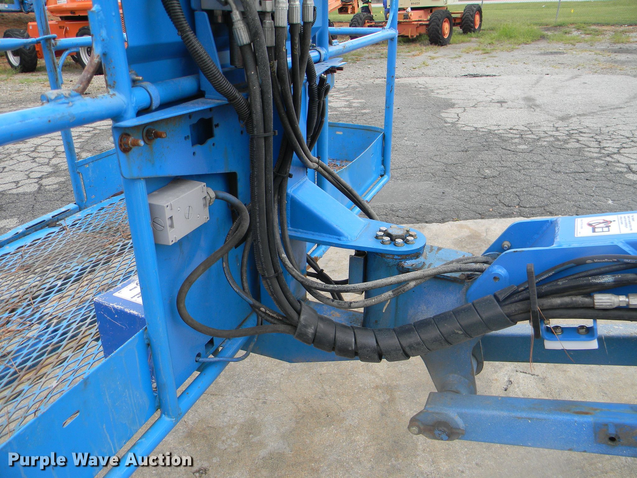 Purple Wave is selling a used Boom Lift in Georgia. This item is a 2002 Genie S-125 boom lift with the following: 7,355 hours on meter, Four cylinder diesel engine, Four wheel drive, 500 lbs maximum lift capacity, 80' maximum reach, 125' maximum lift height, Hydraulic extendable jib, 8'L x 3'W platform, AC power outlet, Platform and ground controls, Hydraulic platform rotation, 445/65D22.5 foam filled tires, Serial S125-457