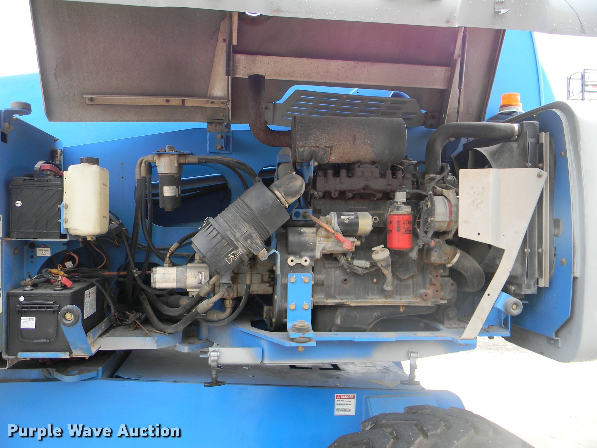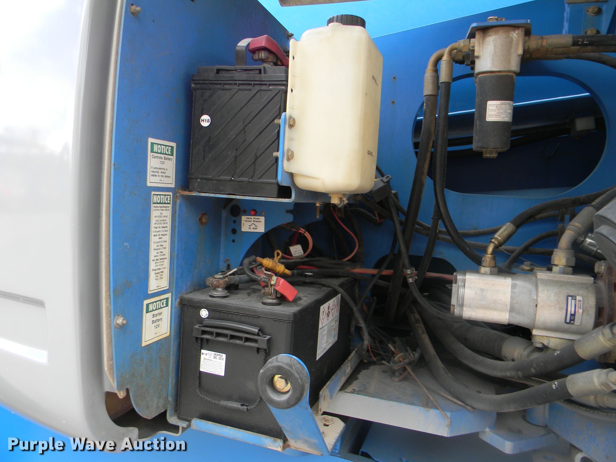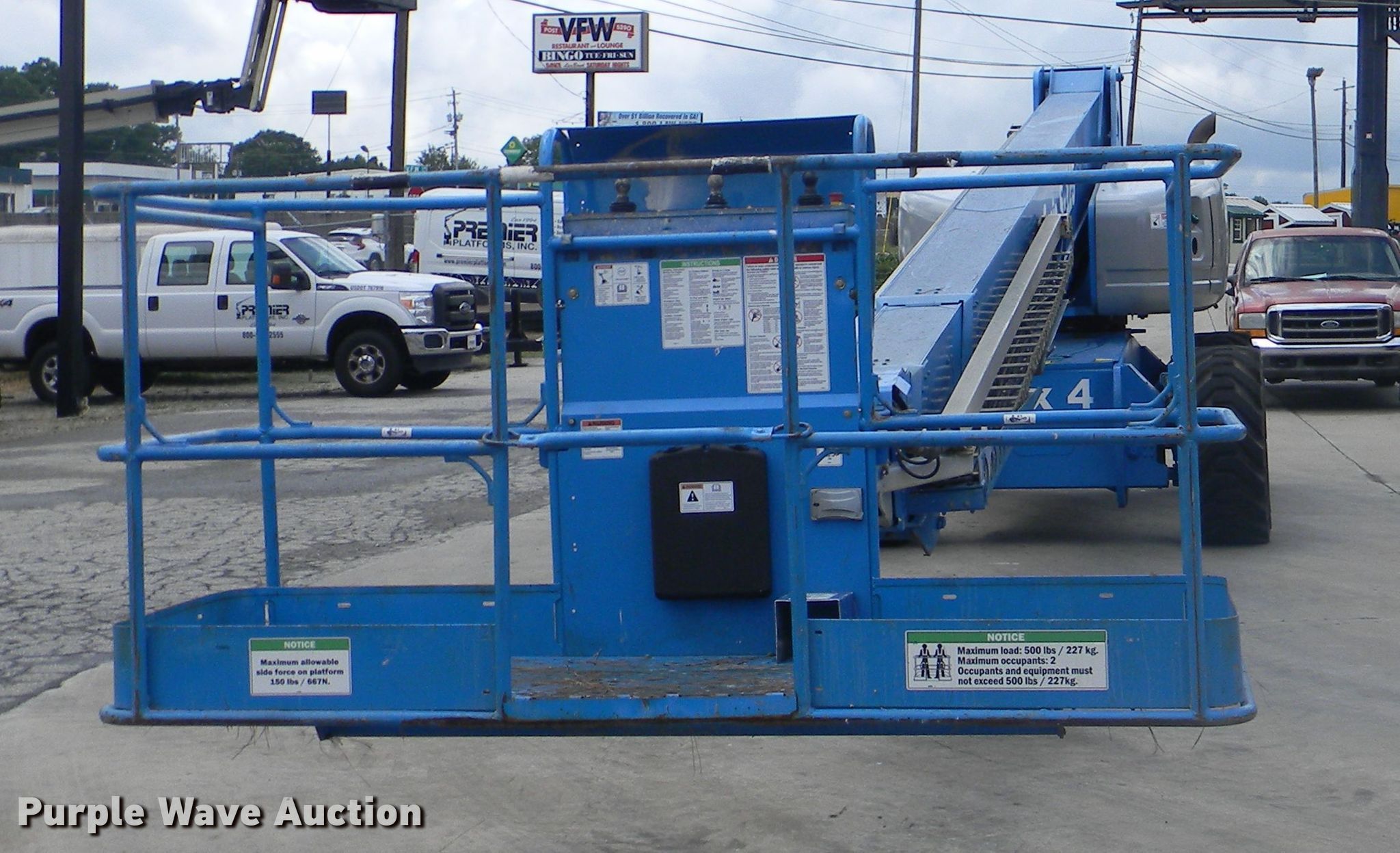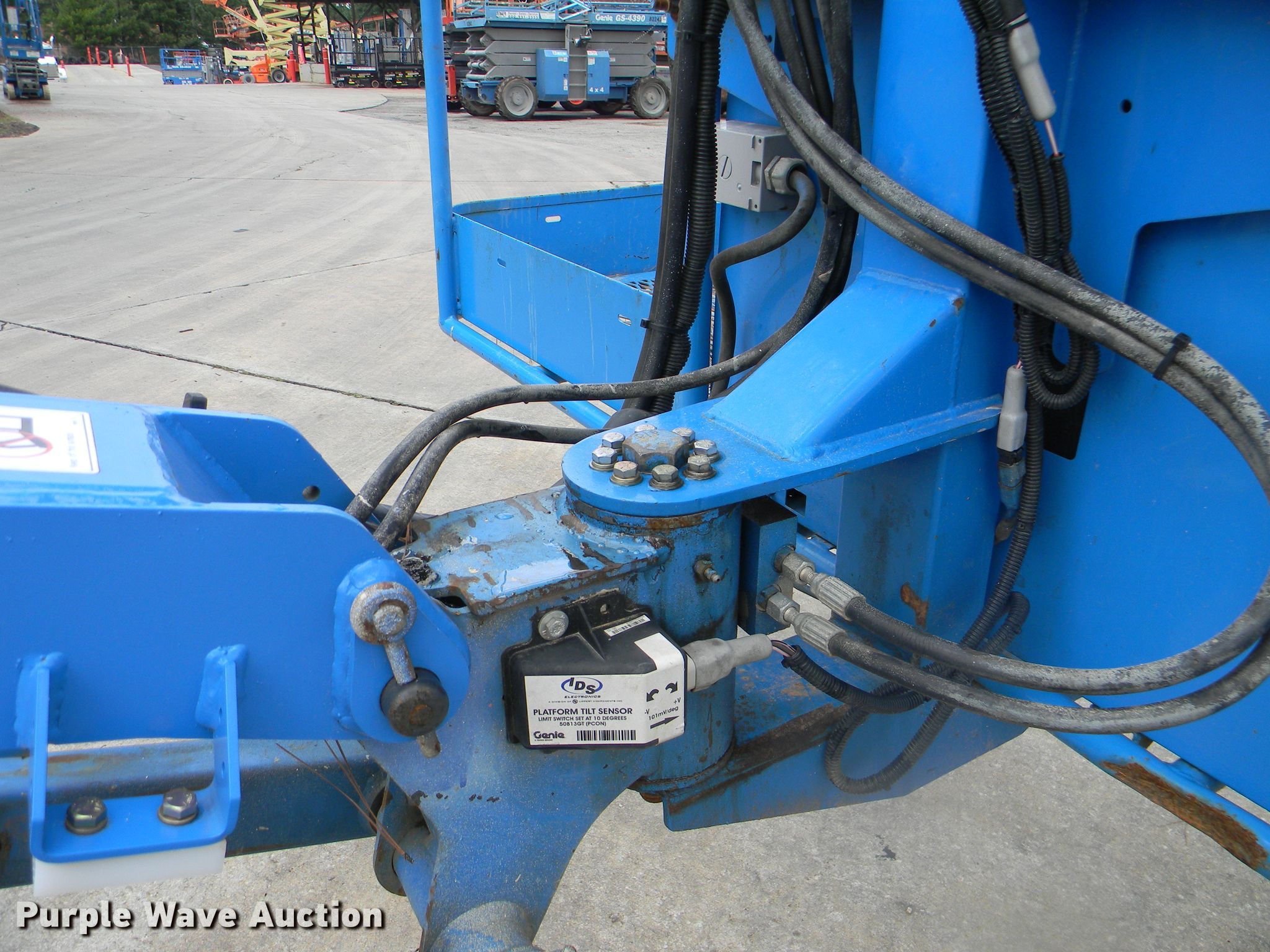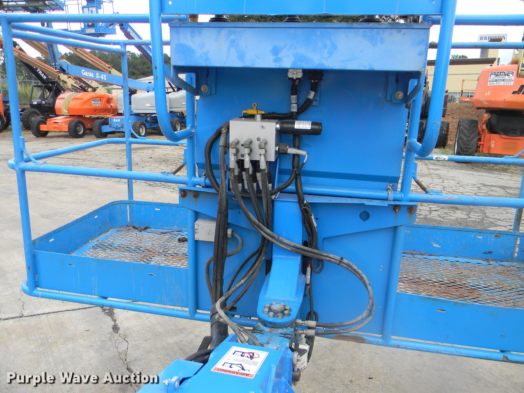Purple Wave is selling a used Boom Lift in Georgia. This item is a 2002 Genie S-125 boom lift with the following: 7,355 hours on meter, Four cylinder diesel engine, Four wheel drive, 500 lbs maximum lift capacity, 80' maximum reach, 125' maximum lift height, Hydraulic extendable jib, 8'L x 3'W platform, AC power outlet, Platform and ground controls, Hydraulic platform rotation, 445/65D22.5 foam filled tires, Serial S125-457