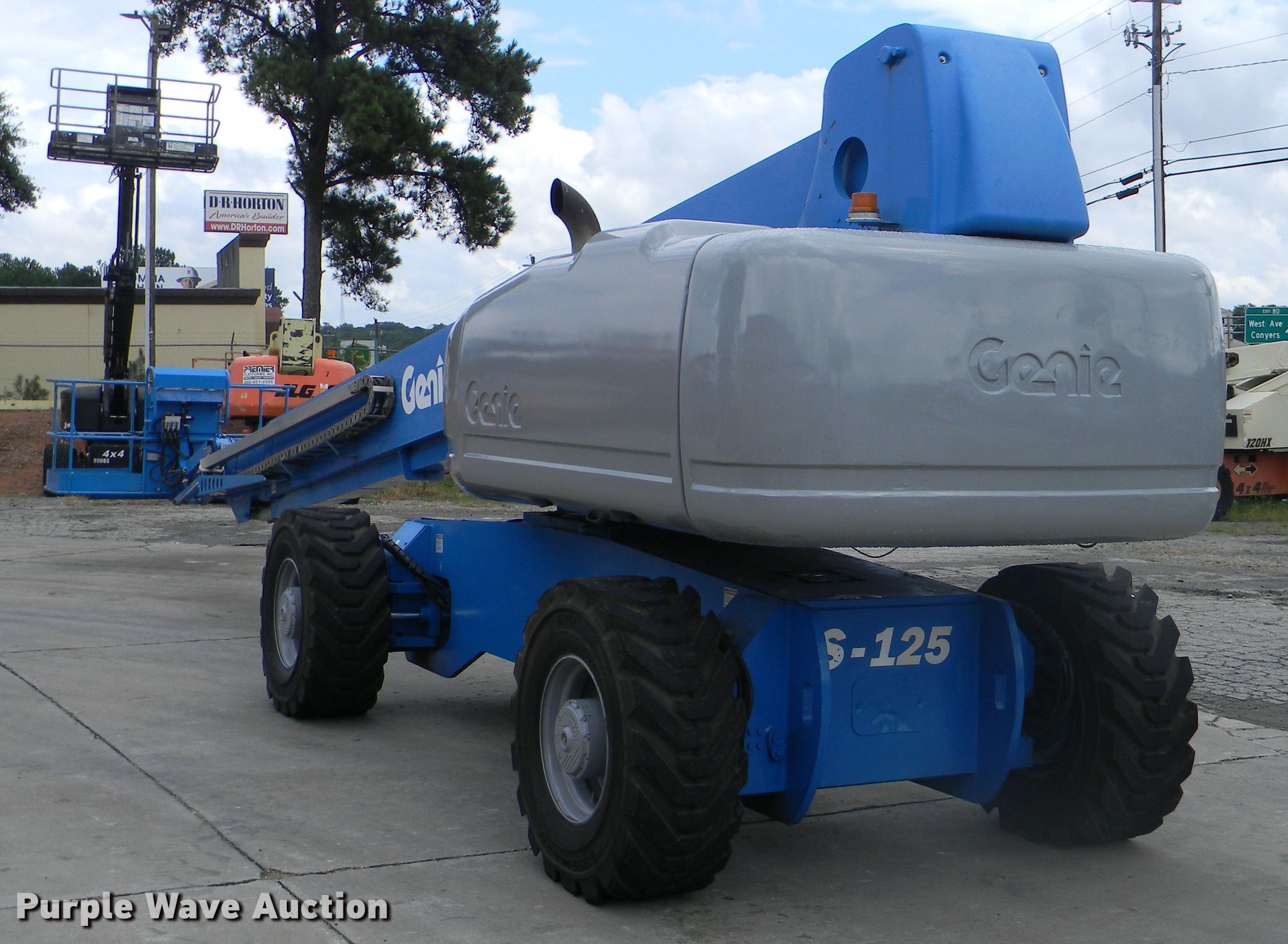 2002 Genie S-125 boom lift. 7,355 hours on meter, Four cylinder diesel engine, Four wheel drive, 500 lbs maximum lift capacity, 80' maximum reach, 125' maximum lift height, Hydraulic extendable jib, 8'L x 3'W platform AC power outlet, Platform and ground controls, Hydraulic platform rotation, 445/65D22.5 foam filled tires, Serial S125-457. 1469 Dogwood Dr SW. Conyers, GA 30012
