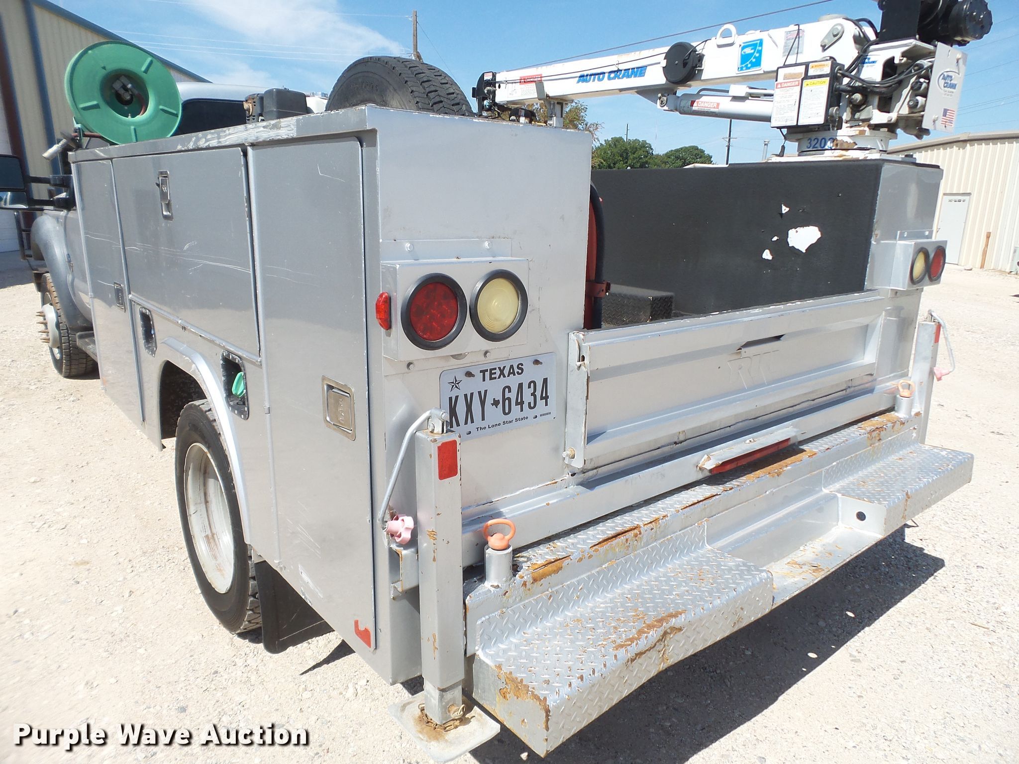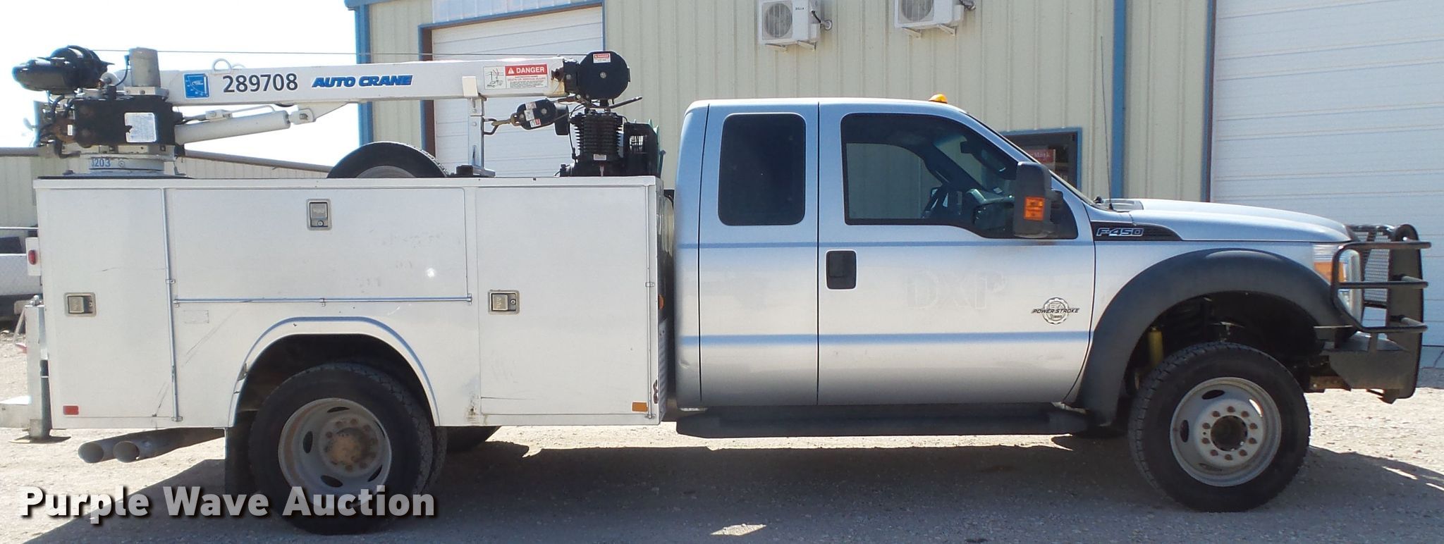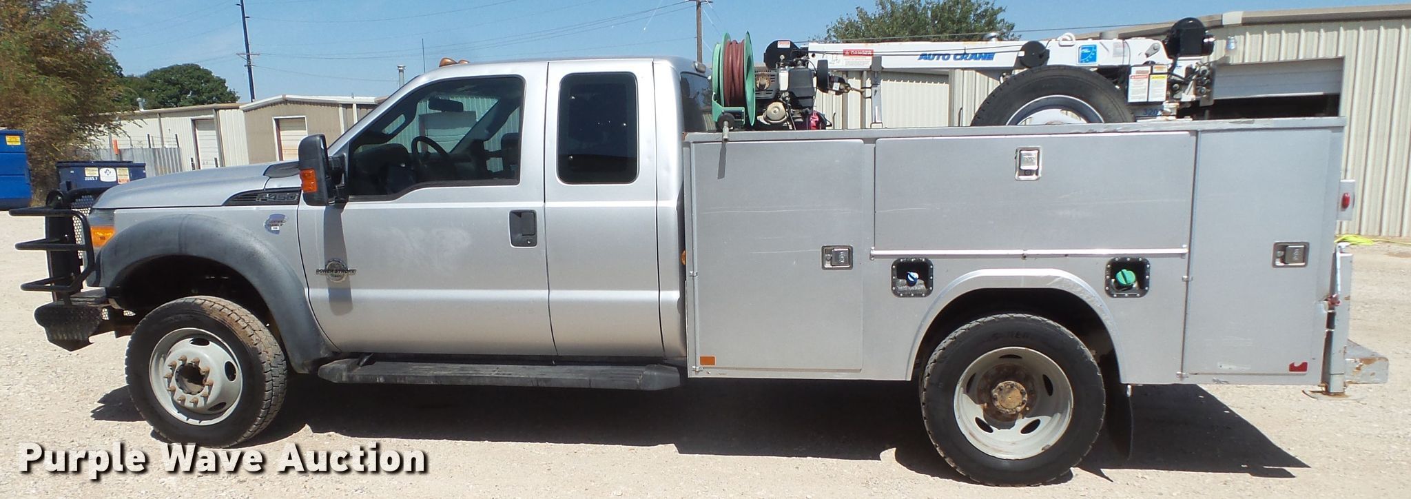 Purple Wave is selling a used Service Truck in Texas. This item is a 2013 Ford F450 Super Duty SuperCab utility truck with crane with the following: 200,867 miles on odometer, 6.7L V8 OHV 16V diesel engine, Automatic transmission, Single axle, AC and heat, Power windows and locks, Auxiliary controls, RKI E60DW1C94 utility bed, Air compressor, Honda 390 gas engine, Hose reels,, Auto Crane 3203 crane, 15'L boom, 3,200 lbs max lift capacity, Hydraulic brakes, Spring suspension, 225/70R19.5 tires, GVWR 16,500 lbs, Hail damage, Check engine light on