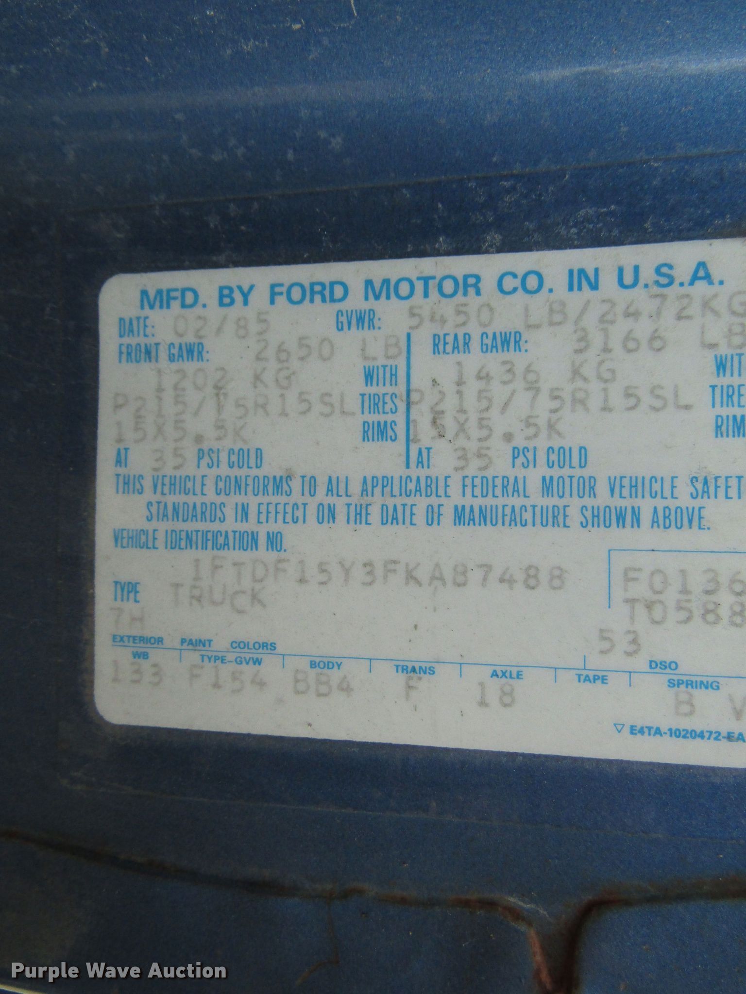 1985 Ford F150 pickup truck. 60,981 miles on odometer, 4.9L L6 OHV 12V gas engine, Four speed manual transmission, Heat, 235/75R15 tires, Cracked windshield, Non-operational unit. Kansas title. 1FTDF15Y3FKA87488. Marion, KS 66861