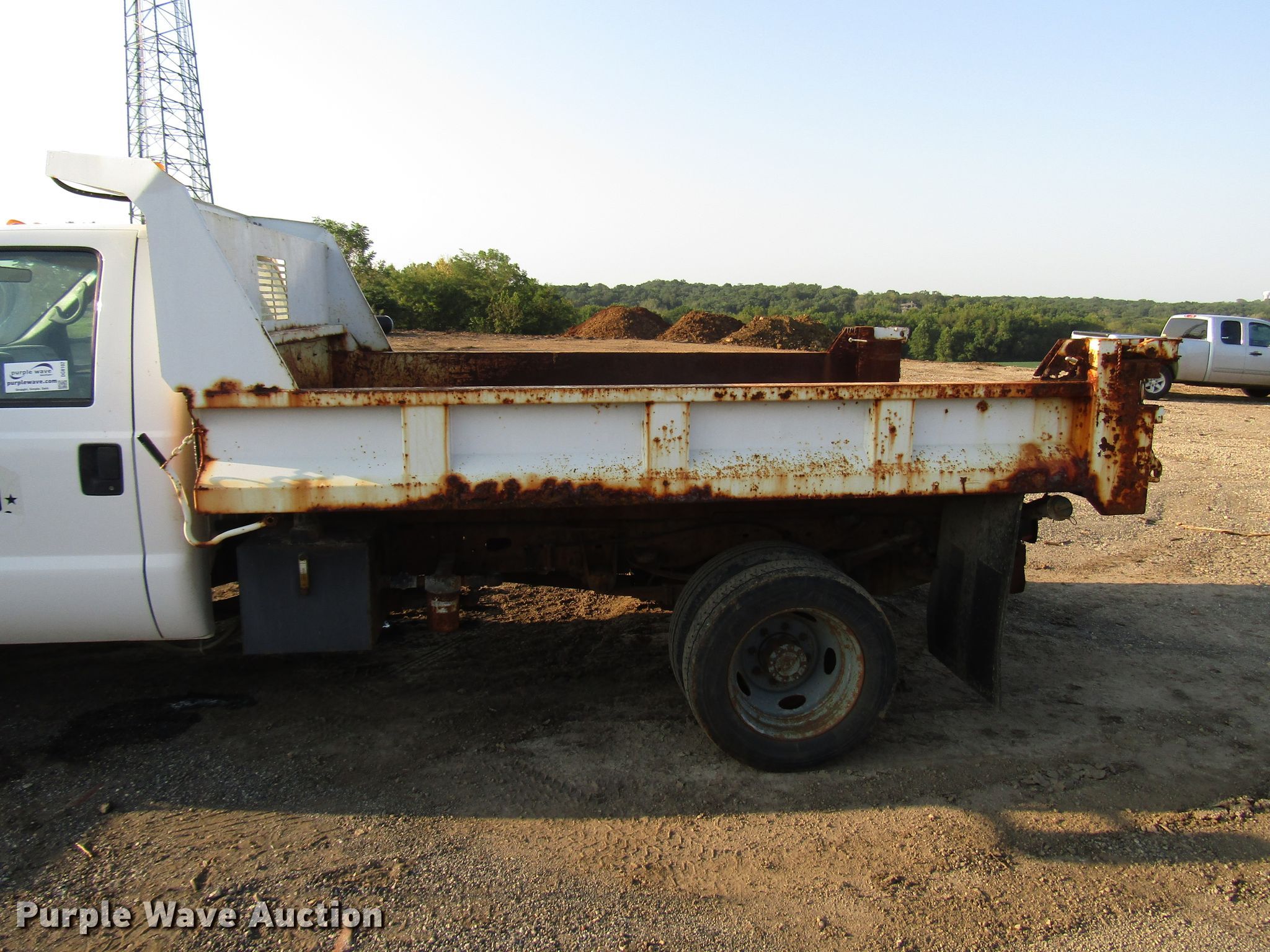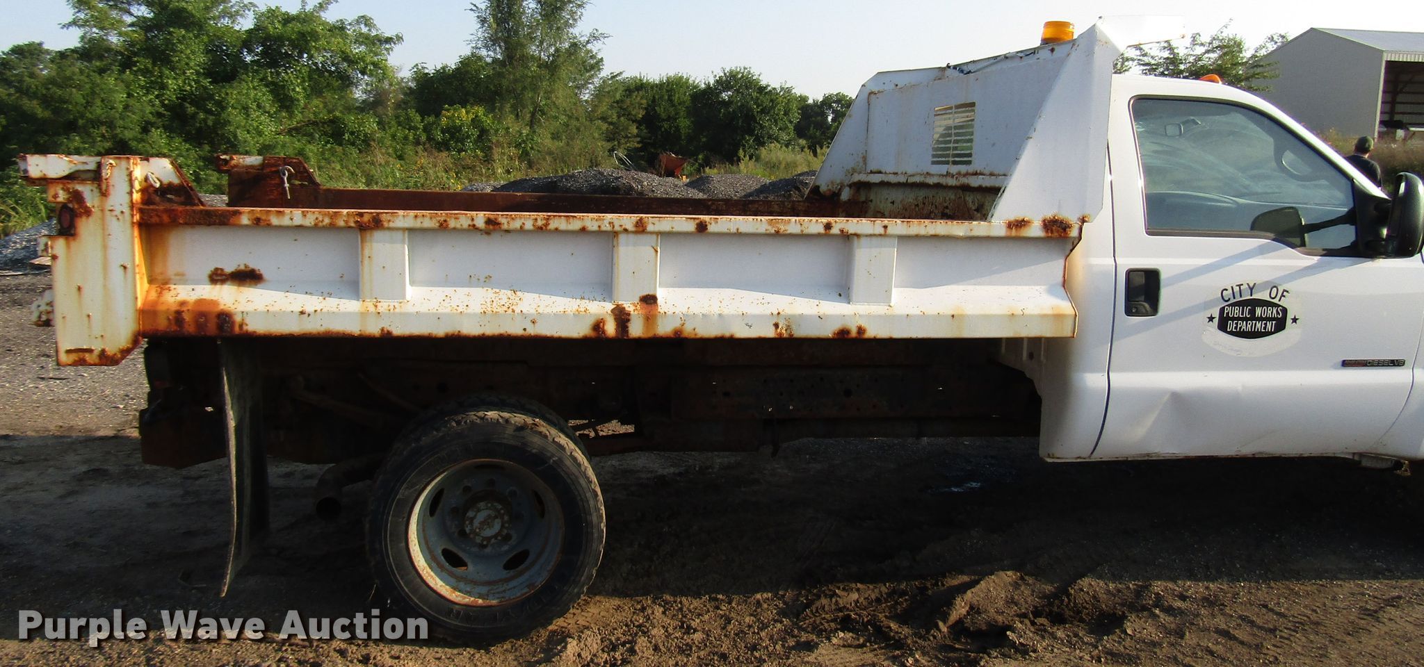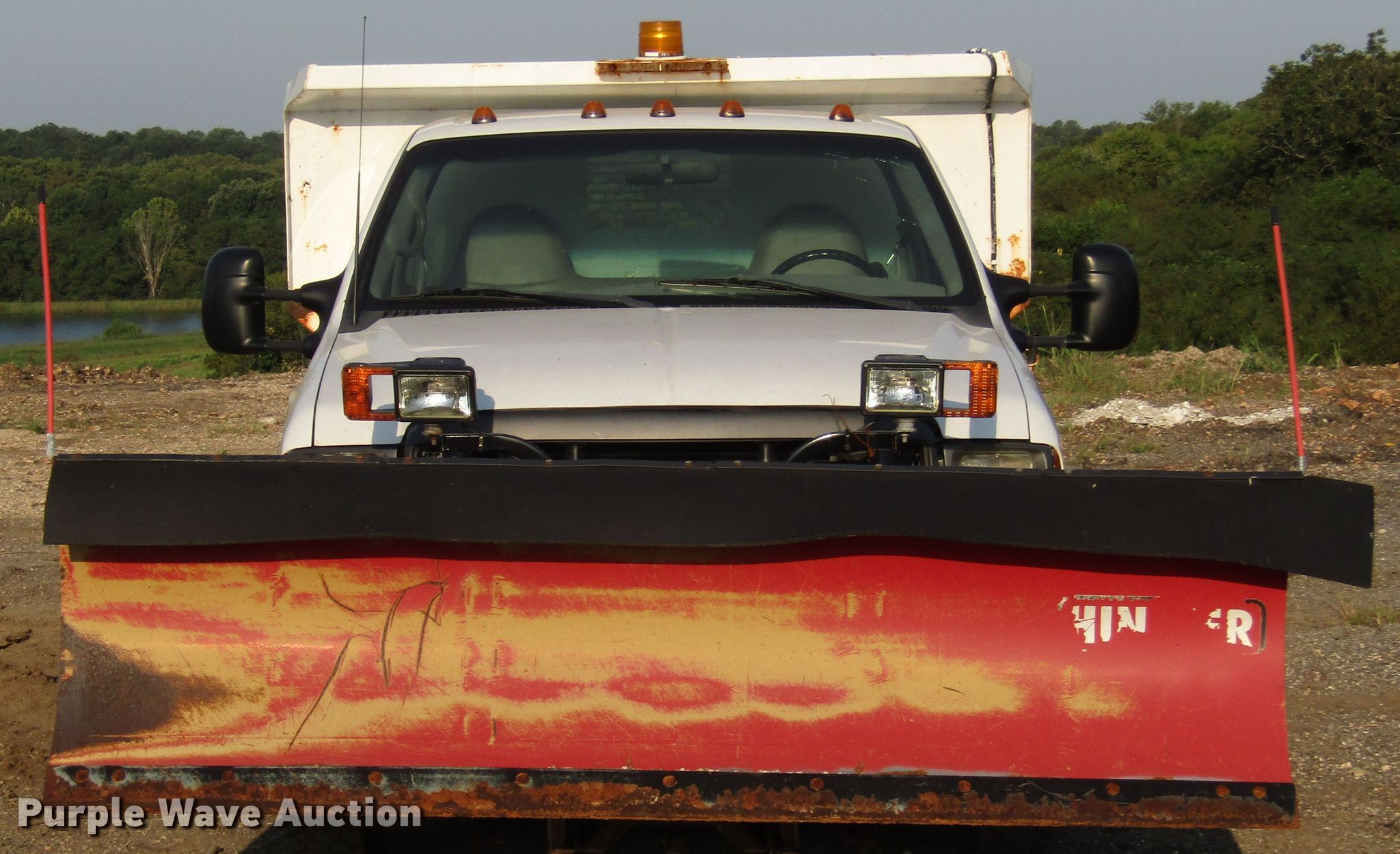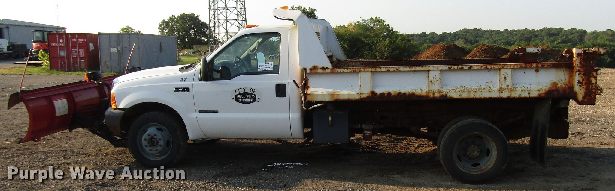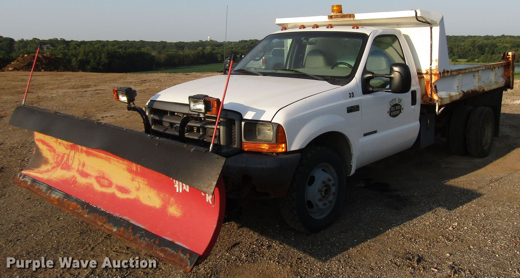 Purple Wave is selling a used Construction Dump Truck in Kansas. This item is a 1999 Ford F450 Super Duty dump truck with the following: 46,510 miles on odometer, 7.3L V8 diesel engine, Automatic transmission, Four wheel drive, Single axle, AC and heat, 11'L x 94"W steel dump bed, 12" side height, Single ram hoist, Hiniker 102"W plow, Spring suspension, Hydraulic brakes, 167" wheelbase, 225/70R19.5 tires, GVWR 15,000 lbs, Cracked windshield, AC does not blow cold, Hydraulic leaks, Possible brake issues