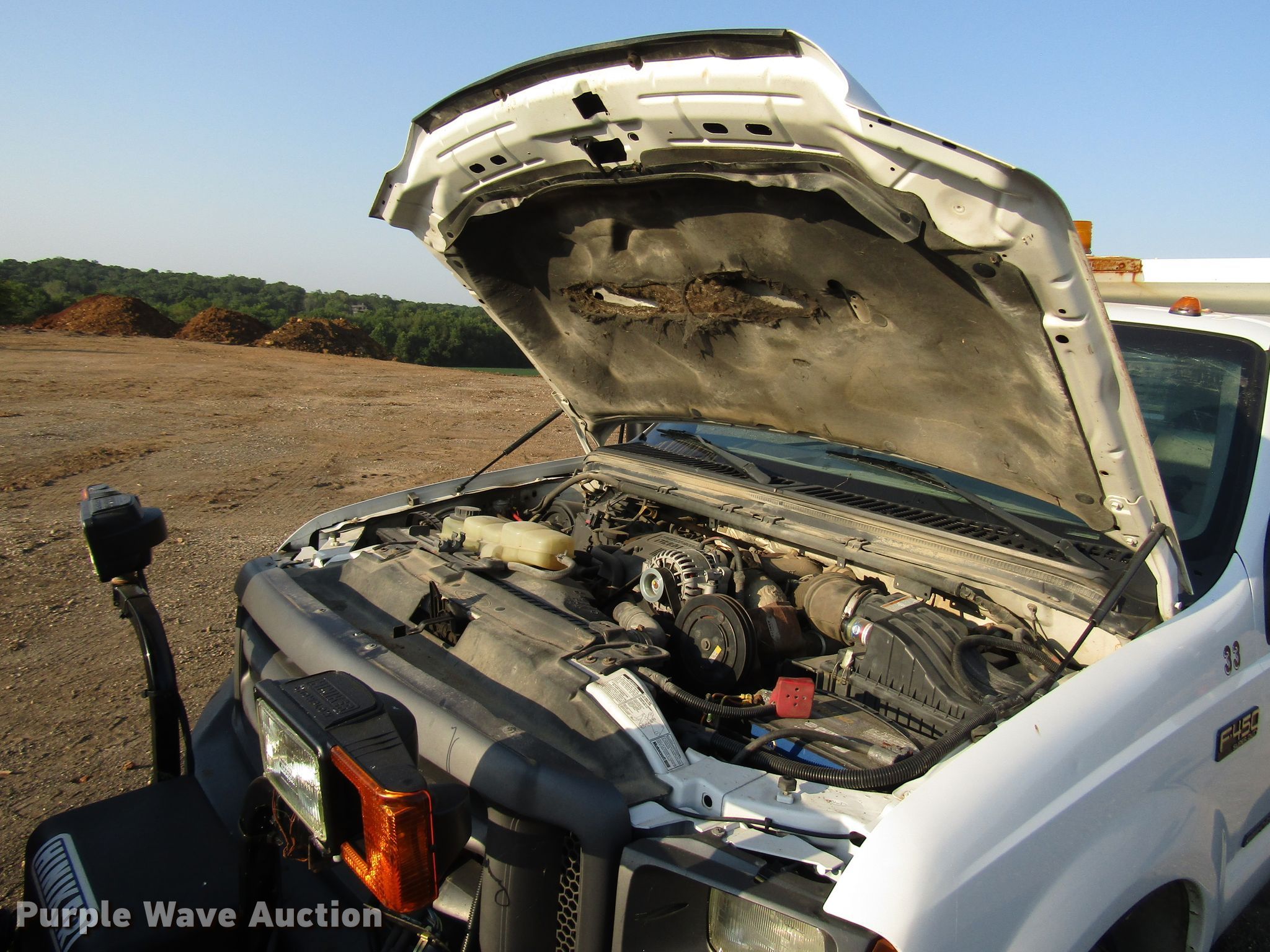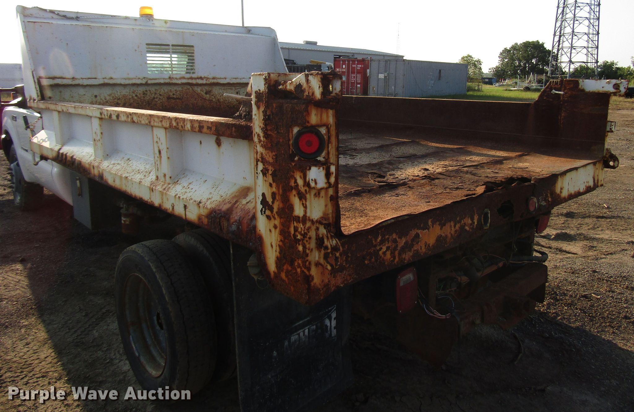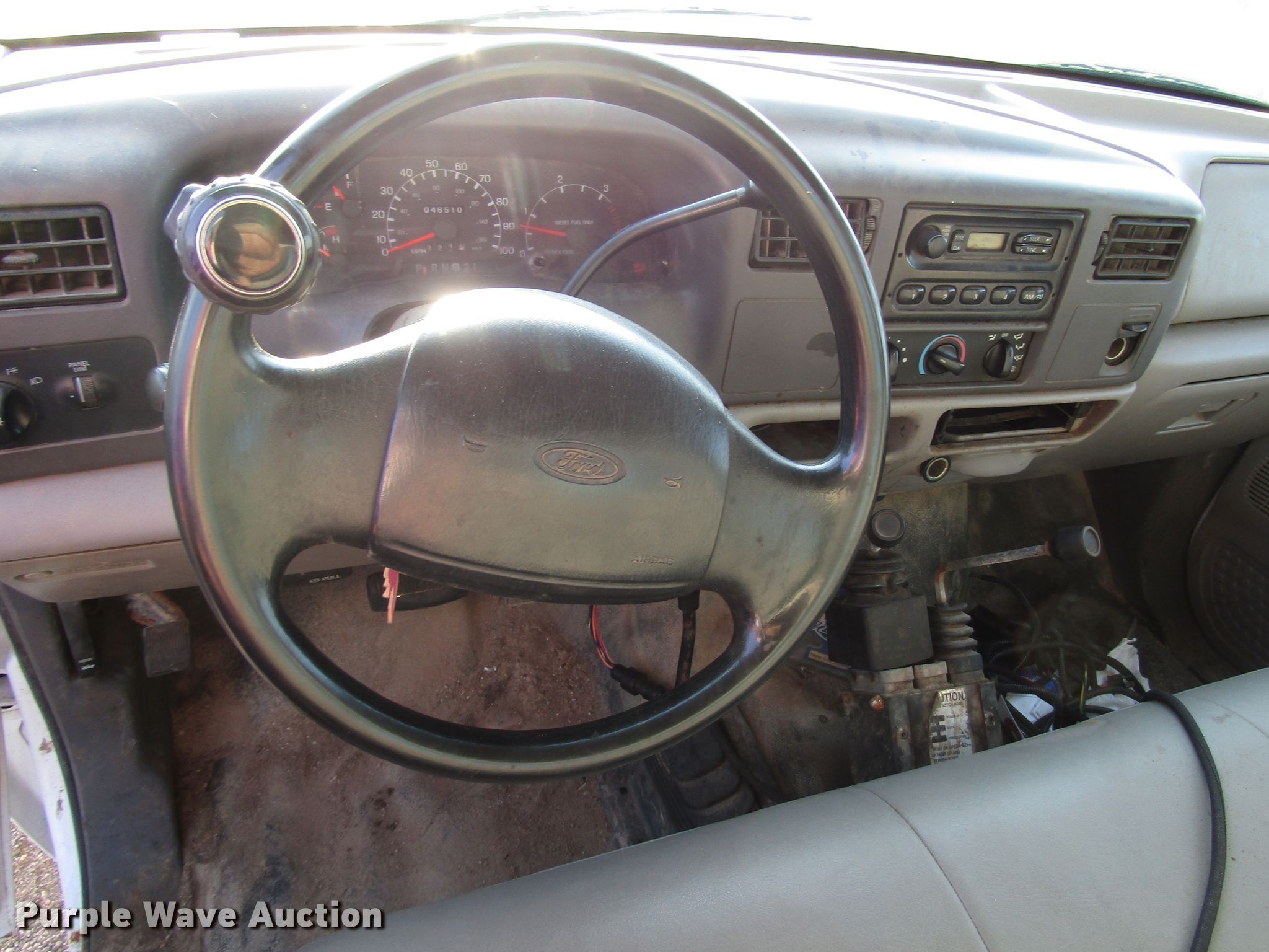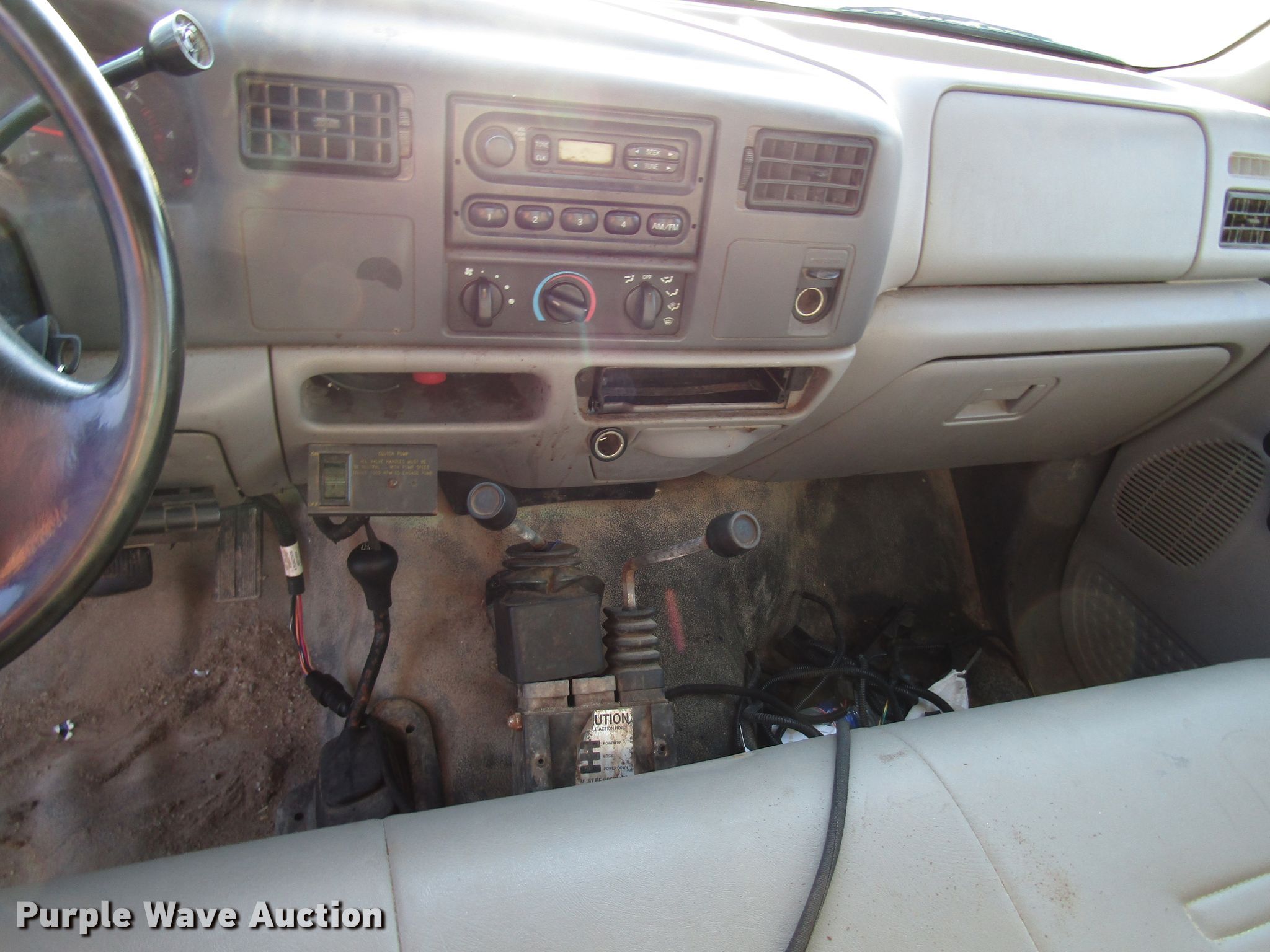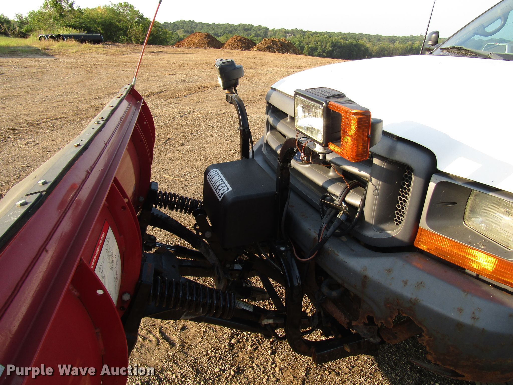Purple Wave is selling a used Construction Dump Truck in Kansas. This item is a 1999 Ford F450 Super Duty dump truck with the following: 46,510 miles on odometer, 7.3L V8 diesel engine, Automatic transmission, Four wheel drive, Single axle, AC and heat, 11'L x 94"W steel dump bed, 12" side height, Single ram hoist, Hiniker 102"W plow, Spring suspension, Hydraulic brakes, 167" wheelbase, 225/70R19.5 tires, GVWR 15,000 lbs, Cracked windshield, AC does not blow cold, Hydraulic leaks, Possible brake issues