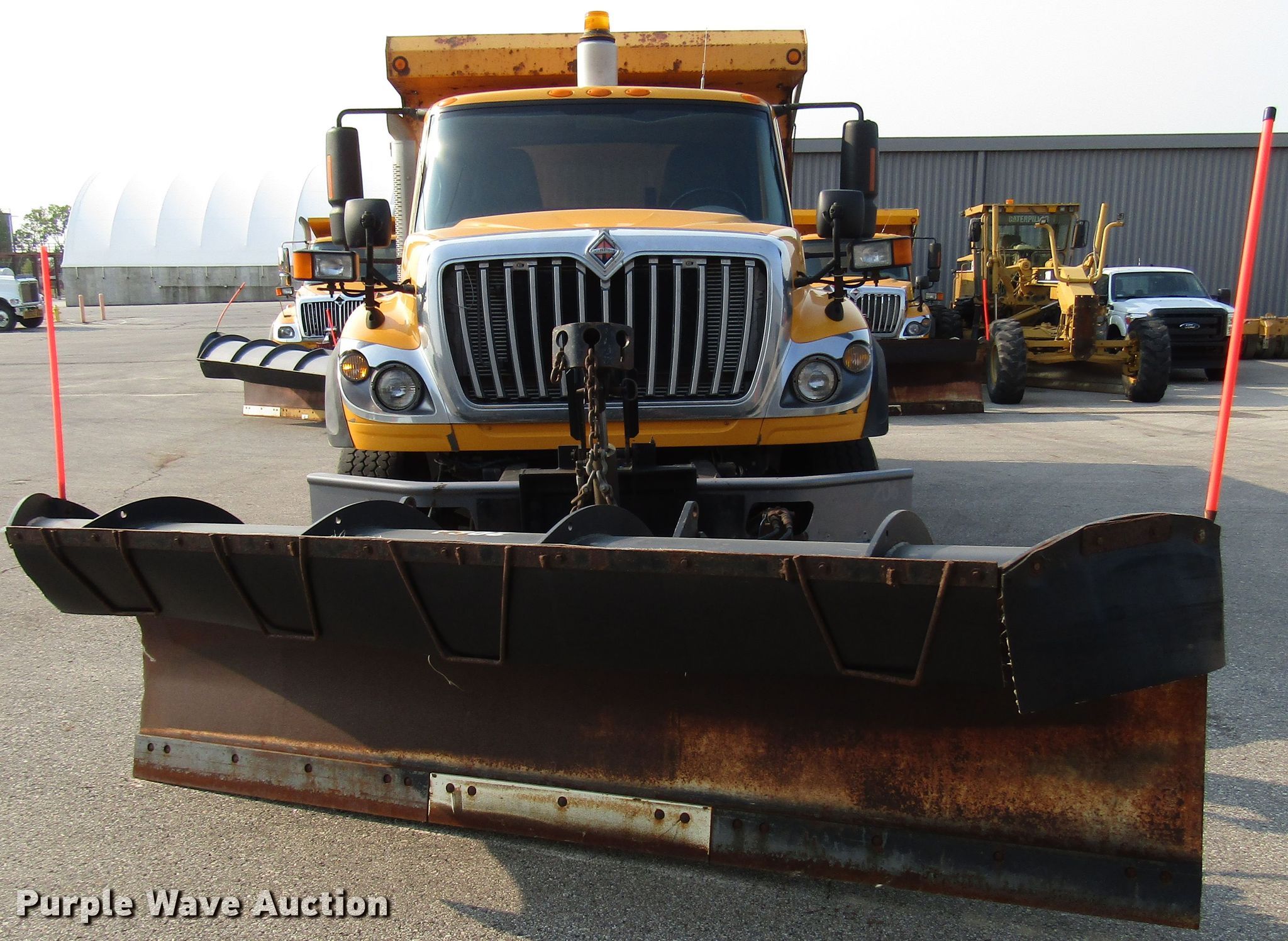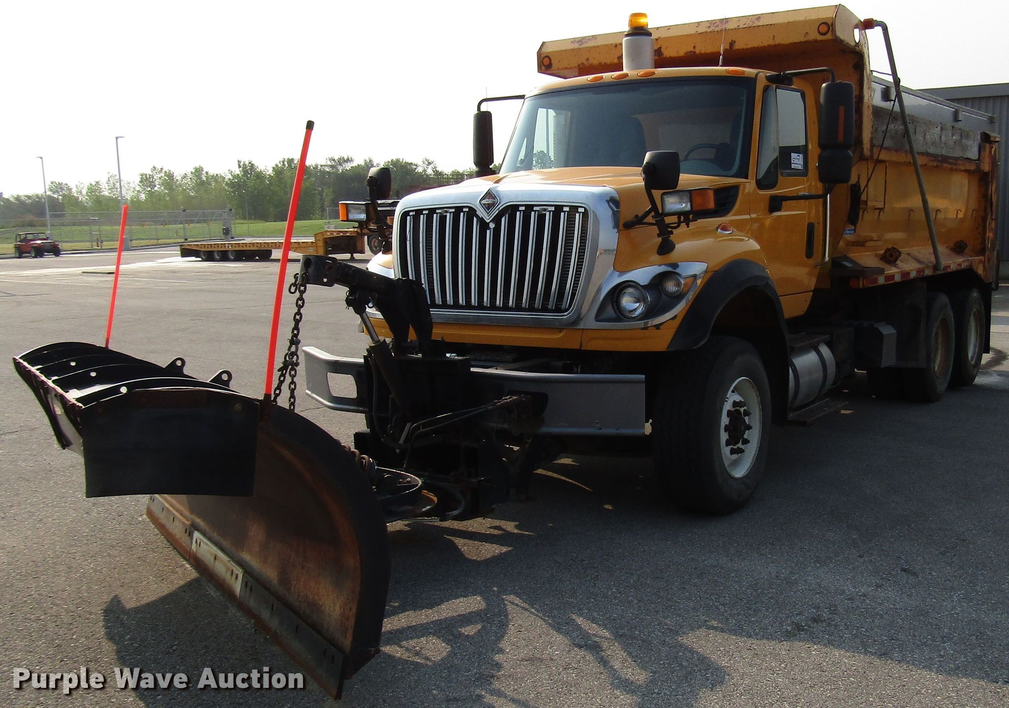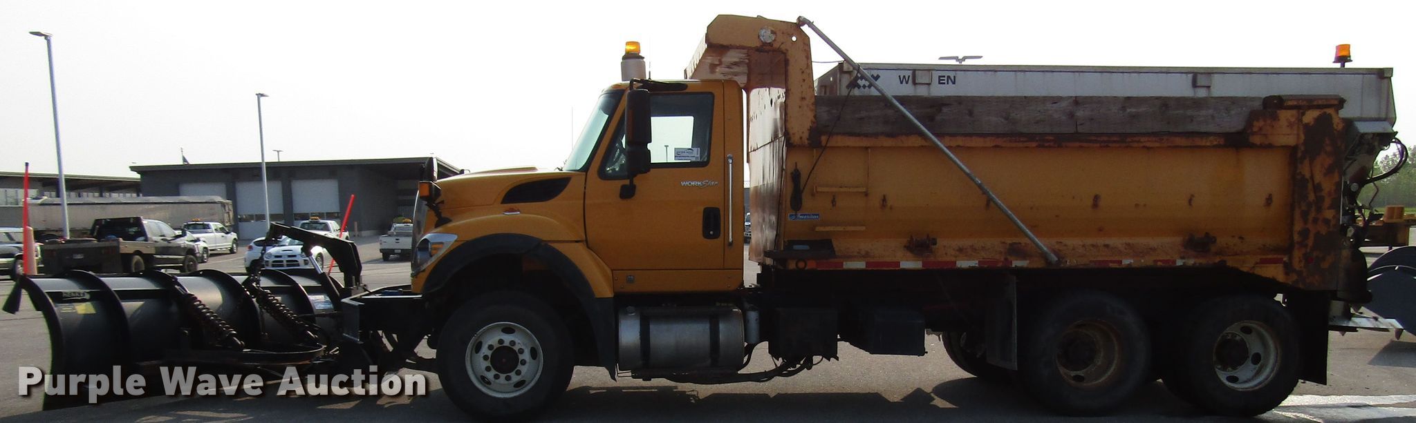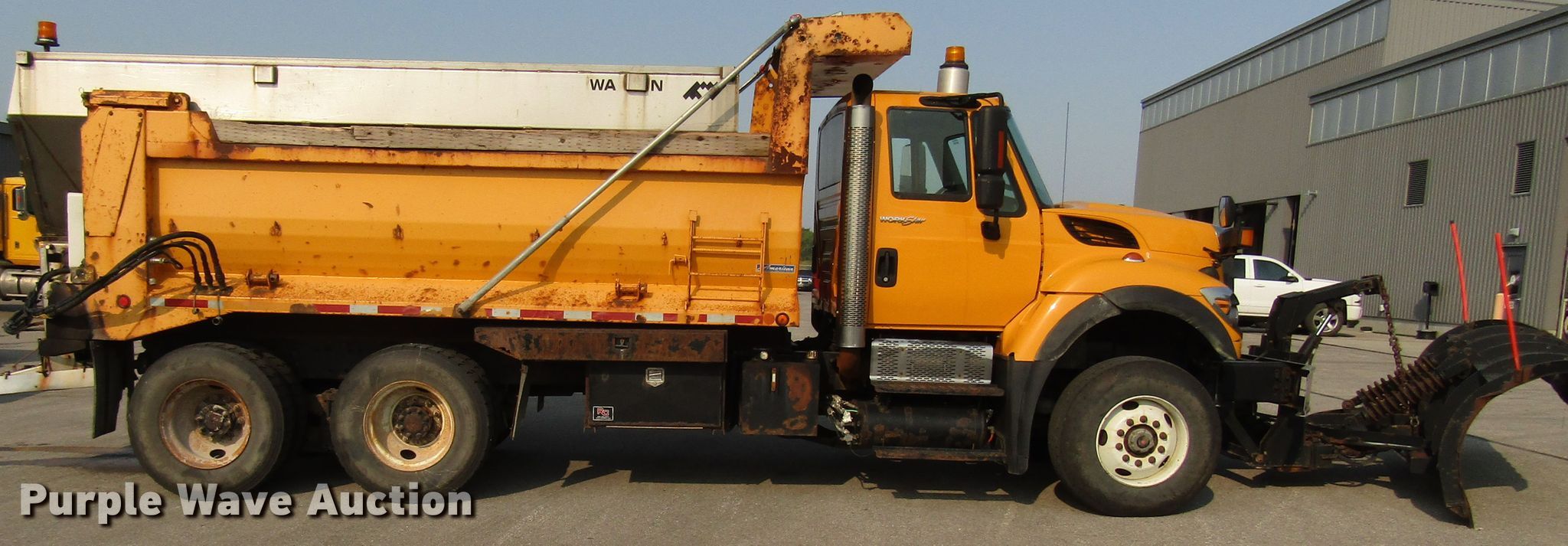 Purple Wave is selling a used Construction Dump Truck in Kansas. This item is a 2008 International 7600 dump truck with the following: 179,143 miles on odometer, 7,634 hours on meter, Caterpillar C13 12.5L L6 diesel engine, Automatic transmission, Tandem axle, Inter-axle differential lock, AC and heat, Front mounted PTO, Warren steel dump bed, 15'L x 96"W, 42" side height, 12" side board height, Single ram hoist, Manual operated end gate, Roll tarp, Warren spreader, Henke 11'W snow plow, Double frame, Spring suspension, Air brakes, 385/65R22.5 front tires, 11R22.5 rear tires, GVWR 58,000 lbs, FAWR 18,000 lbs, IAWR 20,000 lbs, RAWR 20,000 lbs