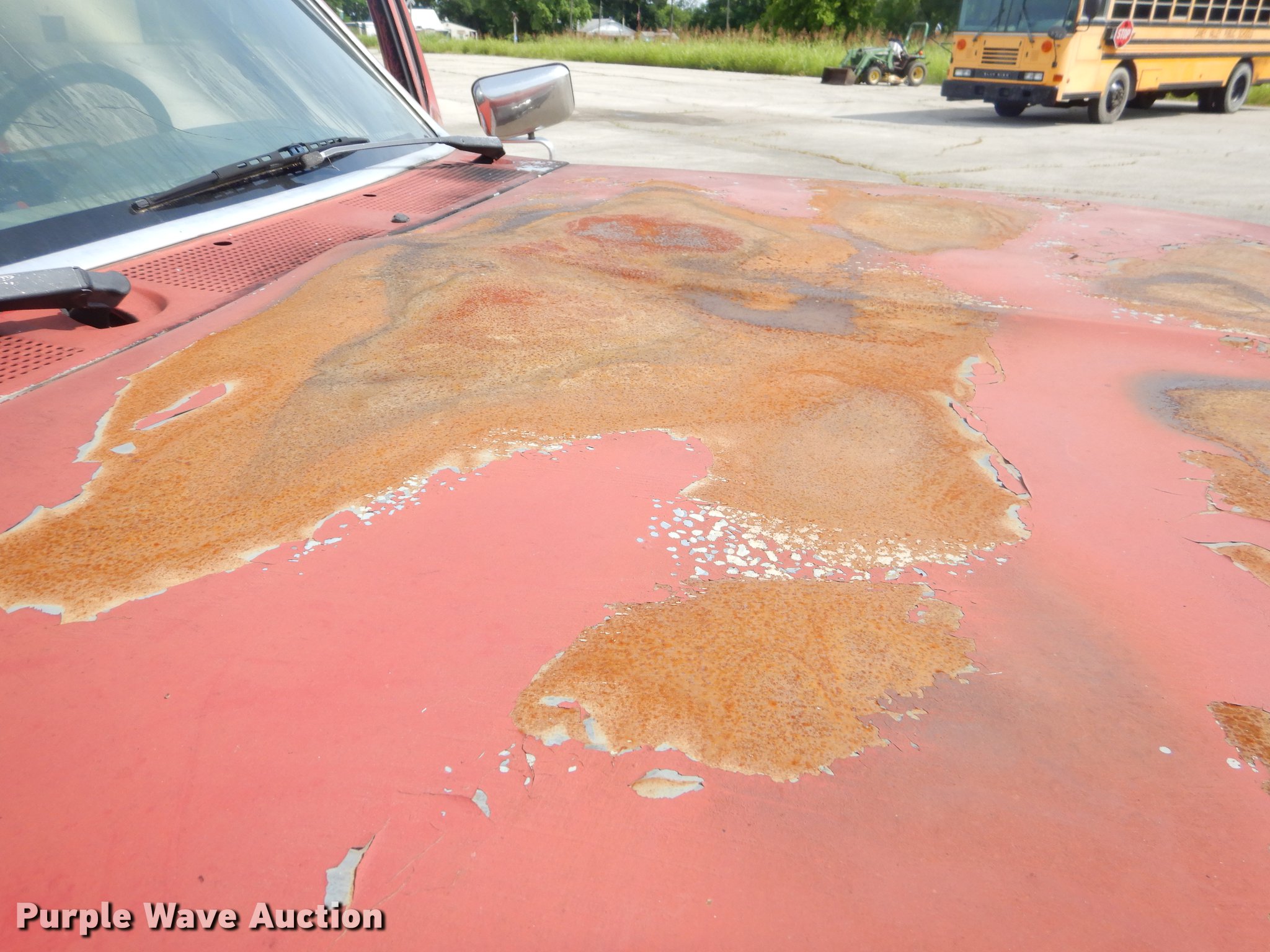 1990 Ford F150 pickup truck. 25,518 miles on odometer, 5.0L V8 OHV 16V gas engine, Five speed manual transmission, Four wheel drive, AC and heat, Cruise, 31x10.50R15 tires, Cracked windshield, Engine fire damage, Non-operational unit. Oklahoma classic title. 1FTEF14N9LNA77831. Caney Valley School District. 620 Wyandotte Ave. Ramona, OK 74061