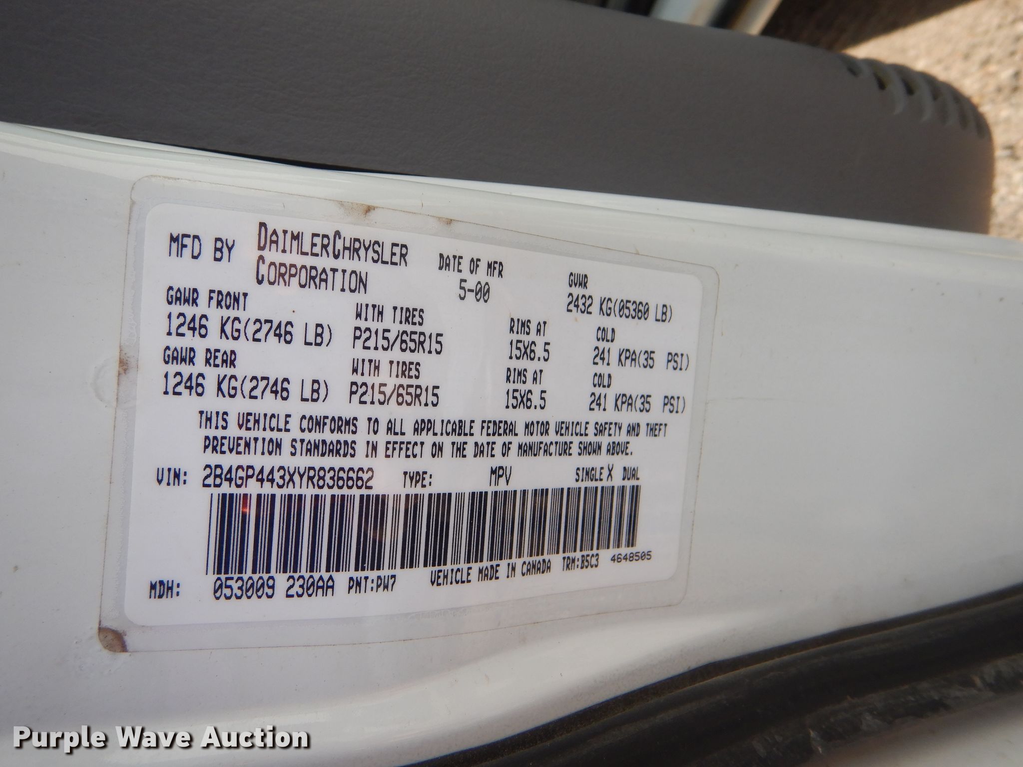 Purple Wave is selling a used Passenger Vehicle in Kansas. This item is a 2000 Dodge Caravan mini van with the following: 211,792 miles on odometer, 3.0L V6 OHV 12V FFV gas engine, Automatic transmission, AC and heat, Cruise, Power windows and locks, 215/65R15 tires