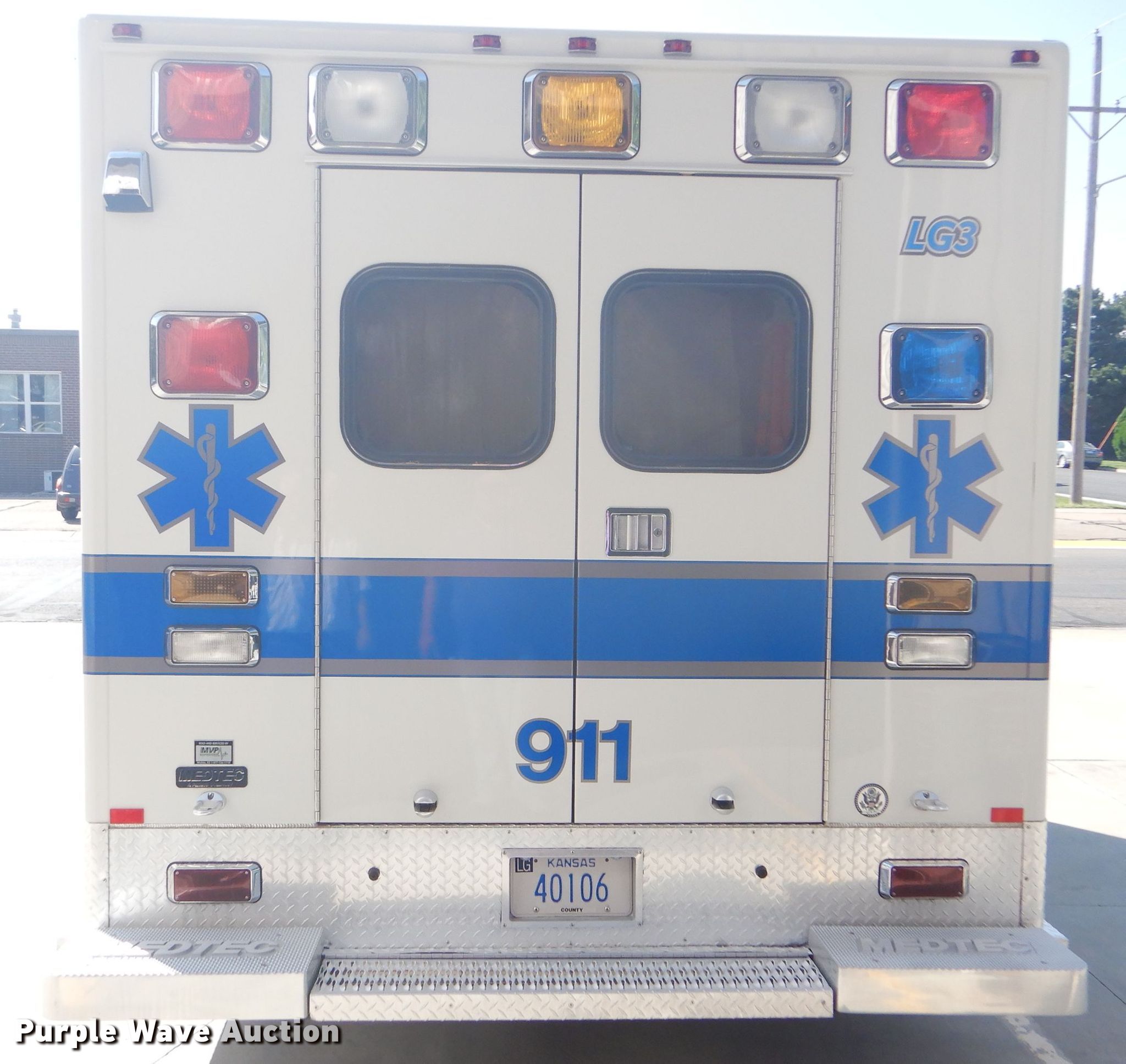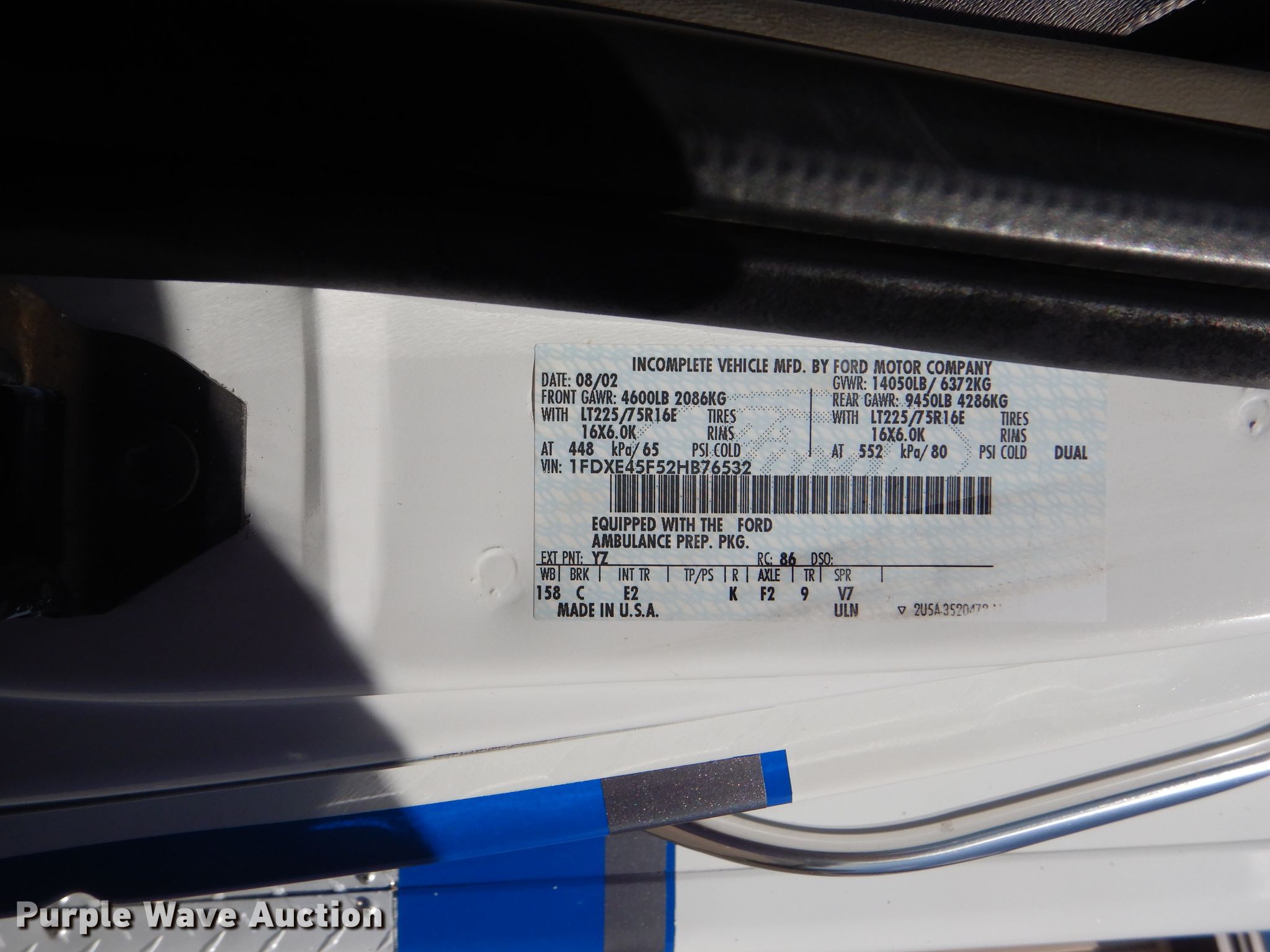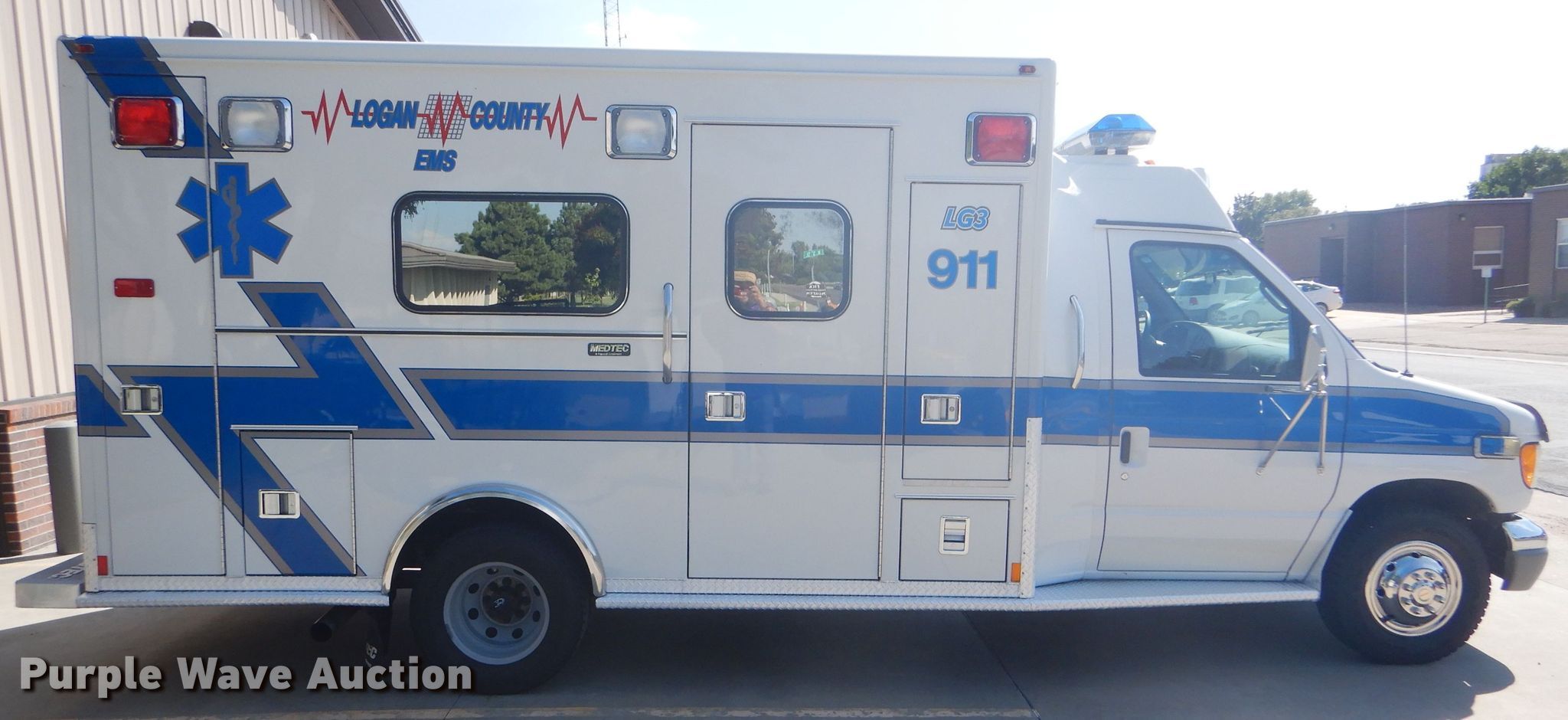 Purple Wave is selling a used Fire Truck or Emergency Vehicle in Kansas. This item is a 2002 Ford E450 ambulance with the following: 91,215 miles on odometer, 2,853 hours on meter, 7.3L V8 OHV 16V diesel engine, 250 HP, Automatic transmission, Single axle, AC and heat, Power windows and locks, Auxiliary controls, Medtec PD-156 body, PA/Siren controls, Oxygen hookups, 110V power inverter, Spring suspension, Hydraulic brakes, 225/75R16 tires, GVWR 14,050 lbs