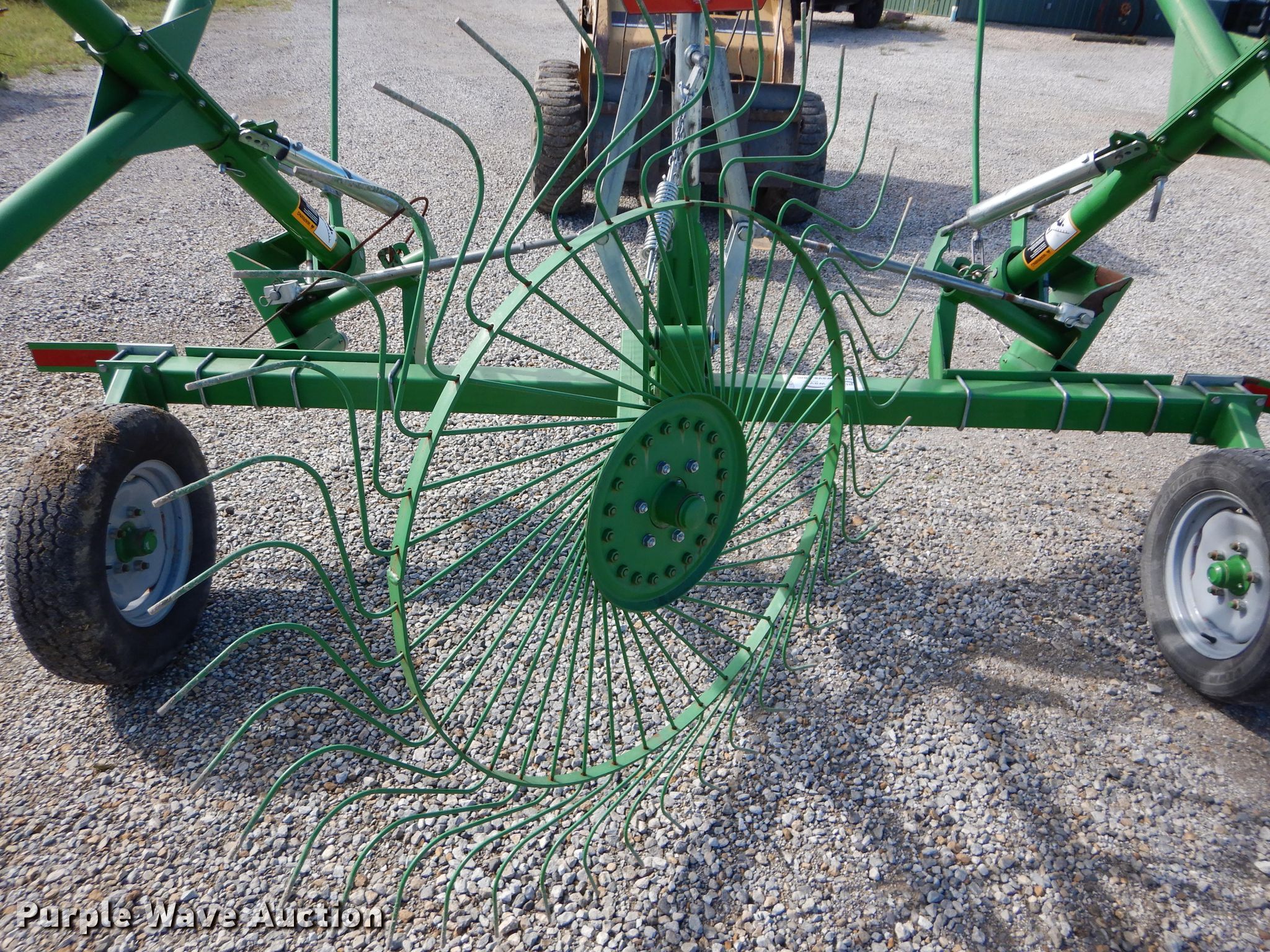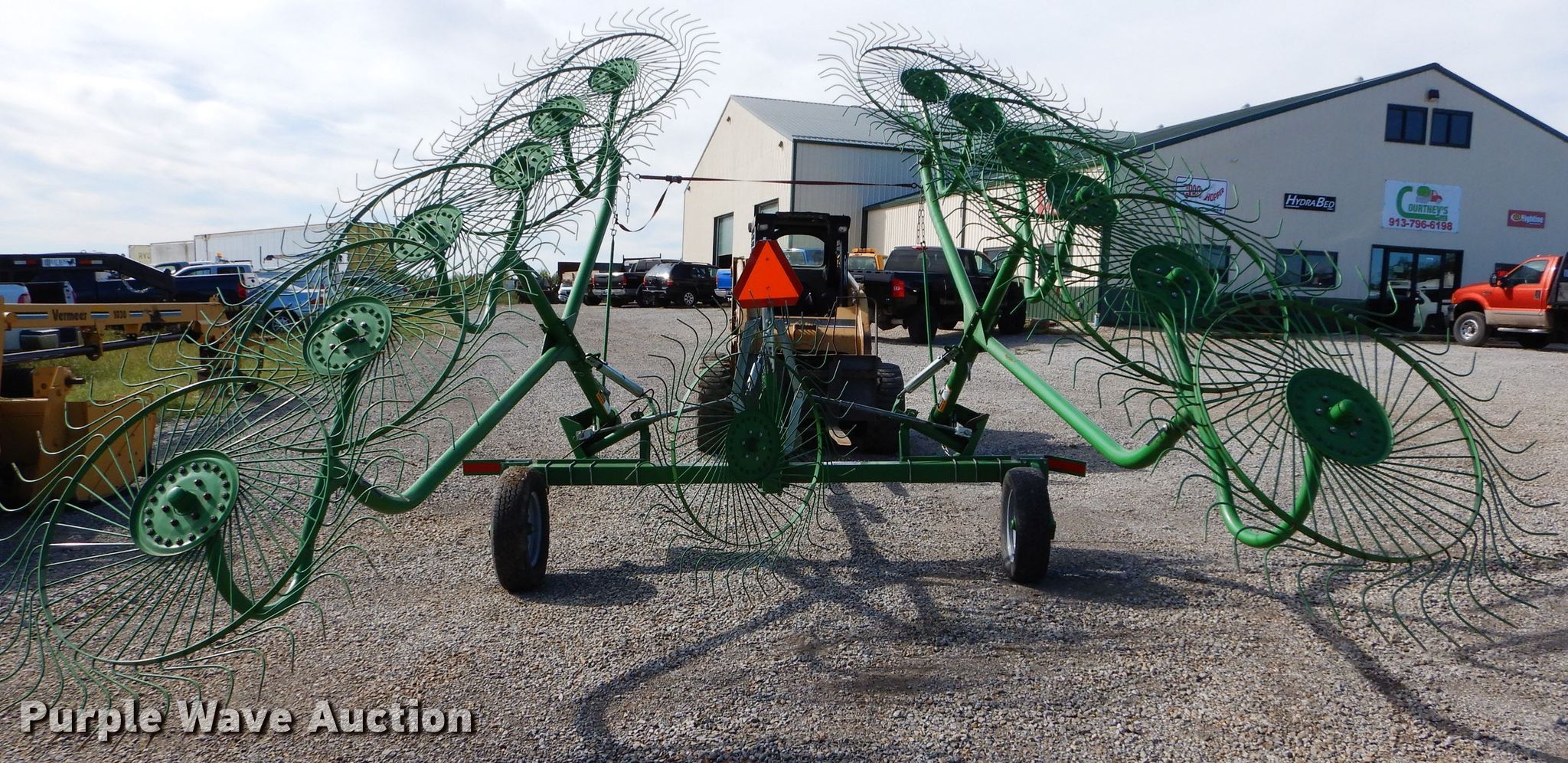 Purple Wave is selling a used Hay Rake in Kansas. This item is a Frontier WR1012 hay rake with the following: (12) 56" diameter wheels, Center windrow wheel, Hydraulic fold, 185/65R14 tires, Transport pin on left side missing, Serial XPWR10X001133