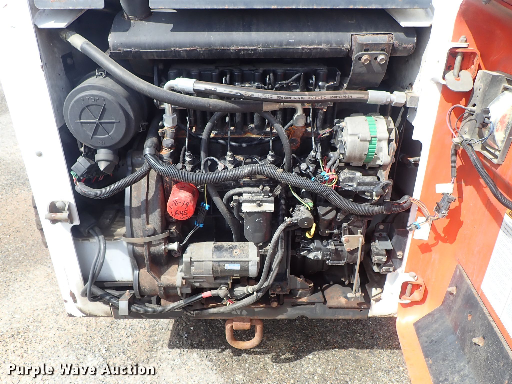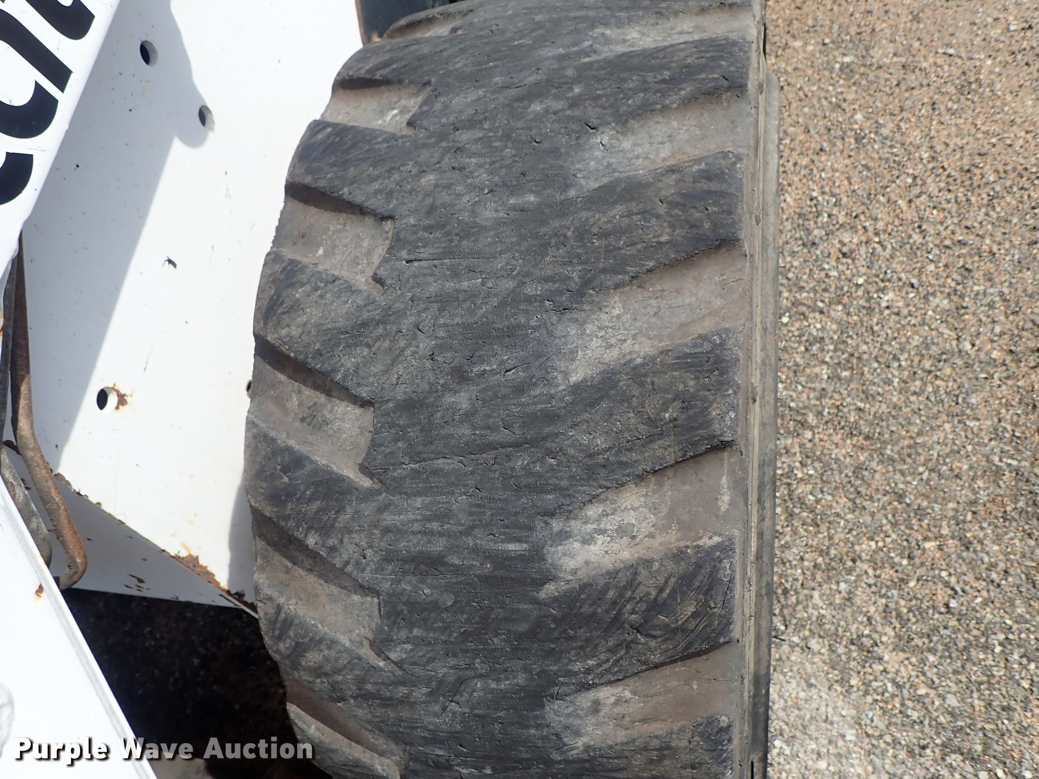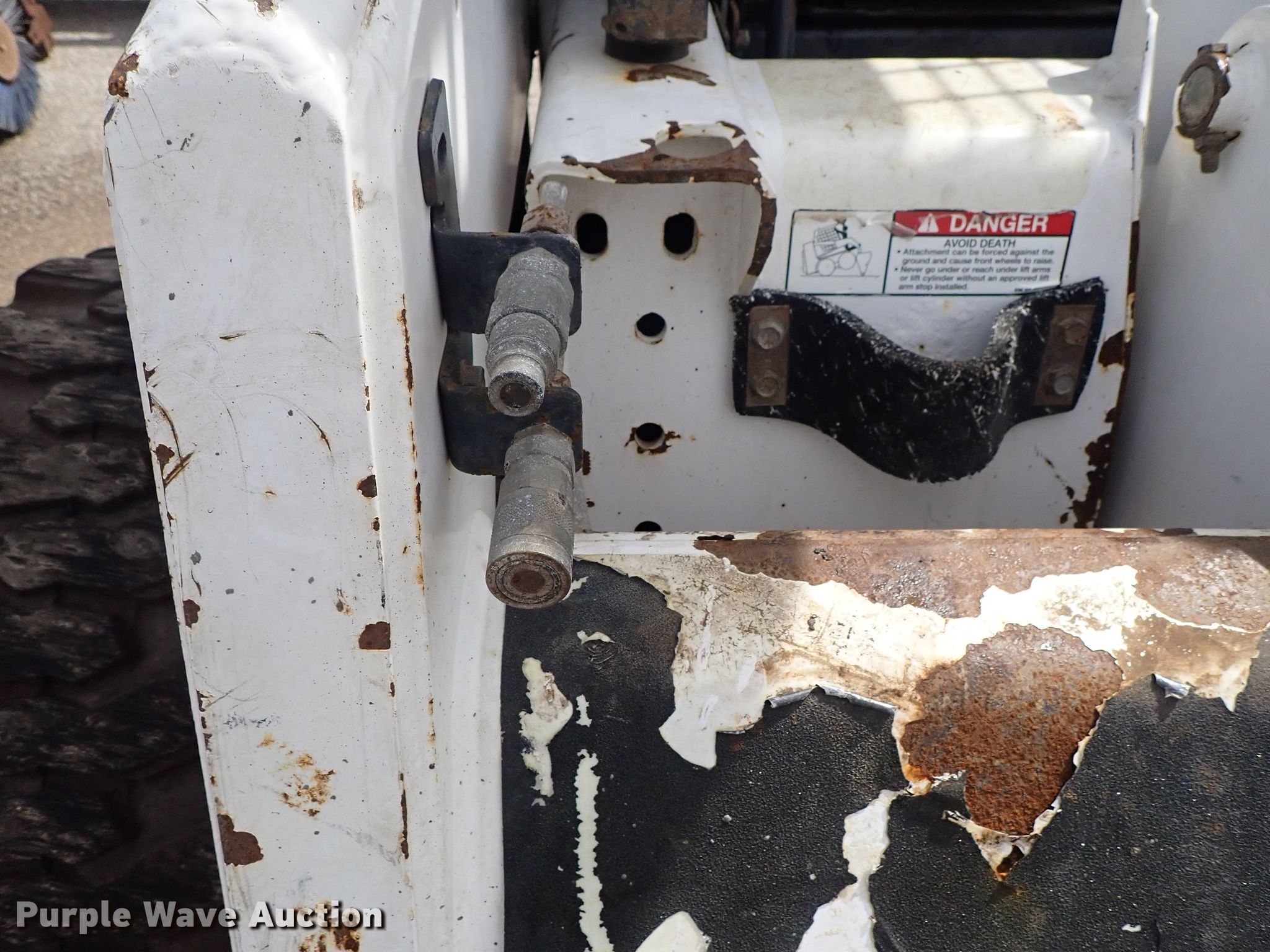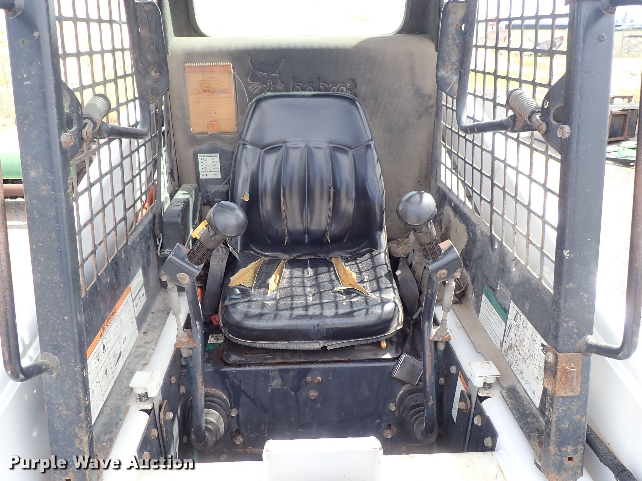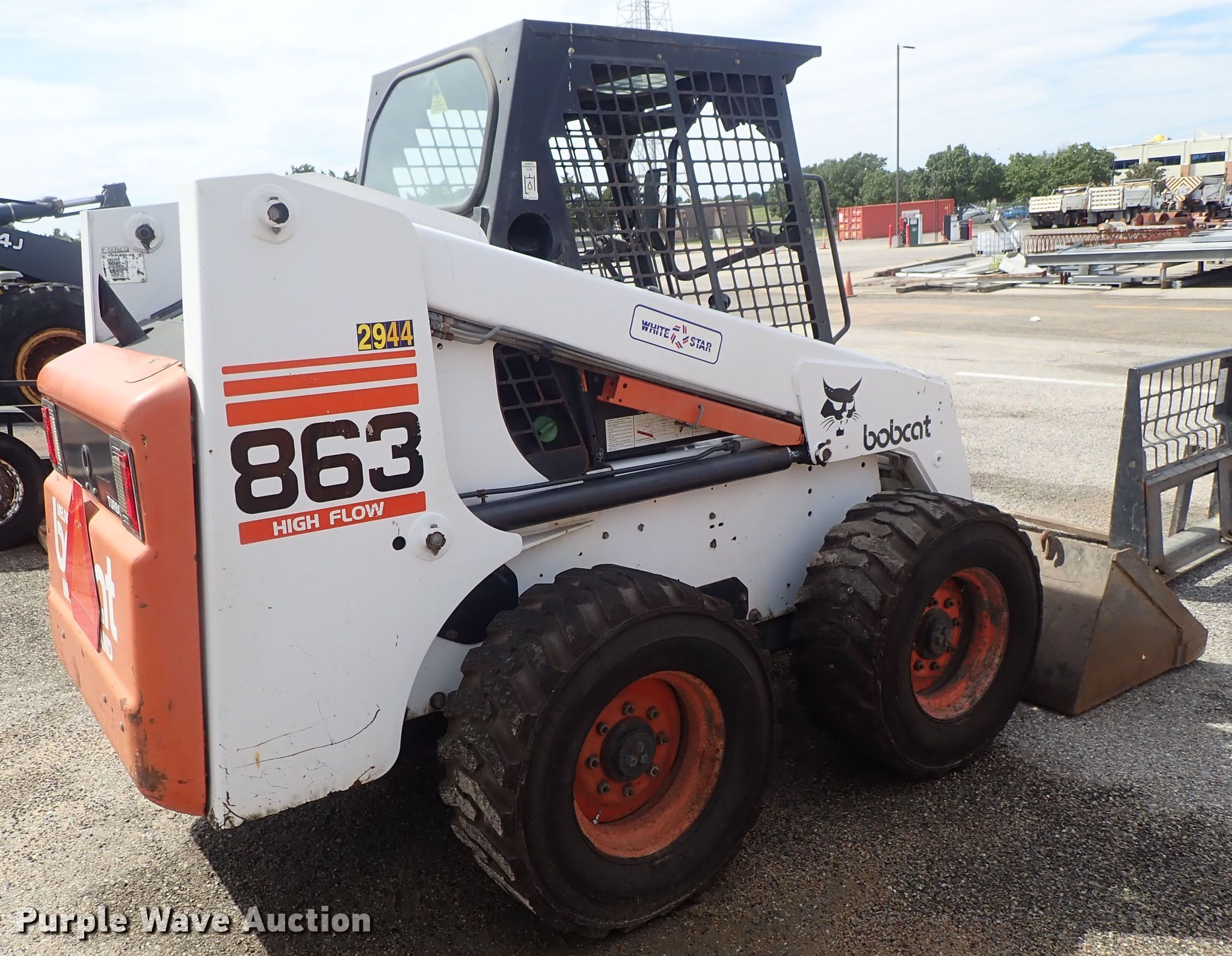 Purple Wave is selling a used Skid Steer Loader in Kansas. This item is a 1998 Bobcat 863 skid steer with the following: 1,690 hours on meter, Four cylinder diesel engine, Hydrostatic transmission, Hand bucket controls, 72"W bucket, Bolt-on cutting edge, Pallet forks, Manual quick coupler, Auxiliary hydraulics, 12-16.5 tires, Lift cylinder hydraulic leak, Serial 514418858