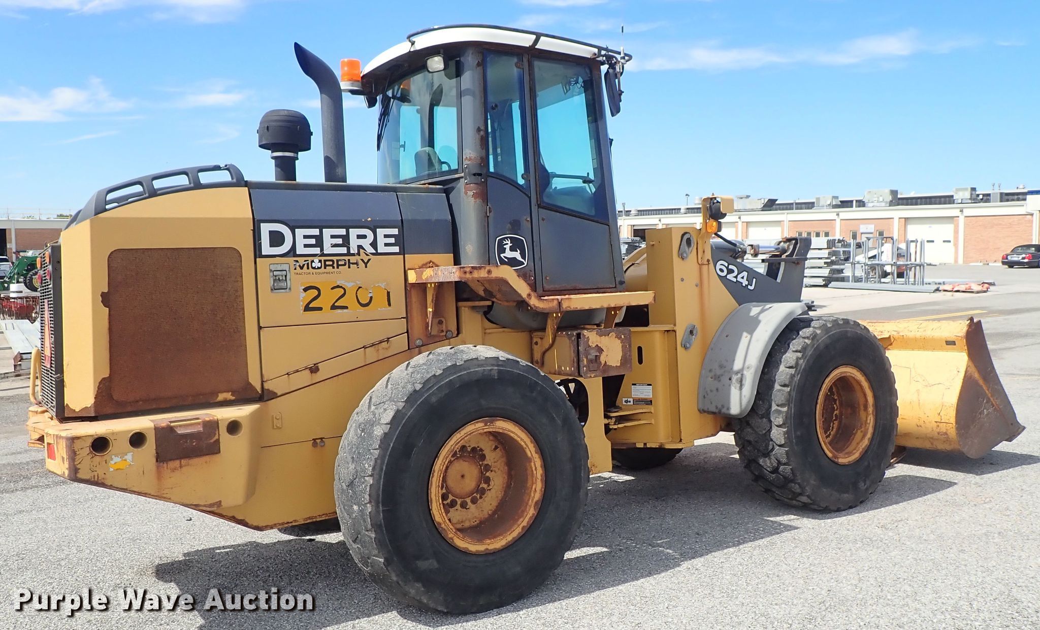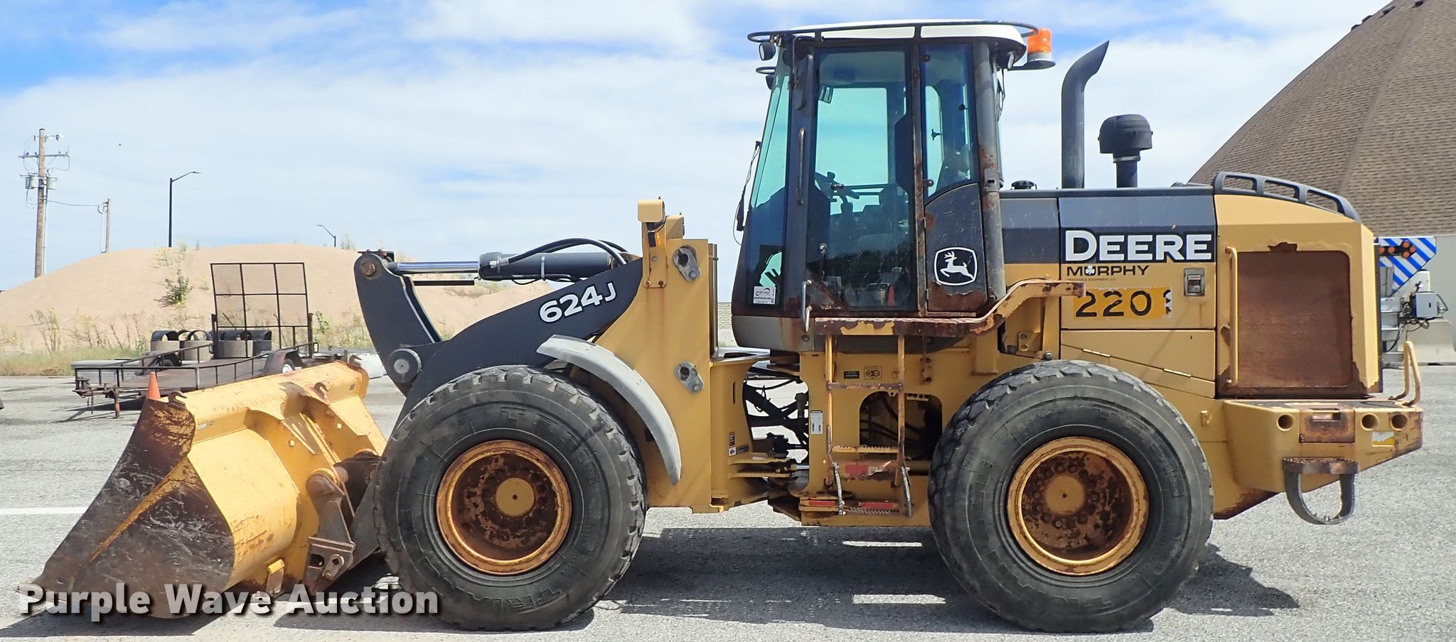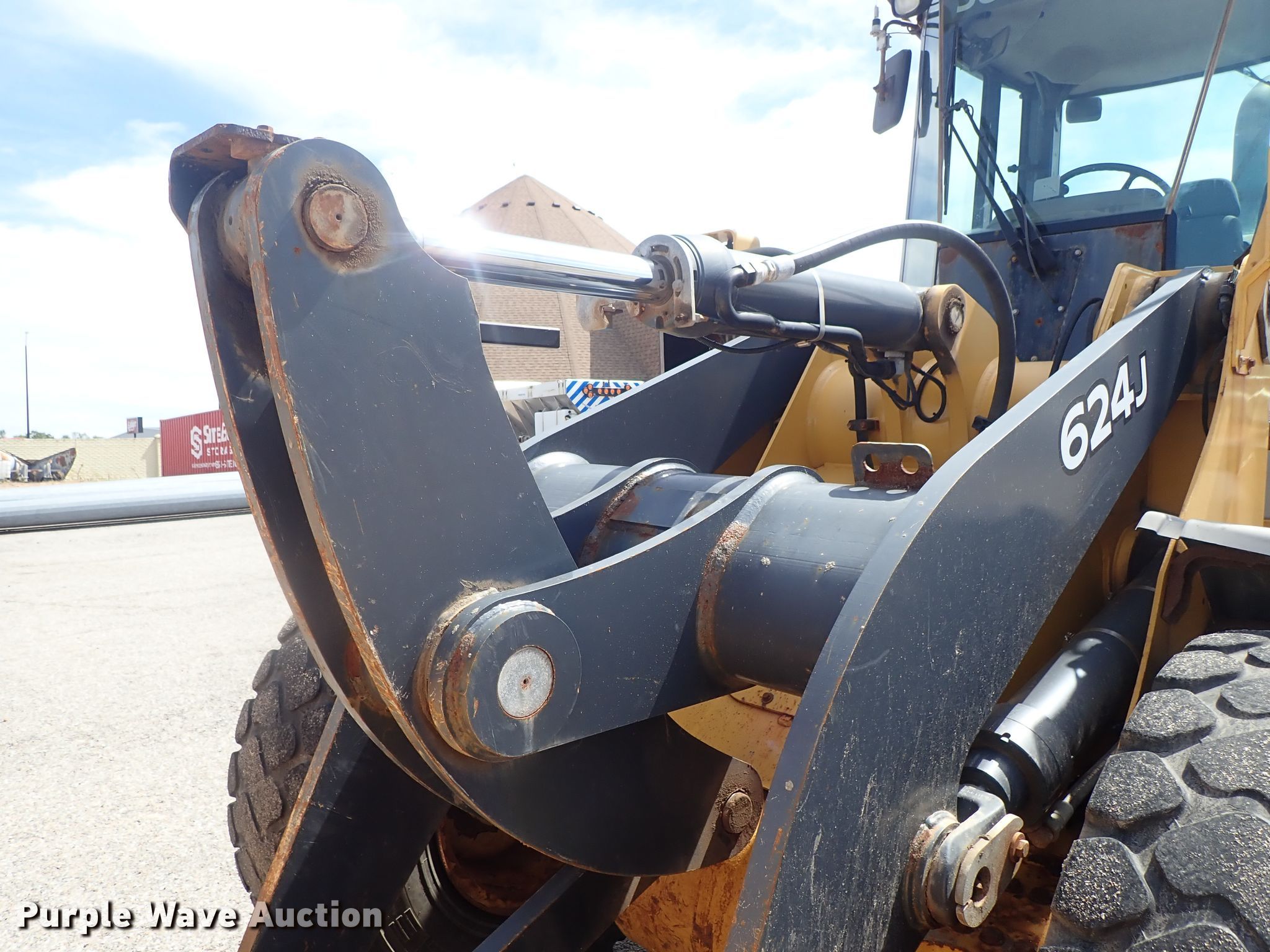 Purple Wave is selling a used Wheel Loader in Kansas. This item is a 2005 John Deere 624J wheel loader with the following: 7,037 hours on meter, John Deere six cylinder diesel engine, Powershift transmission, 4F-4R gears, Enclosed cab, AC and heat, Joystick bucket controls, 104"W general purpose bucket, Bolt-on cutting edge, Pallet forks, 20.5R25 tires, Serial DW624JZ596003, Unit# 2201