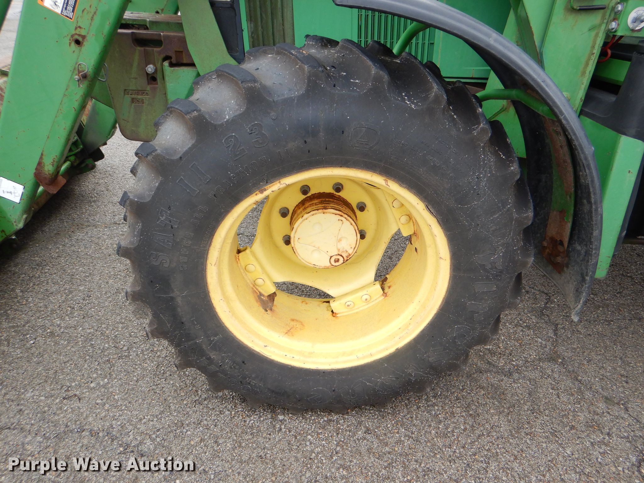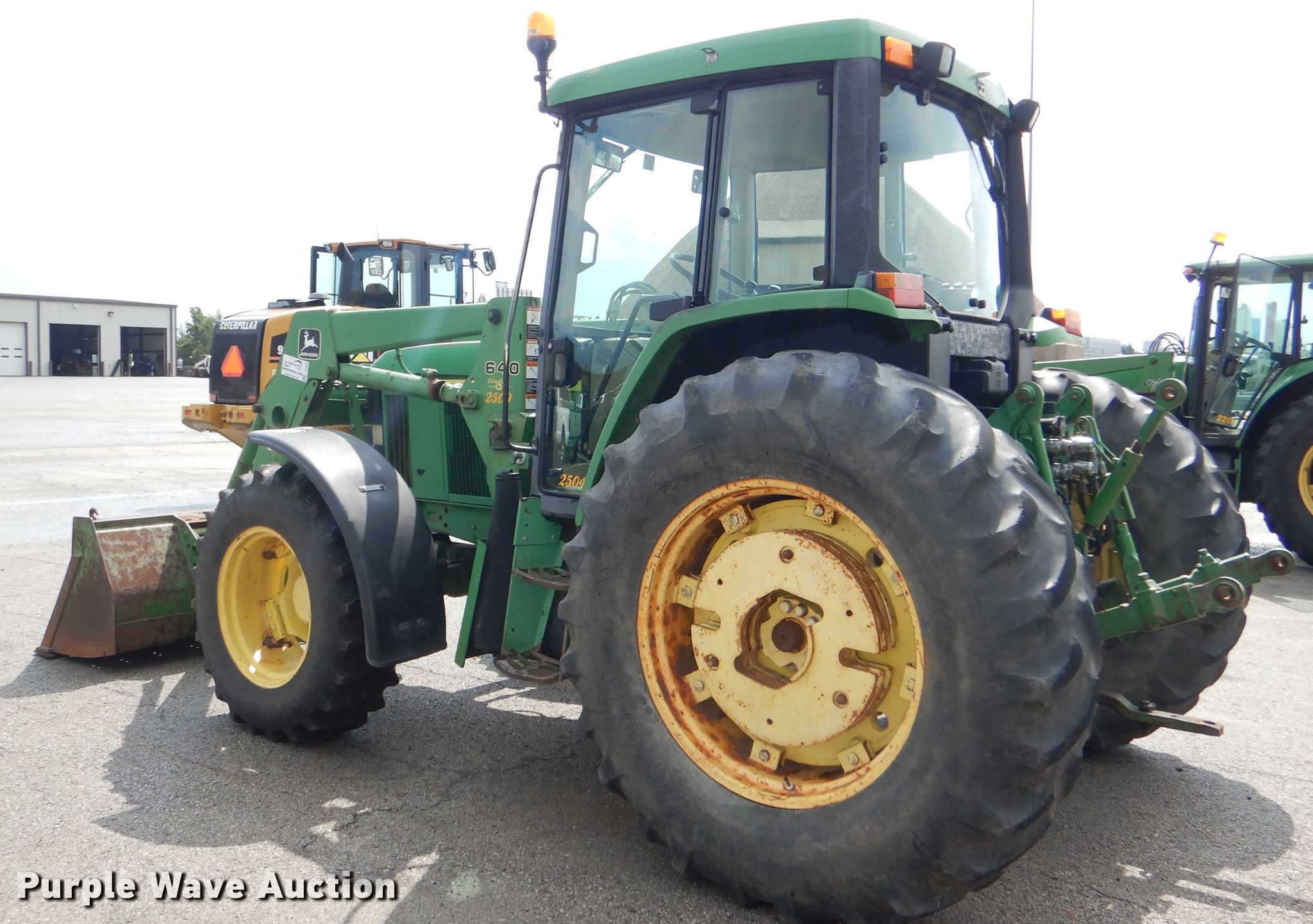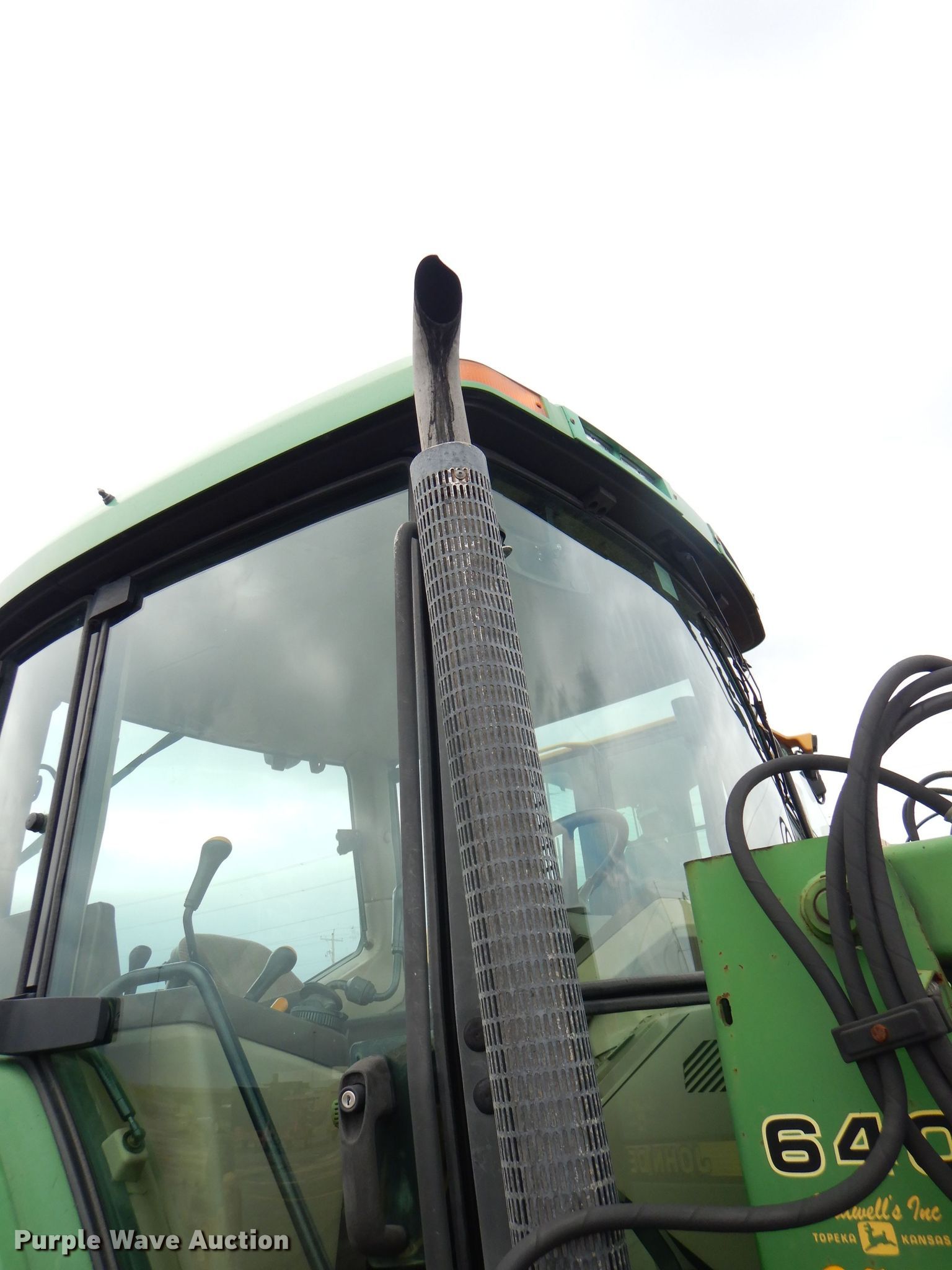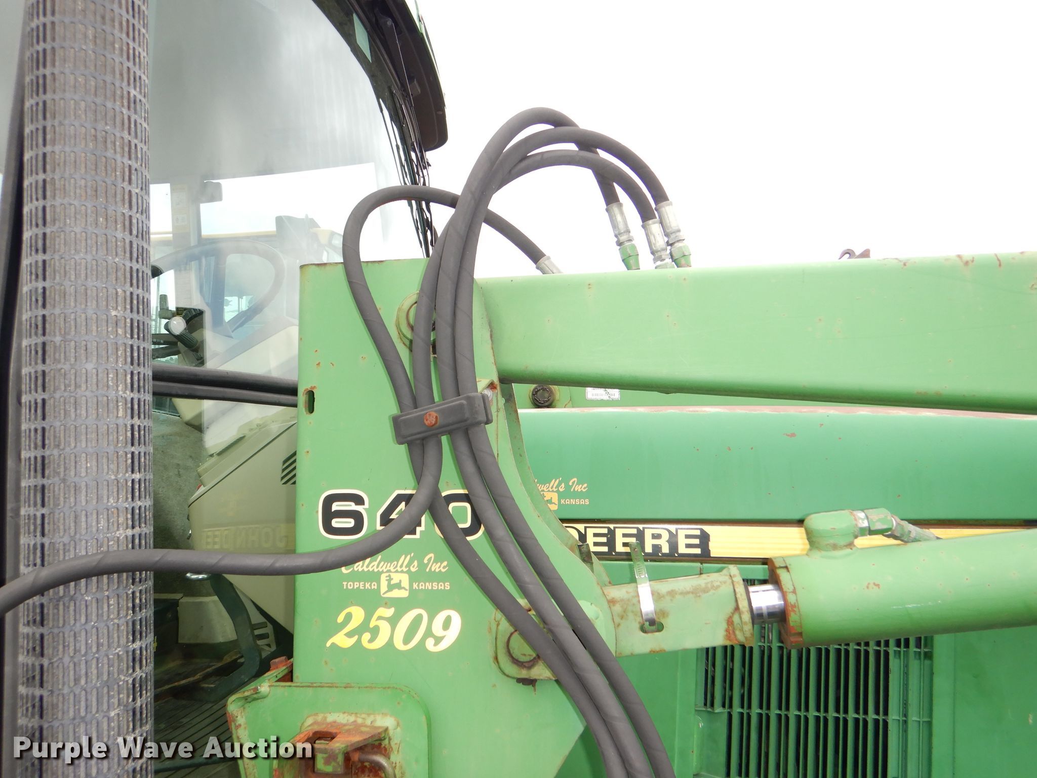 Purple Wave is selling a used Tractor in Kansas. This item is a 1999 John Deere 6310 MFWD tractor with the following: 4,276 hours on meter, 1,017 hours on second hour meter, John Deere four cylinder diesel engine, Synchro transmission, 12F-4R gears, AC and heat, John Deere 640 loader, 86"W bucket, Quick attach, Joystick controls, Three point, Top link, 540/1000 PTO, (3) rear hydraulic remotes, (12) suitcase weights, (12) wheel weights, 13.6-24 front tires, 18.4-34 rear tires, Maintenance records available upon request, Serial L06310M248317, Unit# 2504