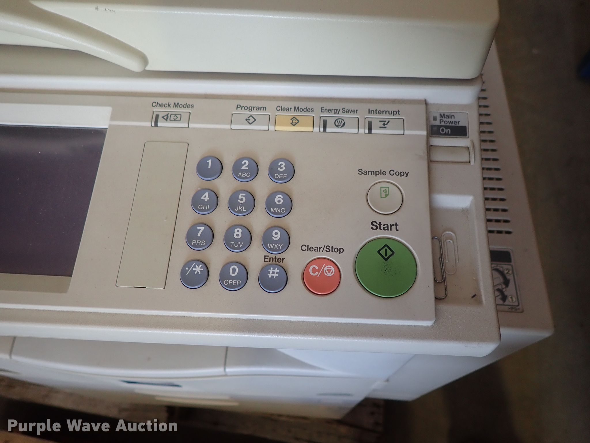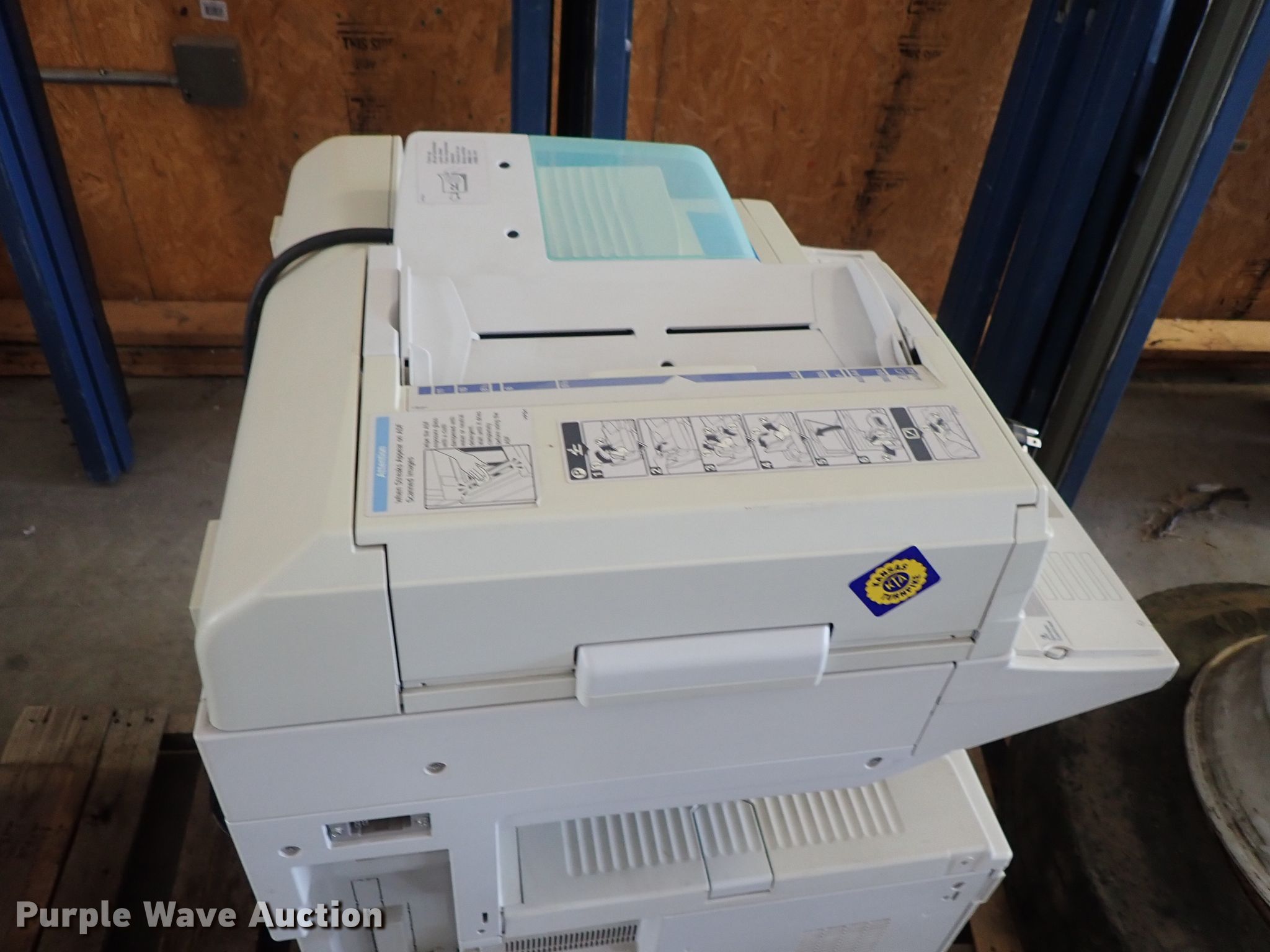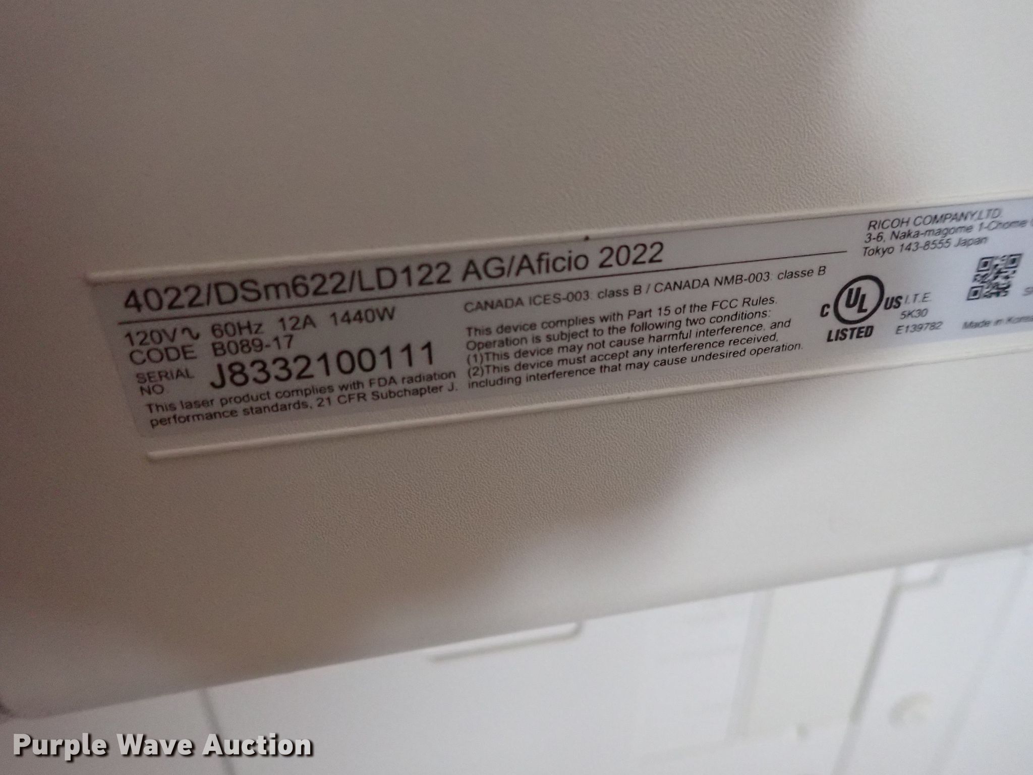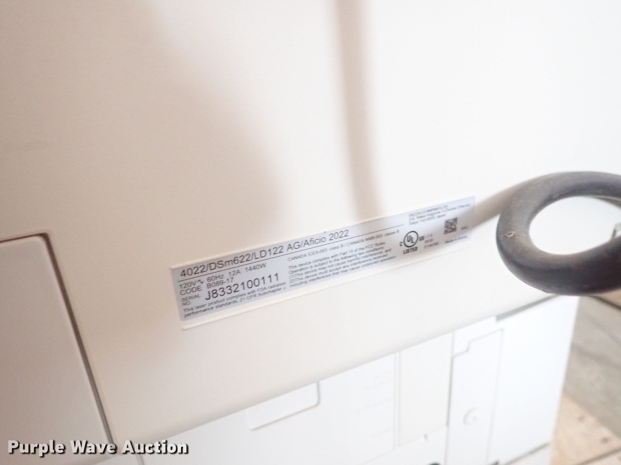 Purple Wave is selling a used Copy or Printing Machine in Kansas. This item is a Ricoh Aficio 2022 copy machine with the following: 120V, Serial J8332100111