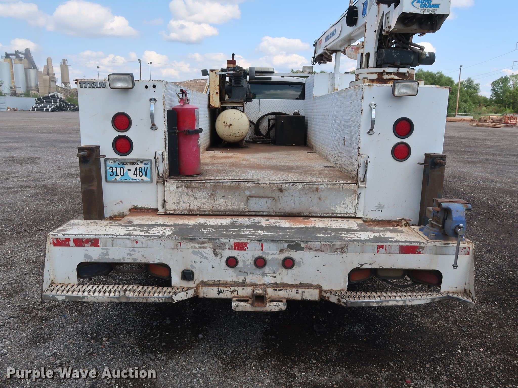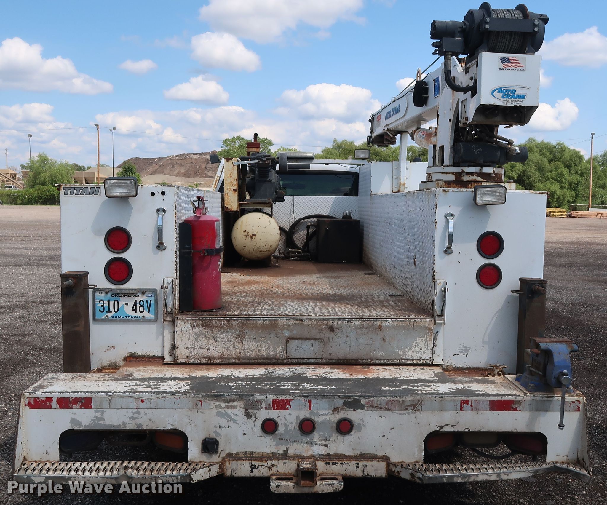 Purple Wave is selling a used Service Truck in Oklahoma. This item is a 2007 Ford F550 XL service truck with crane with the following: 328,043 miles on odometer, 6.0L V8 OHV 32V diesel engine, Automatic transmission, Single axle, AC and heat, Cruise, Auxiliary controls, PTO, Wet kit, Titan utility bed, 13'L, Torch bottle rack, Ingersoll Rand 2475 air compressor, Kohler Command Pro 12.5 gas engine, Hose reel, Auto Crane 6406H crane, 20' boom length, 6,400 lbs max lift capacity, Spring suspension, Hydraulic brakes, 165" wheelbase, 225/70R19.5 tires, GVWR 17,950 lbs, Turns over, but will not start, Unit# 1-180