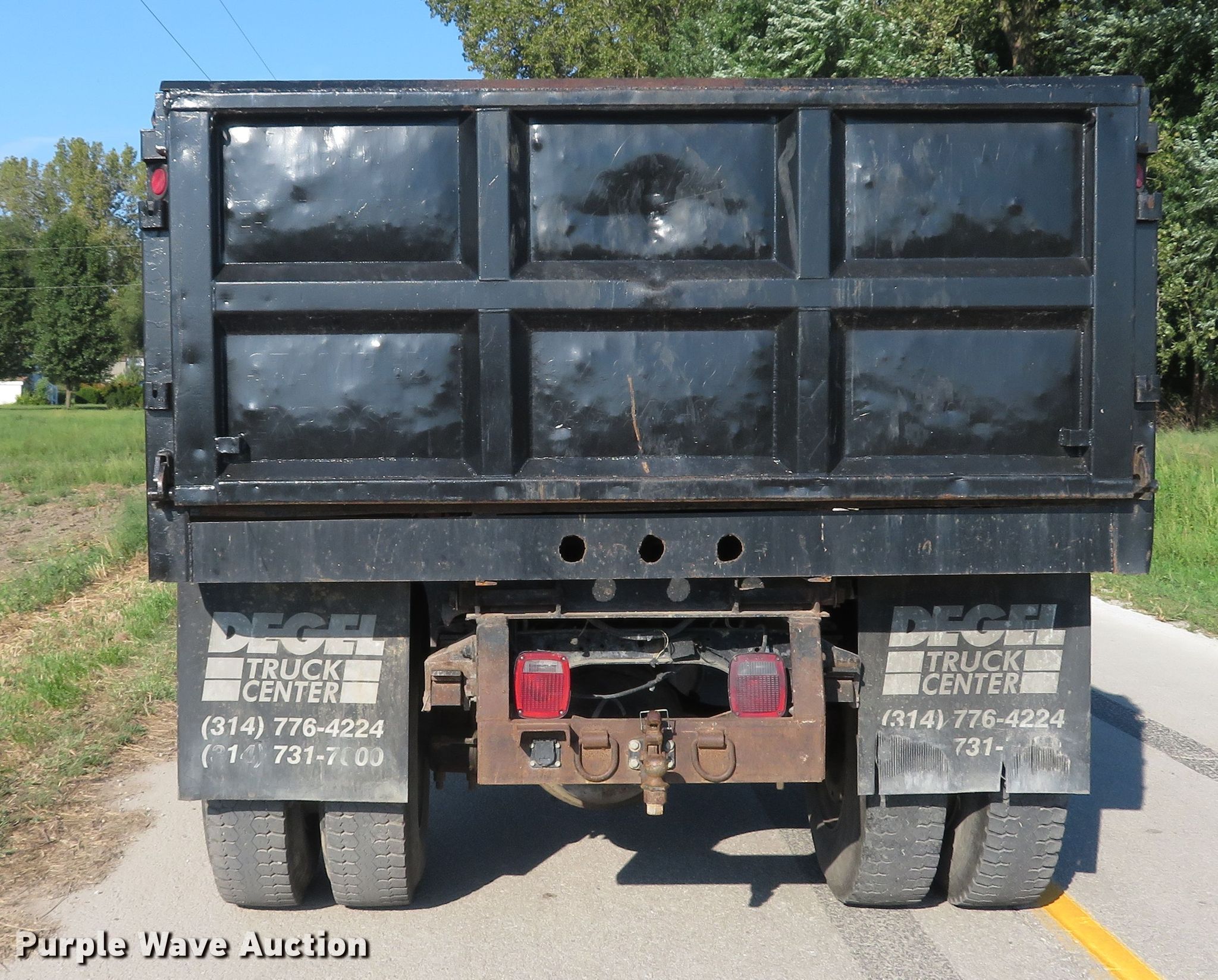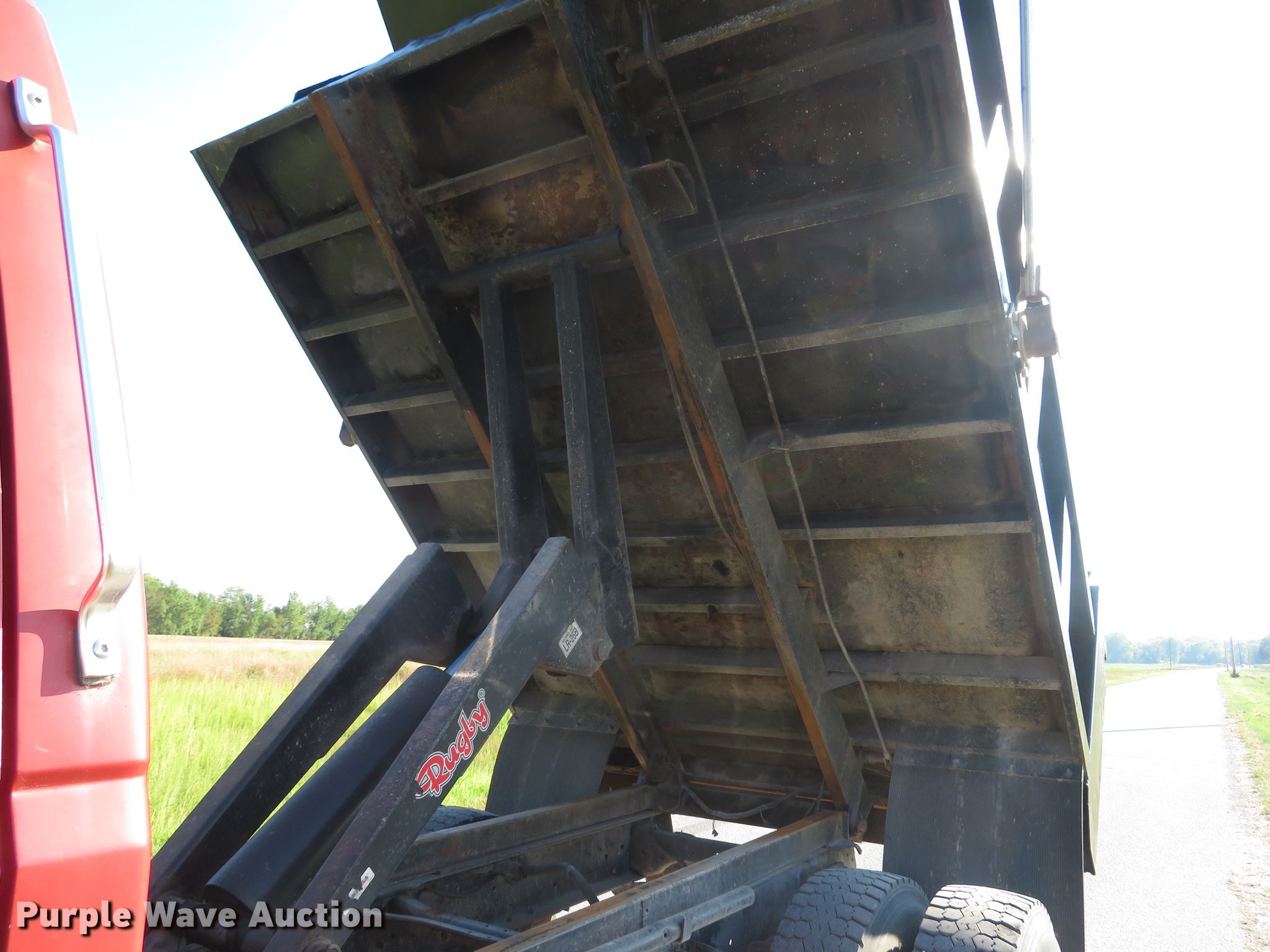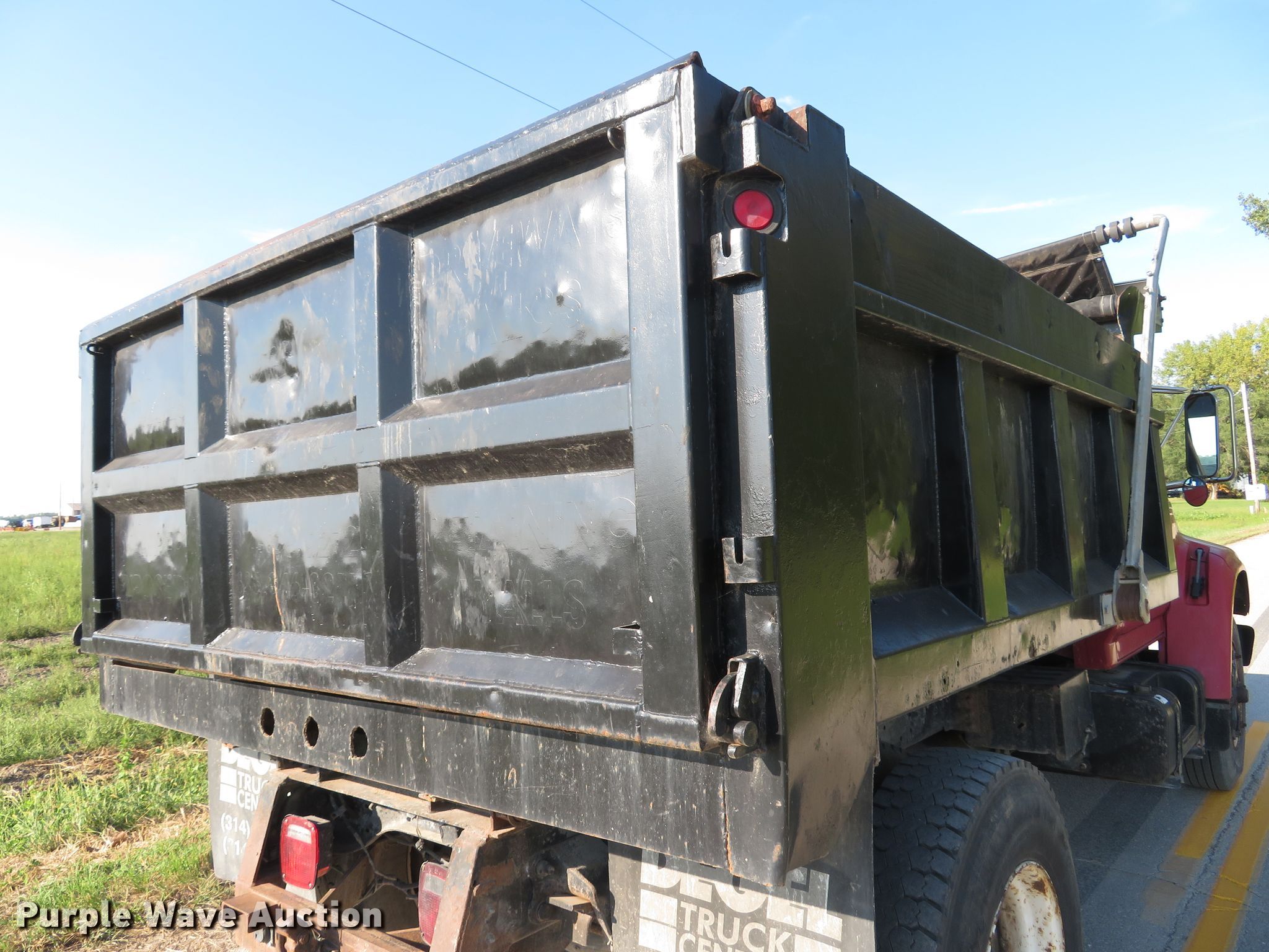 Purple Wave is selling a used Construction Dump Truck in Missouri. This item is a 1996 Ford F800 dump truck with the following: 200,519 miles on odometer, Cummins ISB 5.9L L6 diesel engine, Five speed manual transmission, Two speed rear end, Single axle, AC and heat, Brake controller, PTO, Rugby steel dump bed, 10'L x 96"W, 24" side height, 10" side board height, Single ram hoist, Manual end gate, Spring suspension, Hydraulic brakes, 153" wheelbase, 11R22.5 tires, GVWR 28,000 lbs, FAWR 9,000 lbs, RAWR 19,000 lbs, Cracked windshield, Brake light on