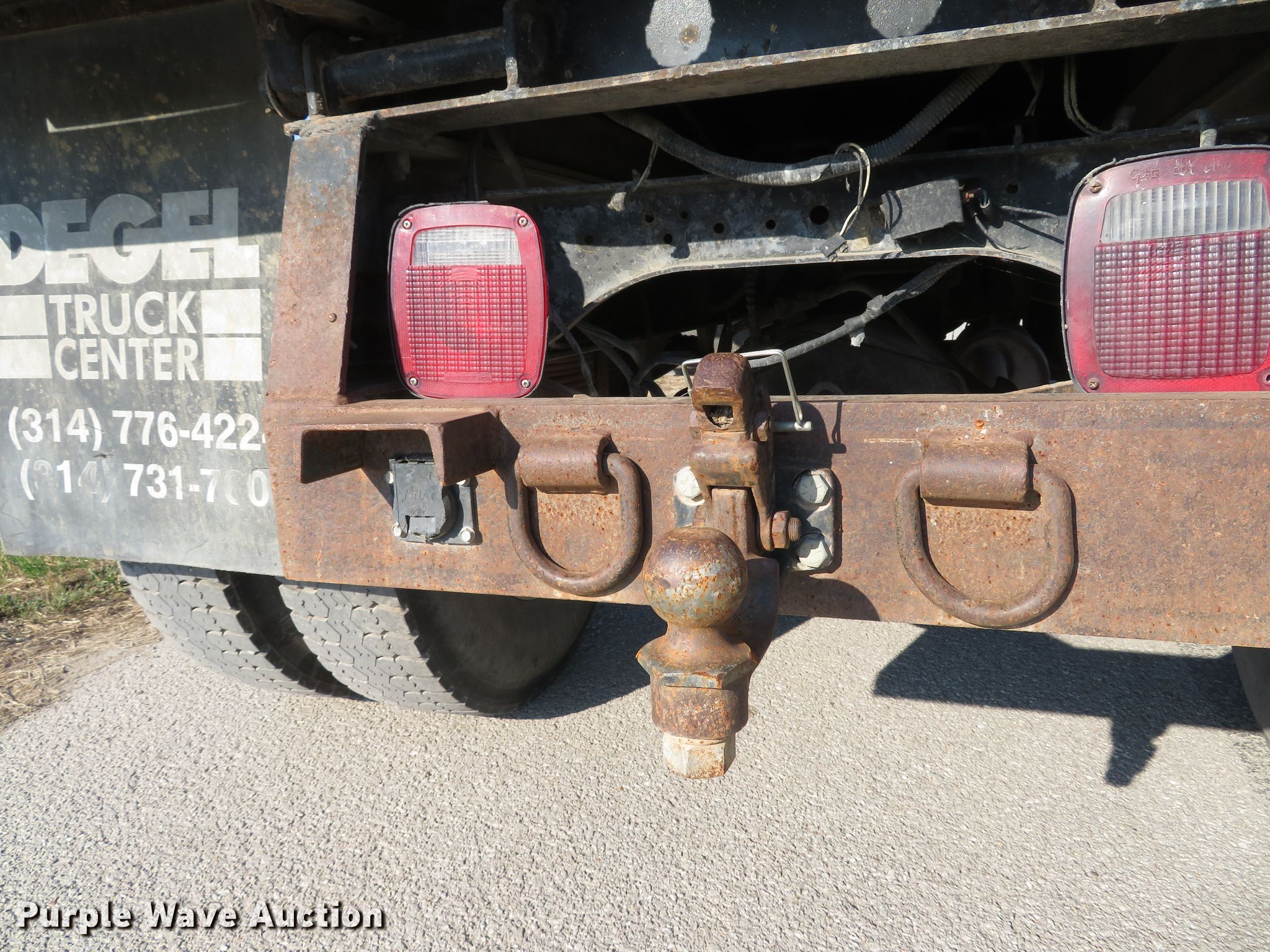 1996 Ford F800 dump truck. 200,519 miles on odometer, Cummins ISB 5.9L L6 diesel engine, Five speed manual transmission, Two speed rear end, Single axle, AC and heat, Brake controller, PTO, Rugby steel dump bed 10'L x 96"W, 24" side height, 10" side board height, Single ram hoist, Manual end gate, Spring suspension, Hydraulic brakes, 153" wheelbase, 11R22.5 tires, GVWR 28,000 lbs, FAWR 9,000 lbs, RAWR 19,000 lbs, Cracked windshield, Brake light on. Missouri title. 1FDPF80C8TVA29528. Bacchus Concrete and Construction. Saint Charles, MO 63304