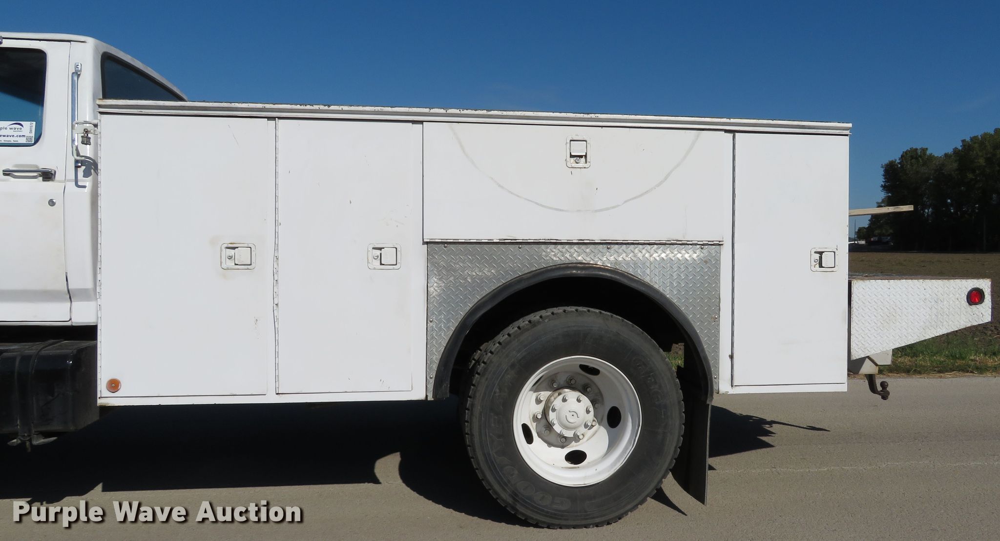 1999 Ford F800 utility truck. 126,136 miles on odometer Miles may vary, still in use, Cummins ISB 5.9L six cylinder diesel engine 190 HP, Automatic transmission, Single axle, AC and heat, Brake controller, PTO, Knapheide 6131HC66339070 utility bed 11'L, 29" bumper, Spring suspension, Air brakes, 153" wheelbase, 10R22.5 tires, GVWR 26,000 lbs, Contents in toolboxes not included. Missouri title. 3FEWF80C1XMA18670. Bacchus Concrete and Construction. Saint Charles, MO 63304
