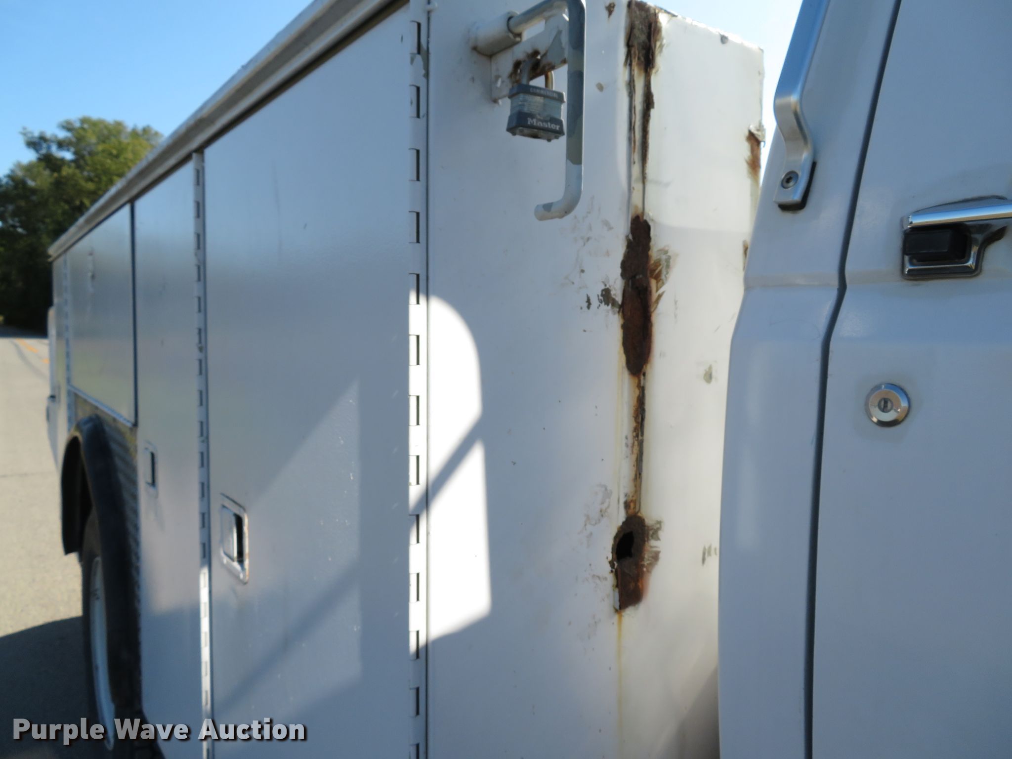 Purple Wave is selling a used Service Truck in Missouri. This item is a 1999 Ford F800 utility truck with the following: 126,136 miles on odometer, Miles may vary, still in use, Cummins ISB 5.9L six cylinder diesel engine, 190 HP, Automatic transmission, Single axle, AC and heat, Brake controller, PTO, Knapheide 6131HC66339070 utility bed, 11'L, 29" bumper, Spring suspension, Air brakes, 153" wheelbase, 10R22.5 tires, GVWR 26,000 lbs, Contents in toolboxes not included