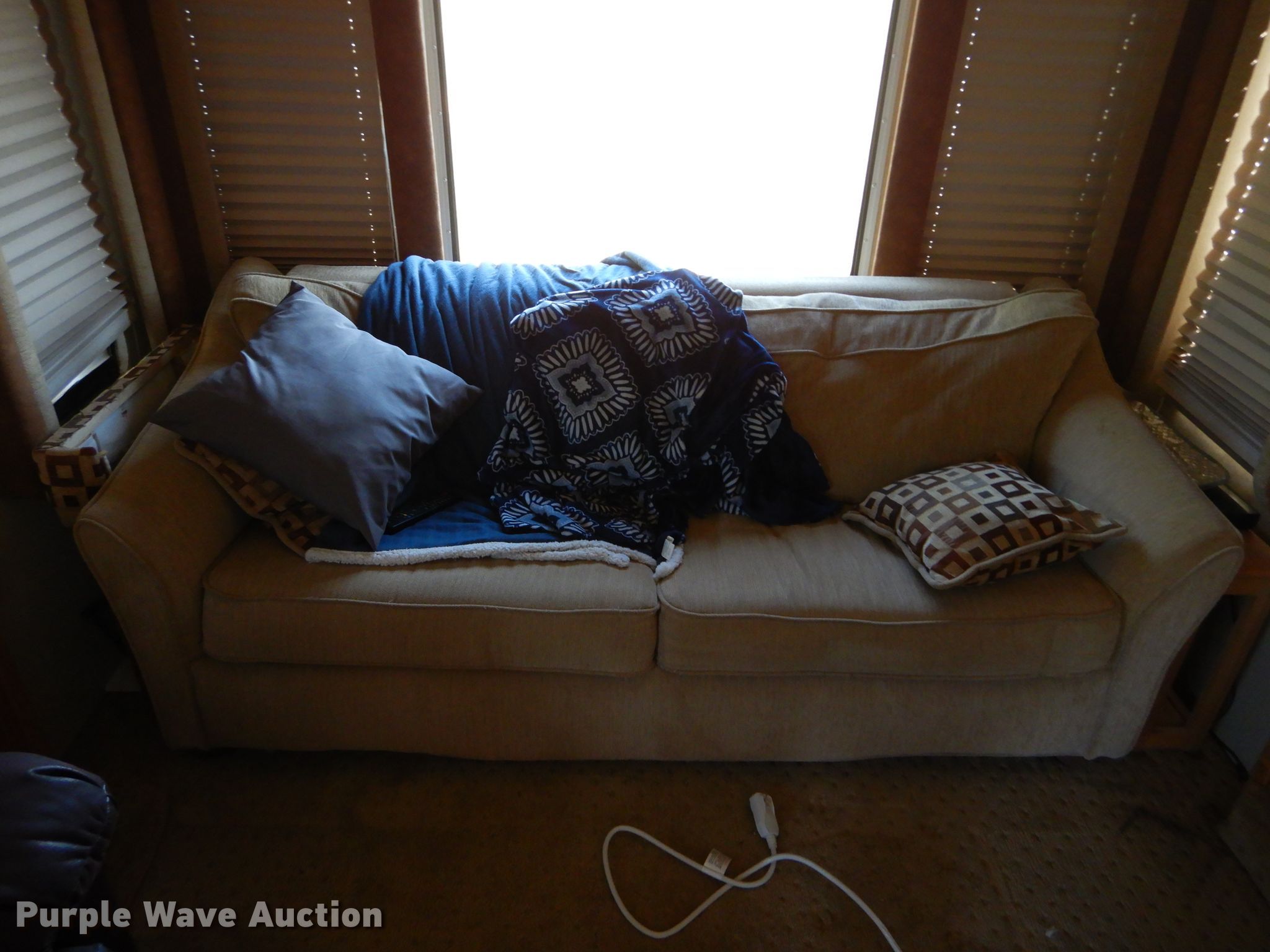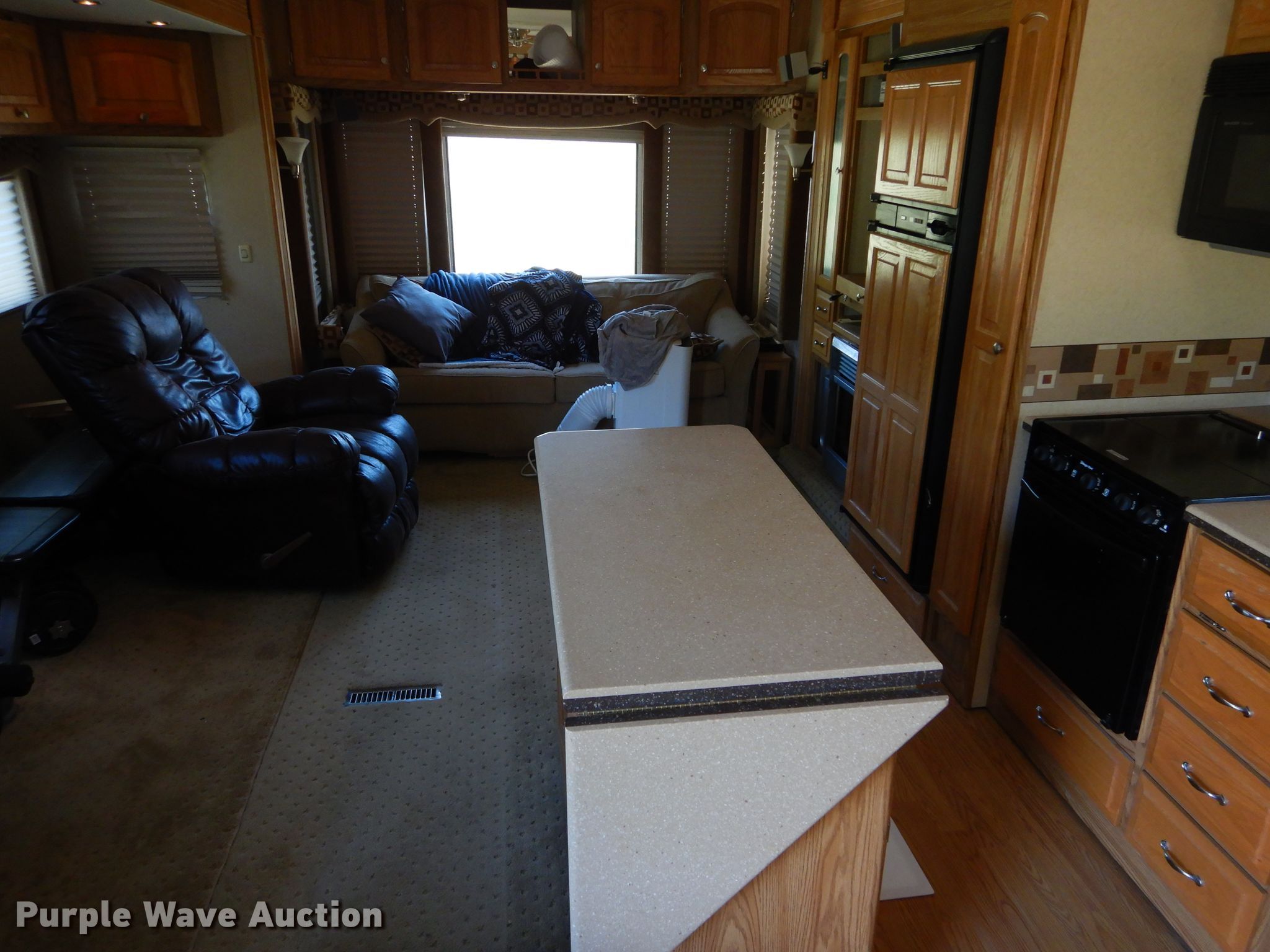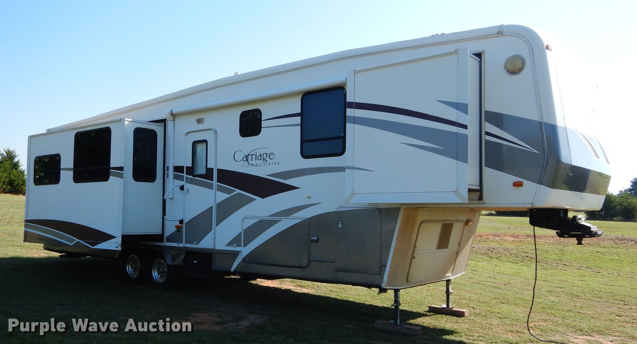 Purple Wave is selling a used RV in Oklahoma. This item is a 2006 Carriage Carri-Lite camper with the following: 37'L, (2) slide-outs, Kitchen, Sink, Refrigerator/freezer, Microwave, Oven, Living room, Table, Couch, Bathroom, Bed, Satellite, Sound system, Spring suspension, Electric brakes, Tandem axle, 235/85R16 tires, GVWR 16,990 lbs, Weight bench not included
