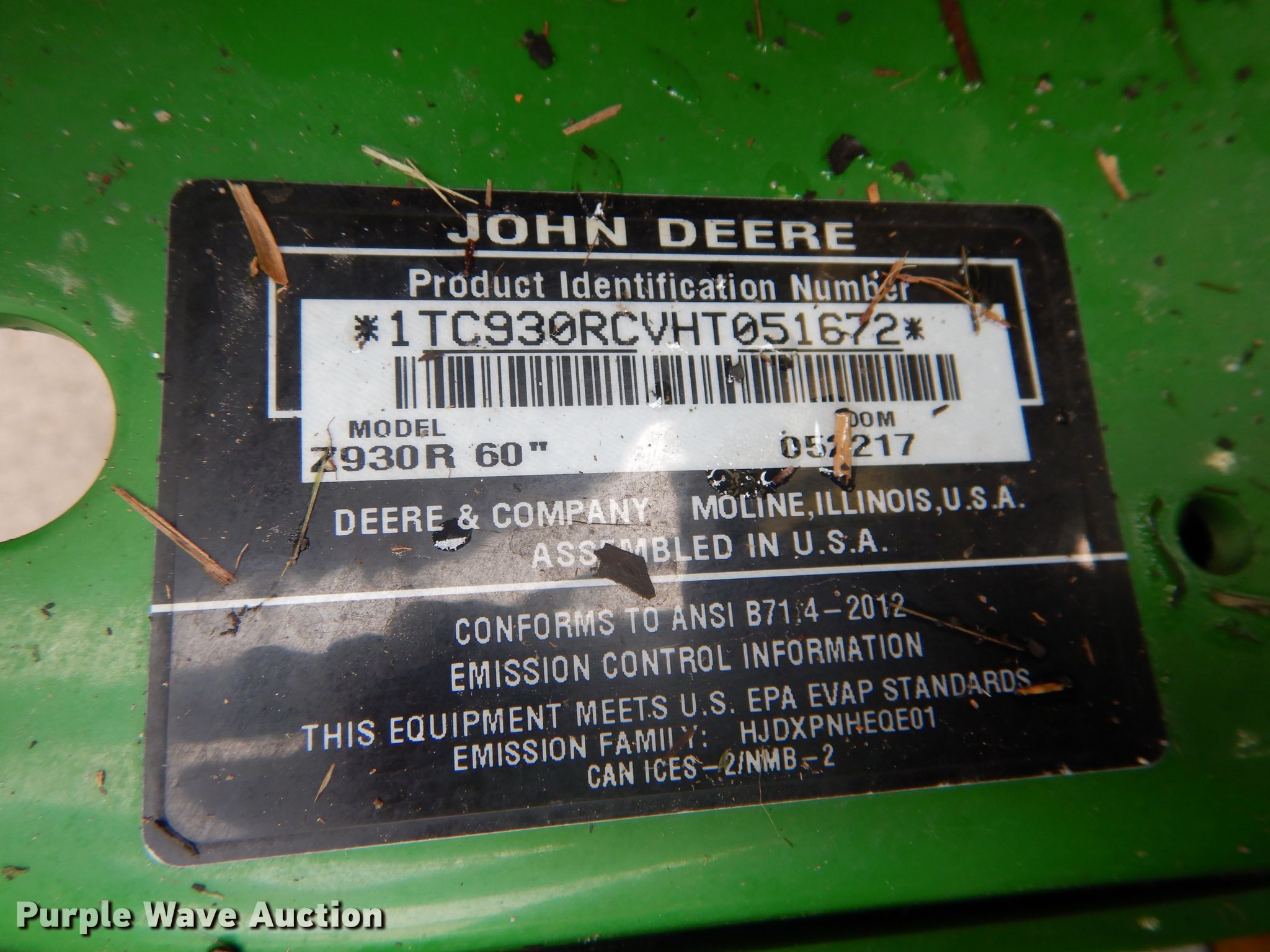 Purple Wave is selling a used Commercial Turf Mower in Iowa. This item is a John Deere Z930R ZTR lawn mower with the following: 233 hours on meter, 60" cut, John Deere two cylinder gas engine, 25.5 HP, Hydrostatic transmission, John Deere 7 Iron Pro 60 mower deck, Hydraulic lift, 13x6.50-6/4.50 front tires, 24x12.00-12 rear tires, Serial 1TC930RCVHT051672