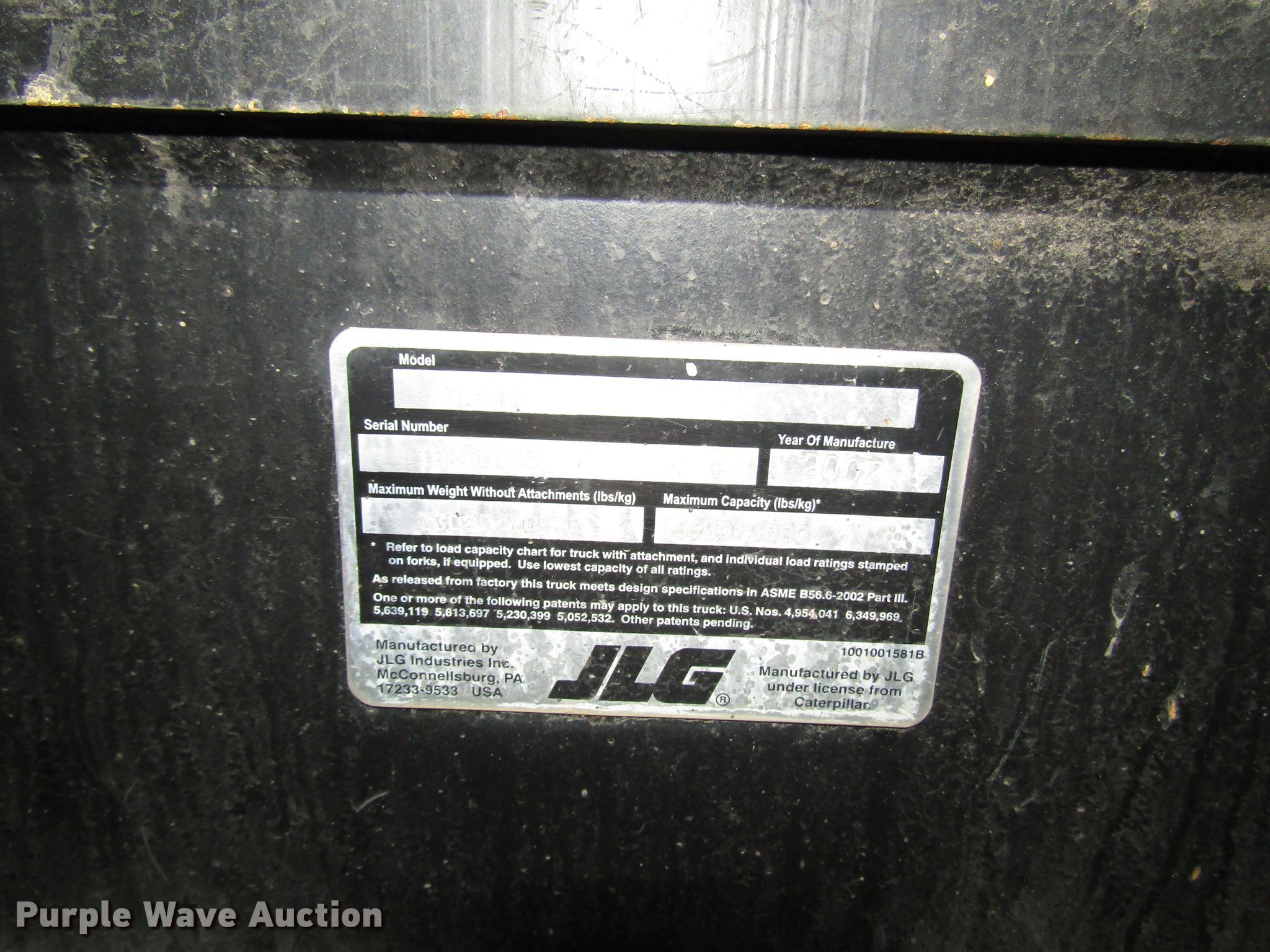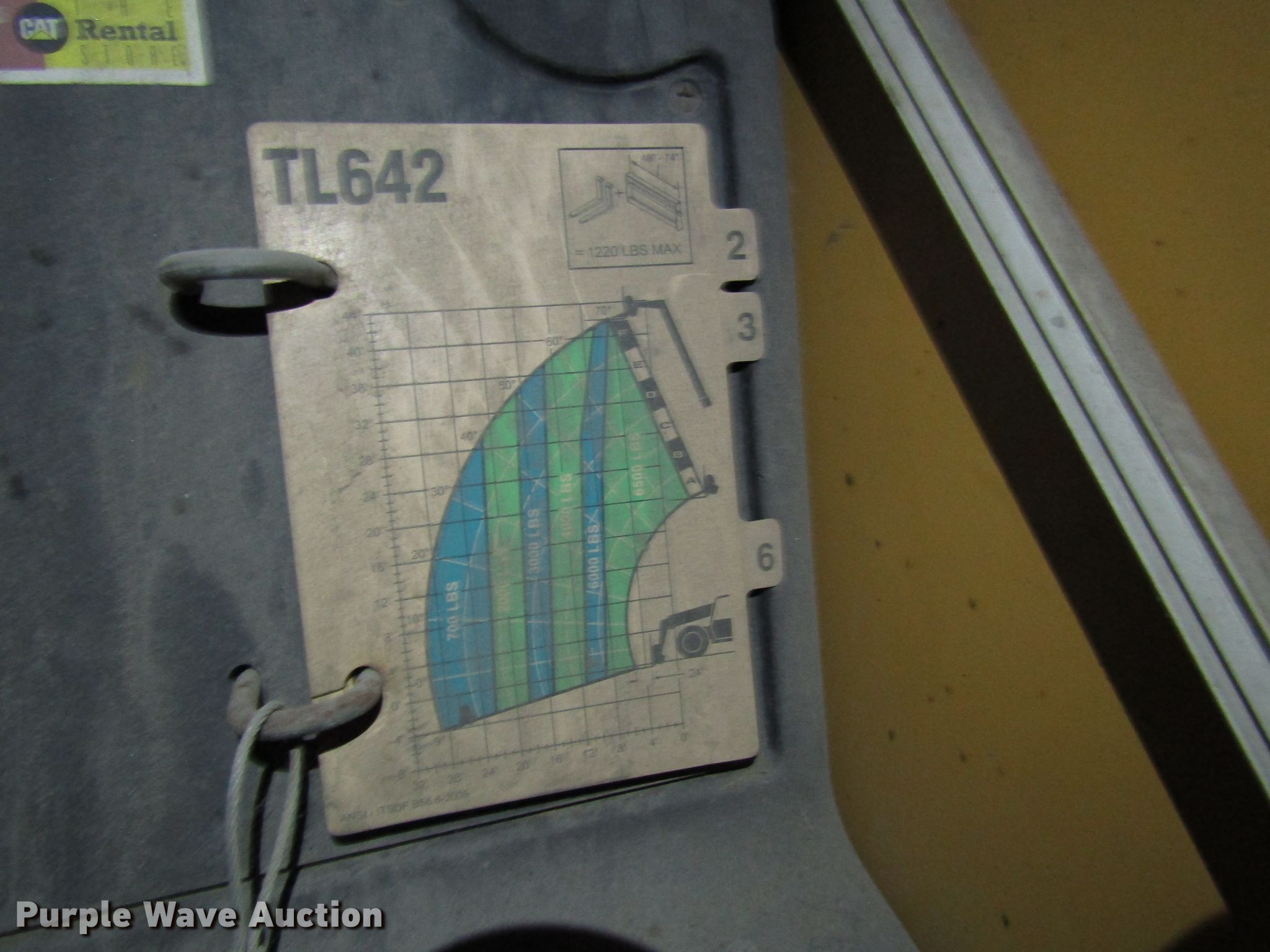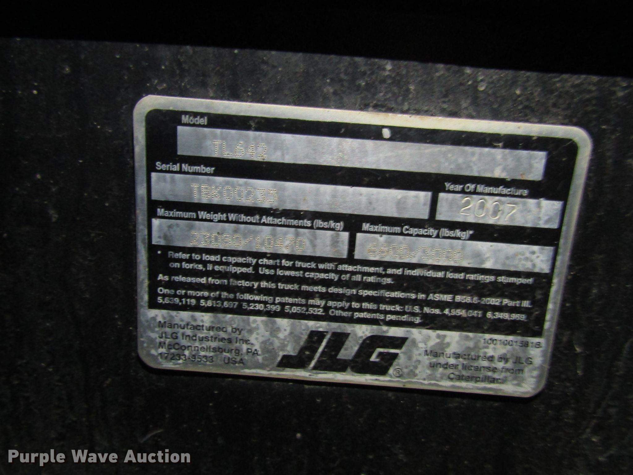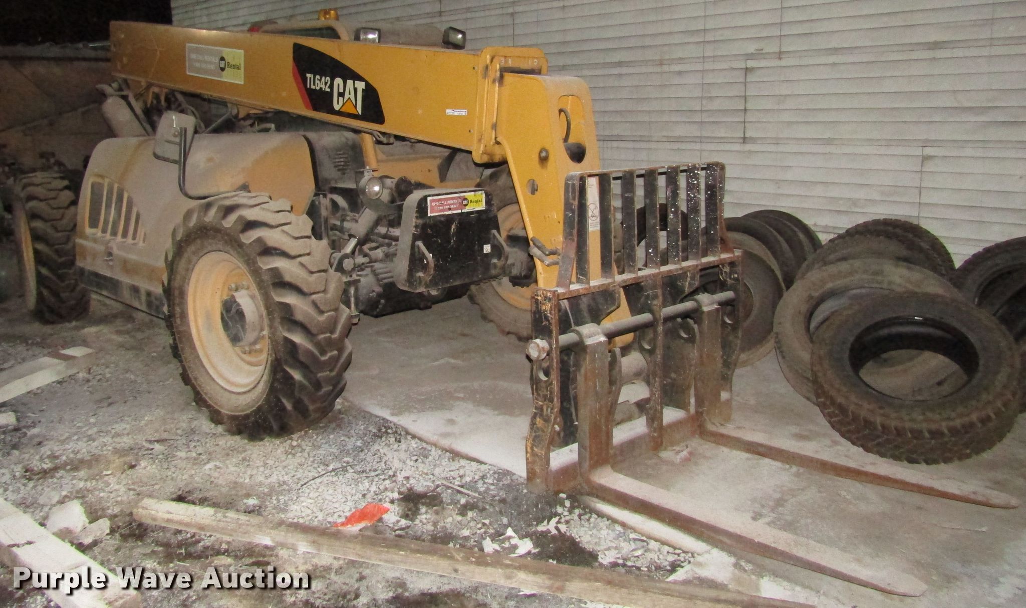 Purple Wave is selling a used Telehandler in Pennsylvania. This item is a 2007 Caterpillar TL642 telehandler with the following: 6,240 hours on meter, Caterpillar 4.4L four cylinder diesel engine, Powershift transmission, 4F-4R gears, Four wheel drive, OROPS, Crab steering, Four wheel steering, 6,500 lbs max lift capacity, 42' max lift height, Three boom stages, 48"L forks, 13.00-24 tires, Brake differential issues, Hydraulic issues, Unknown operating condition, Serial TBK00235, Unit# E118