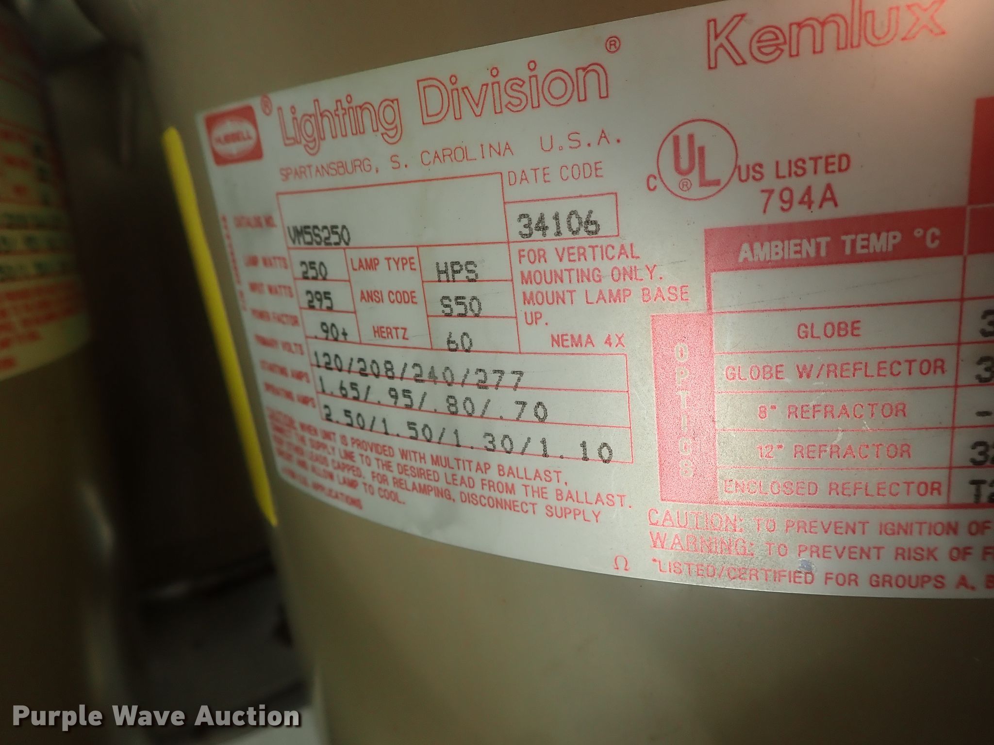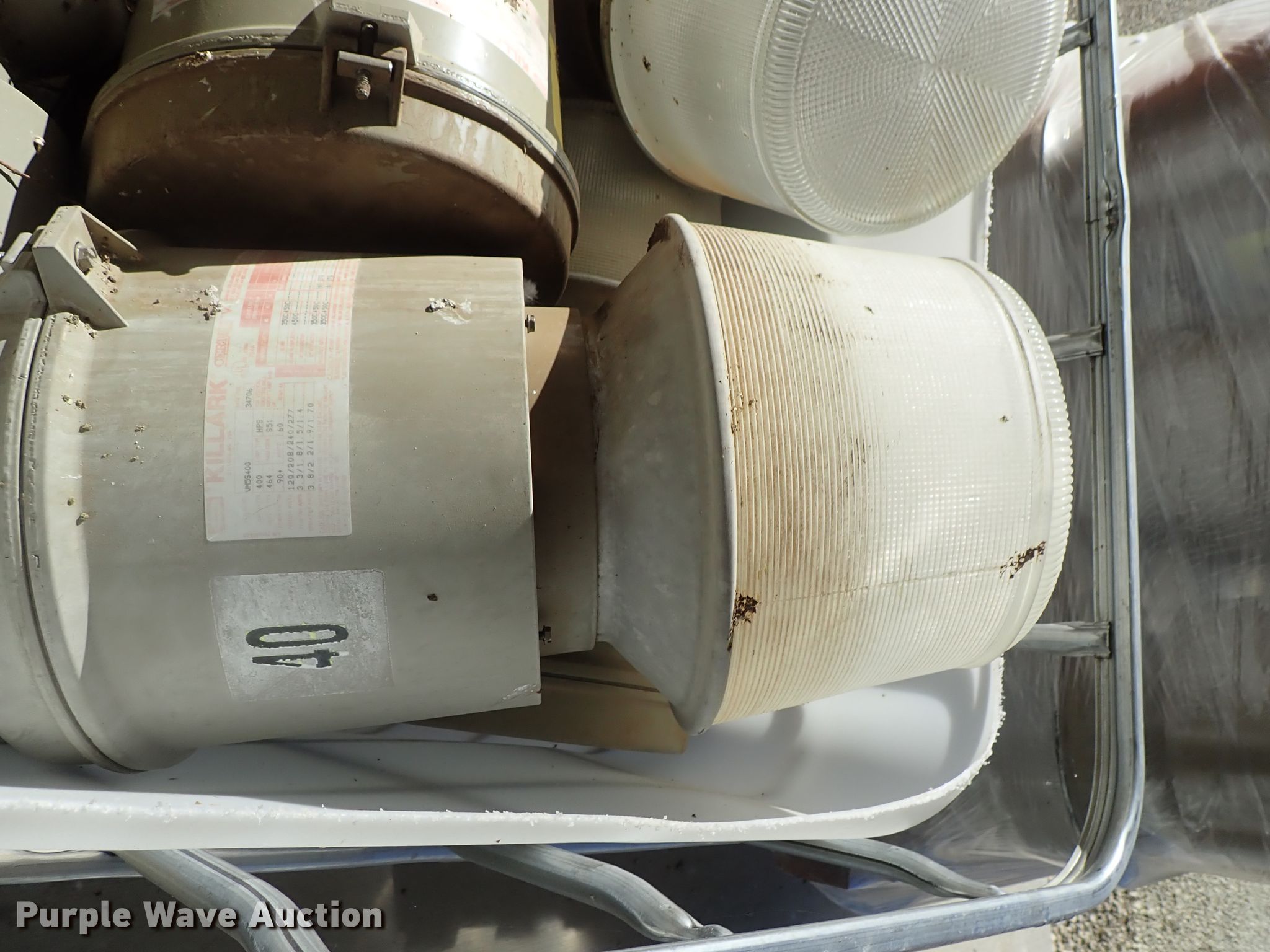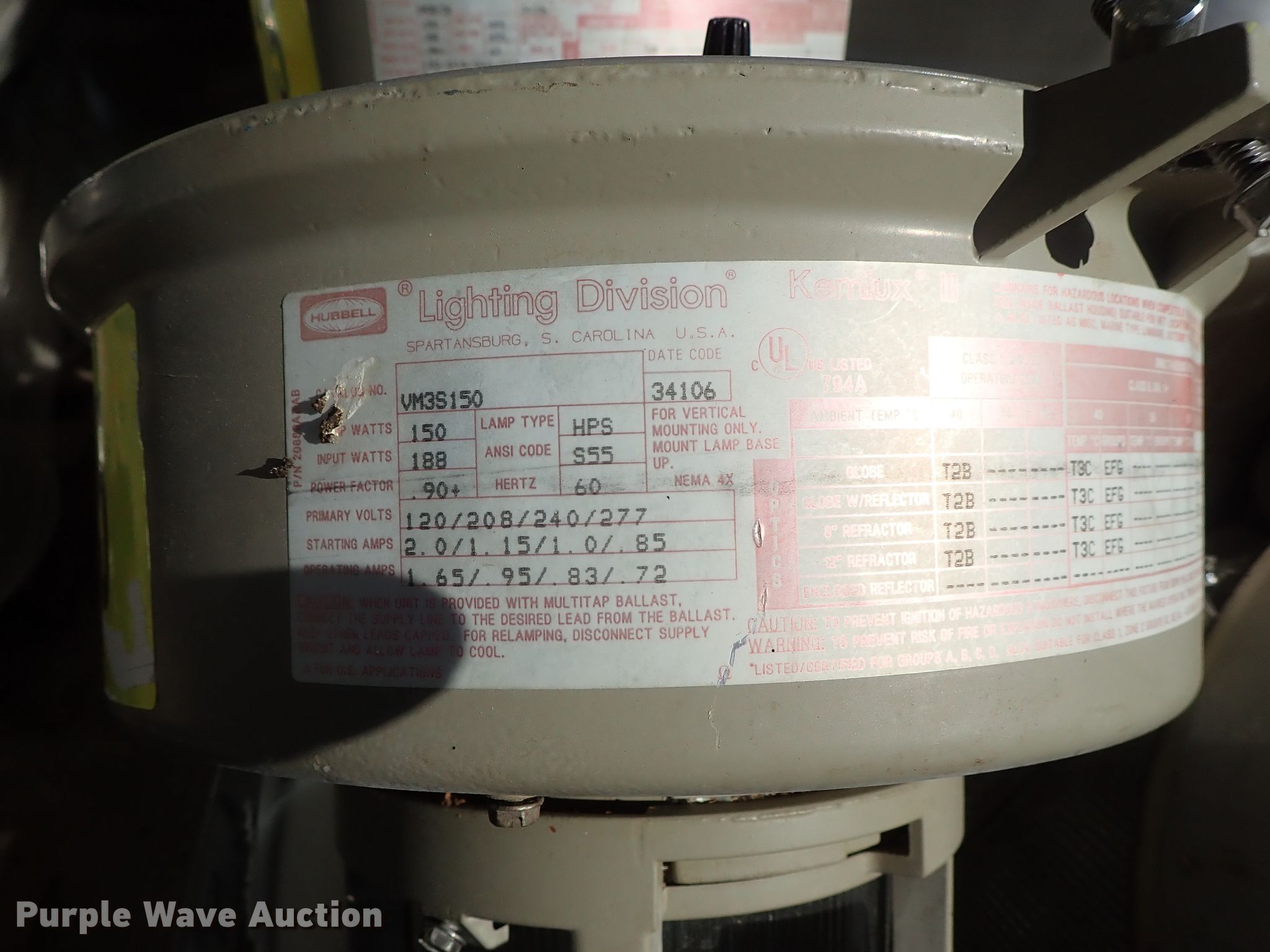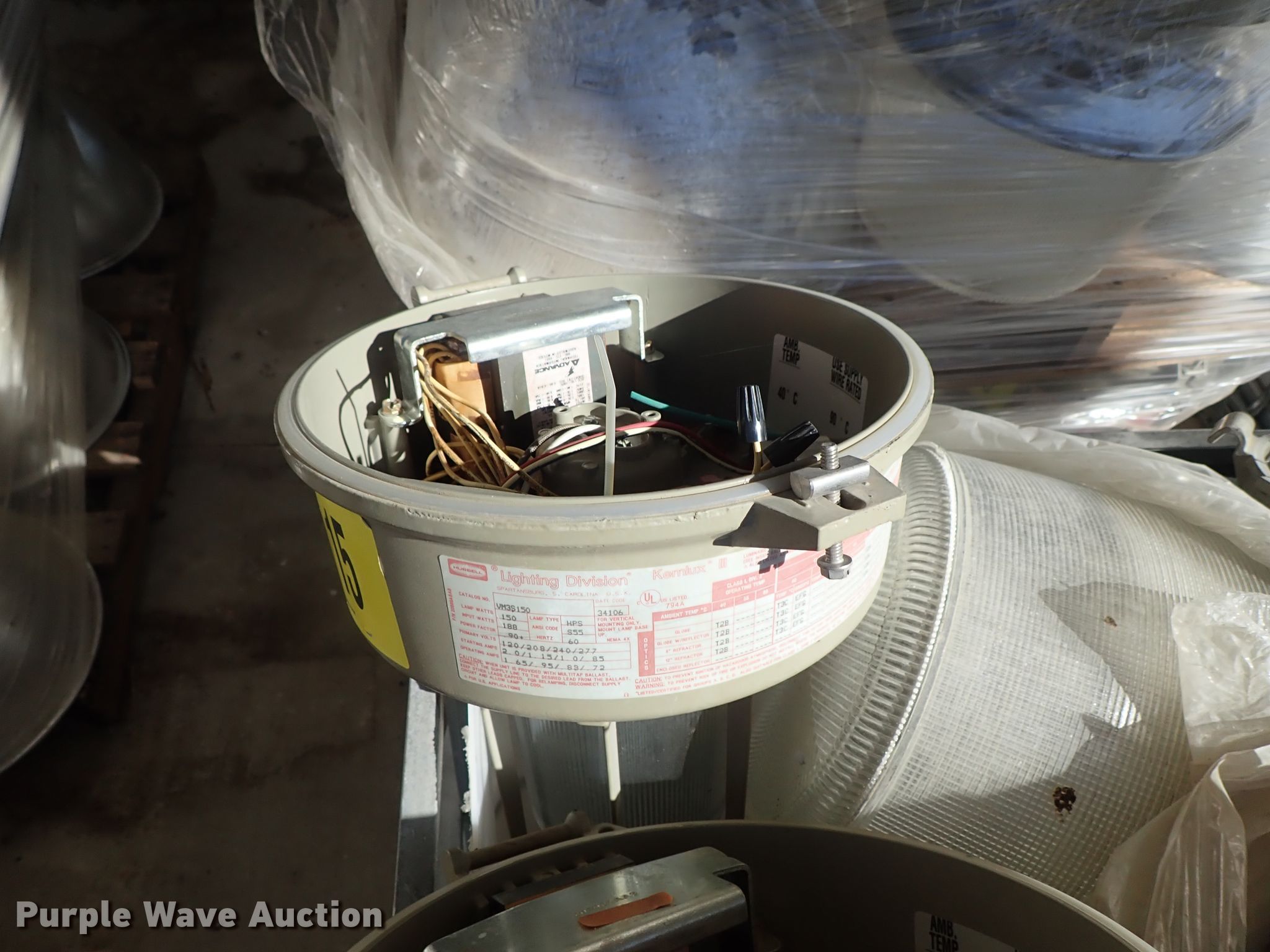 Purple Wave is selling a used Building Materials in Kansas. This item is a Approximately 105 lights with the following: Approx. 45 Hubbell VM5S250, 295 watts, Approx. 20 Killark 34706-250, 250 watts, Approx. 20 Killark VM3S150, 150 watts, Approx. 20 square sytle, Additional parts and ballasts