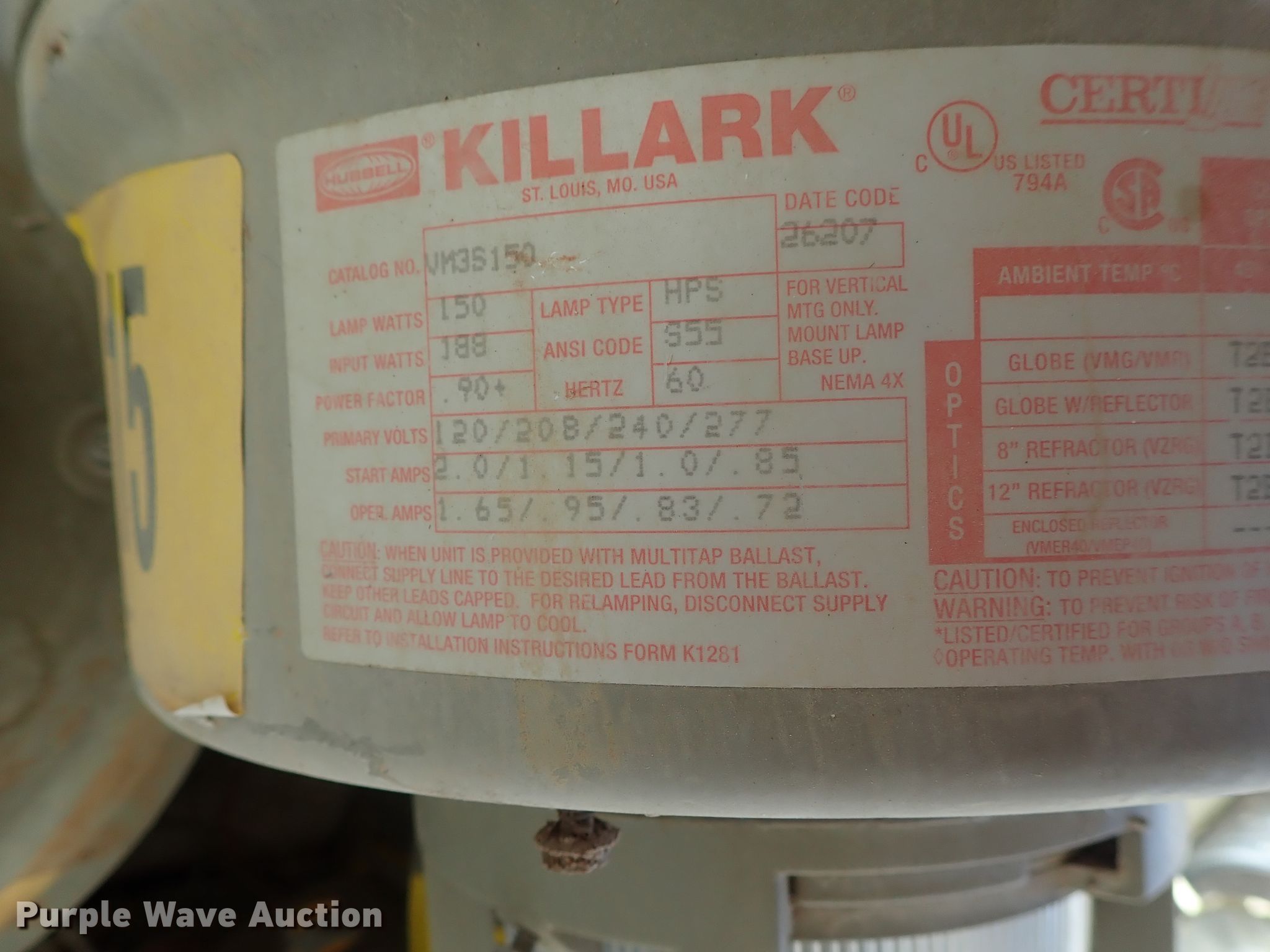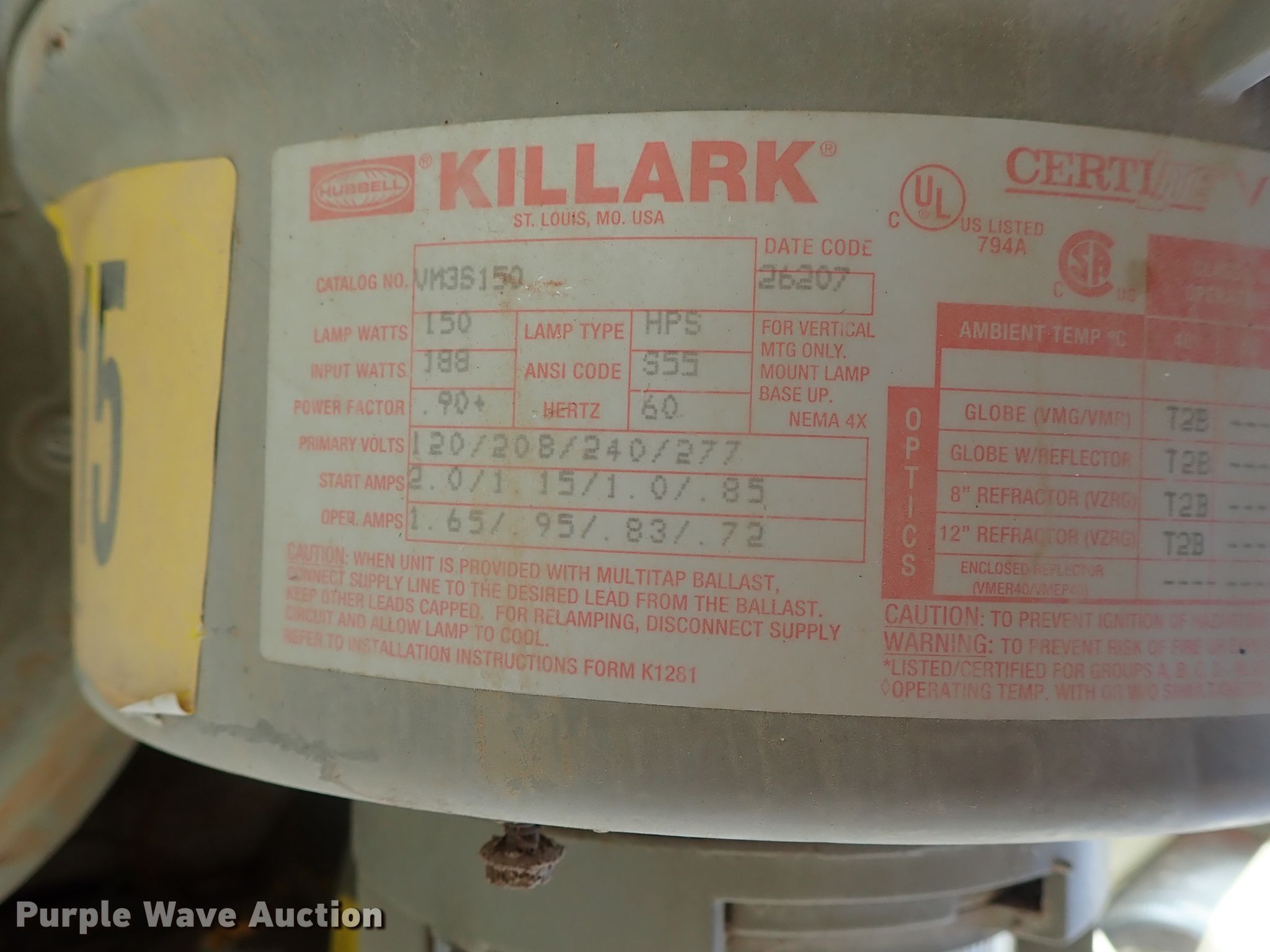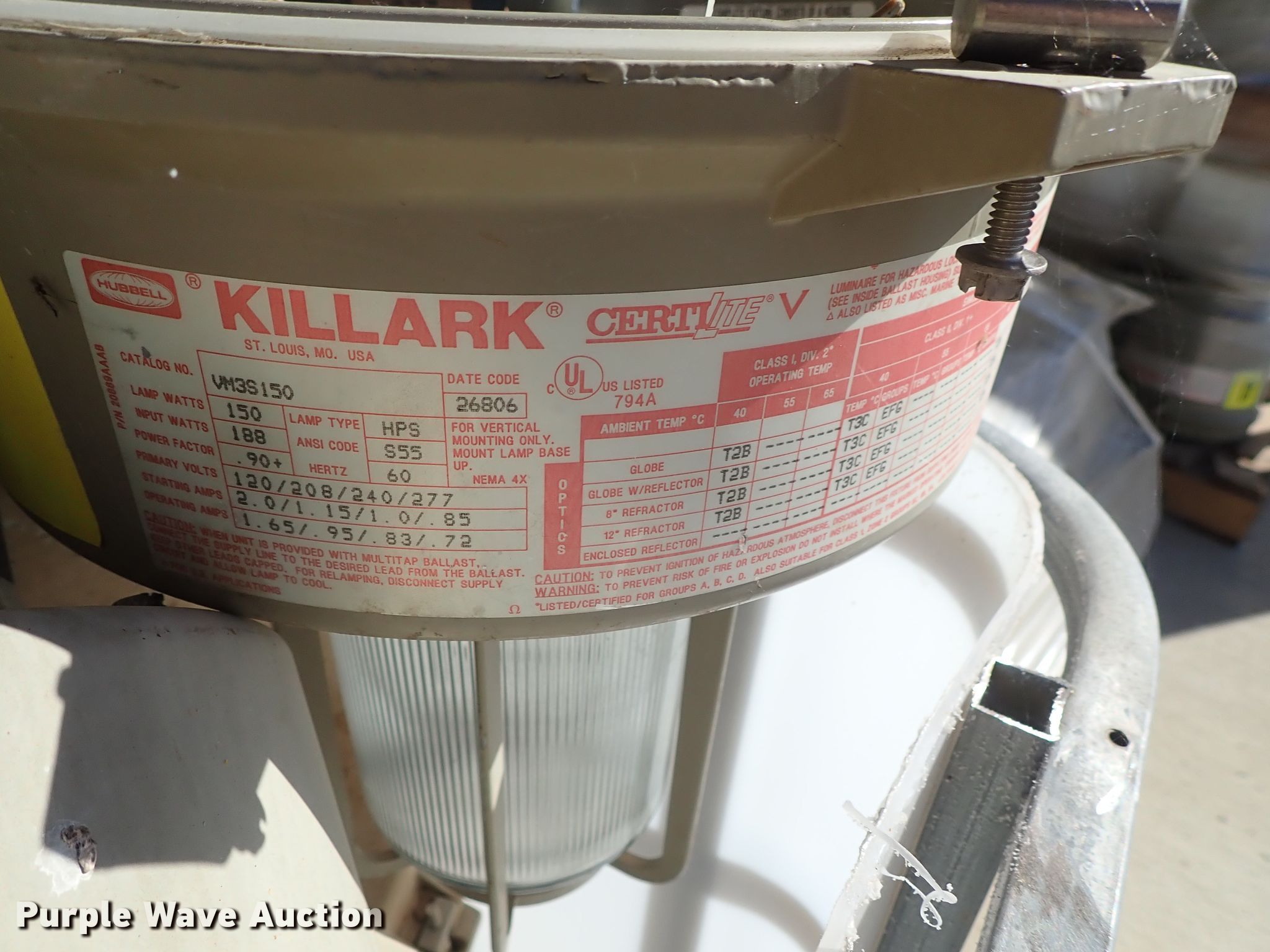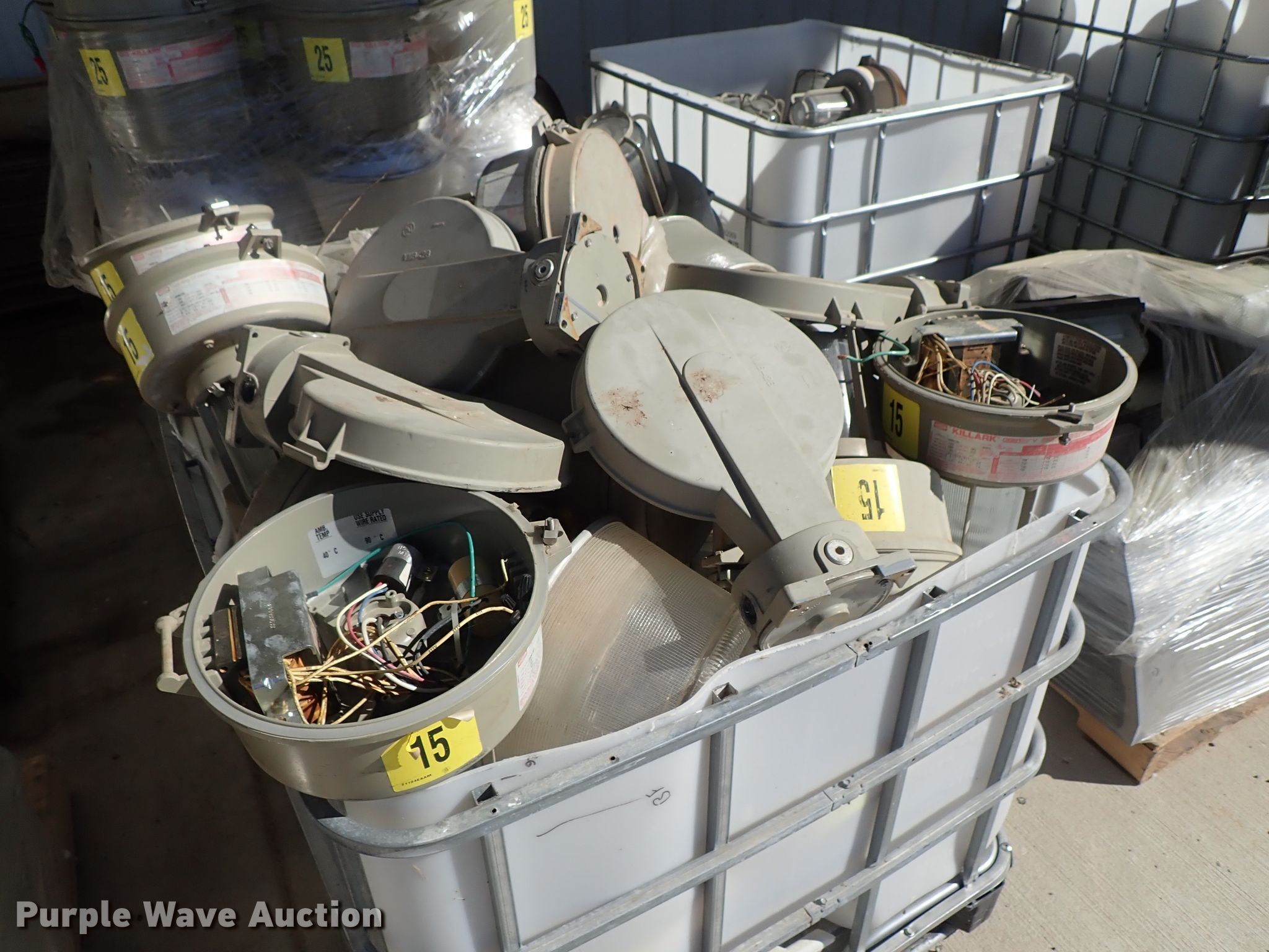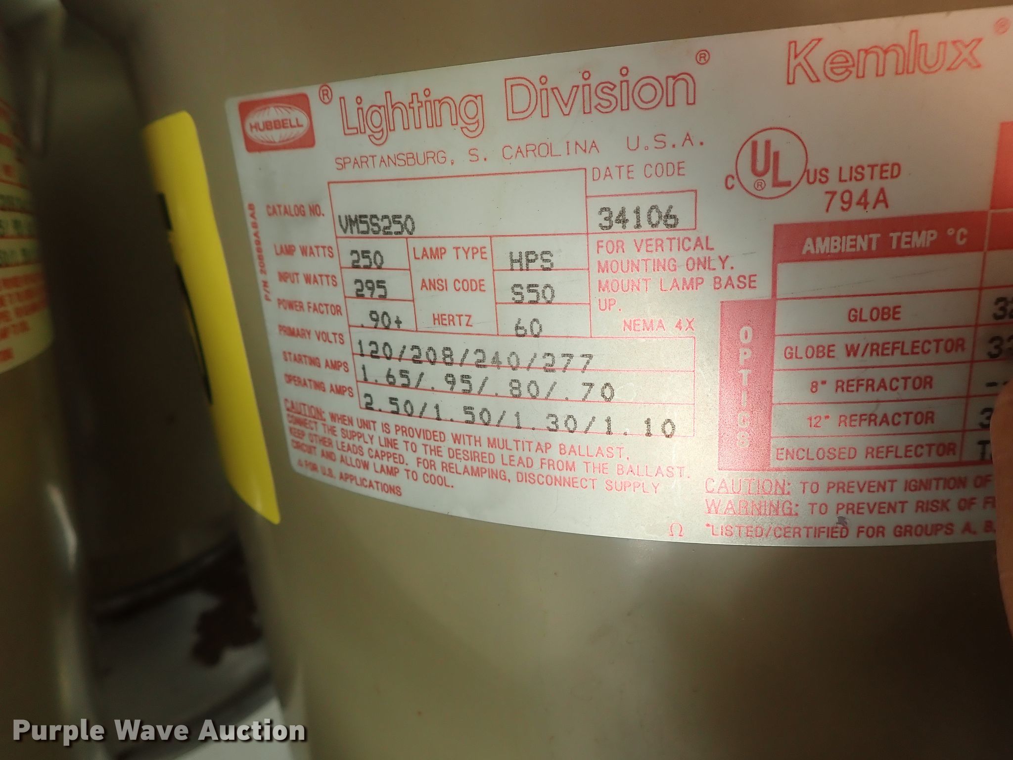 Purple Wave is selling a used Building Materials in Kansas. This item is a Approximately 105 lights with the following: Approx. 45 Hubbell VM5S250, 295 watts, Approx. 20 Killark 34706-250, 250 watts, Approx. 20 Killark VM3S150, 150 watts, Approx. 20 square sytle, Additional parts and ballasts