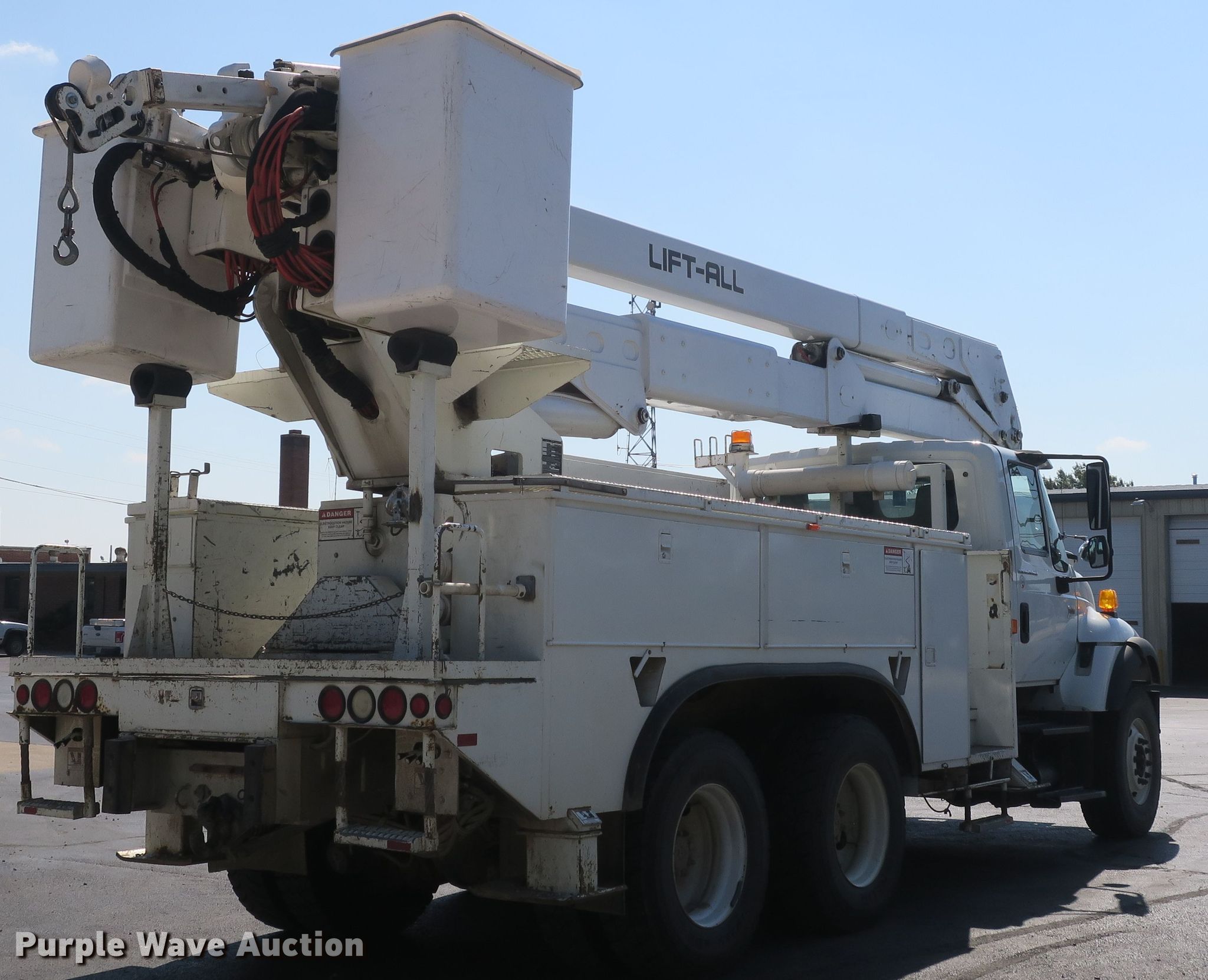 Purple Wave is selling a used Bucket Truck in Missouri. This item is a 2005 International 7400 bucket truck with the following: 107,881 miles on odometer, International DT466 7.6L L6 diesel engine, Eaton Fuller 10 speed manual transmission, Tandem axle, Heat, PTO, Dakota 182-LB utility bed, 17'3"L, DB06248, Lift ALL L0M25-55 articulating boom, 600 lbs maximum lift capacity, 55' maximum lift height, Man baskets, Platform controls, Material handler, Air suspension, Air brakes, 195" wheelbase, 315/80R22.5 front tires, 11R22.5 rear tires, Unit# 36