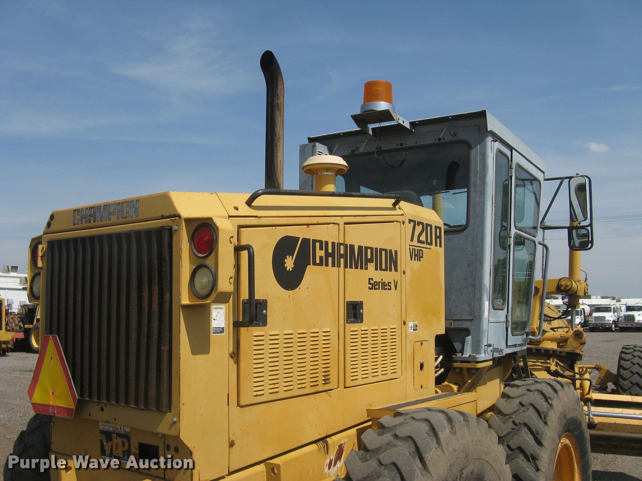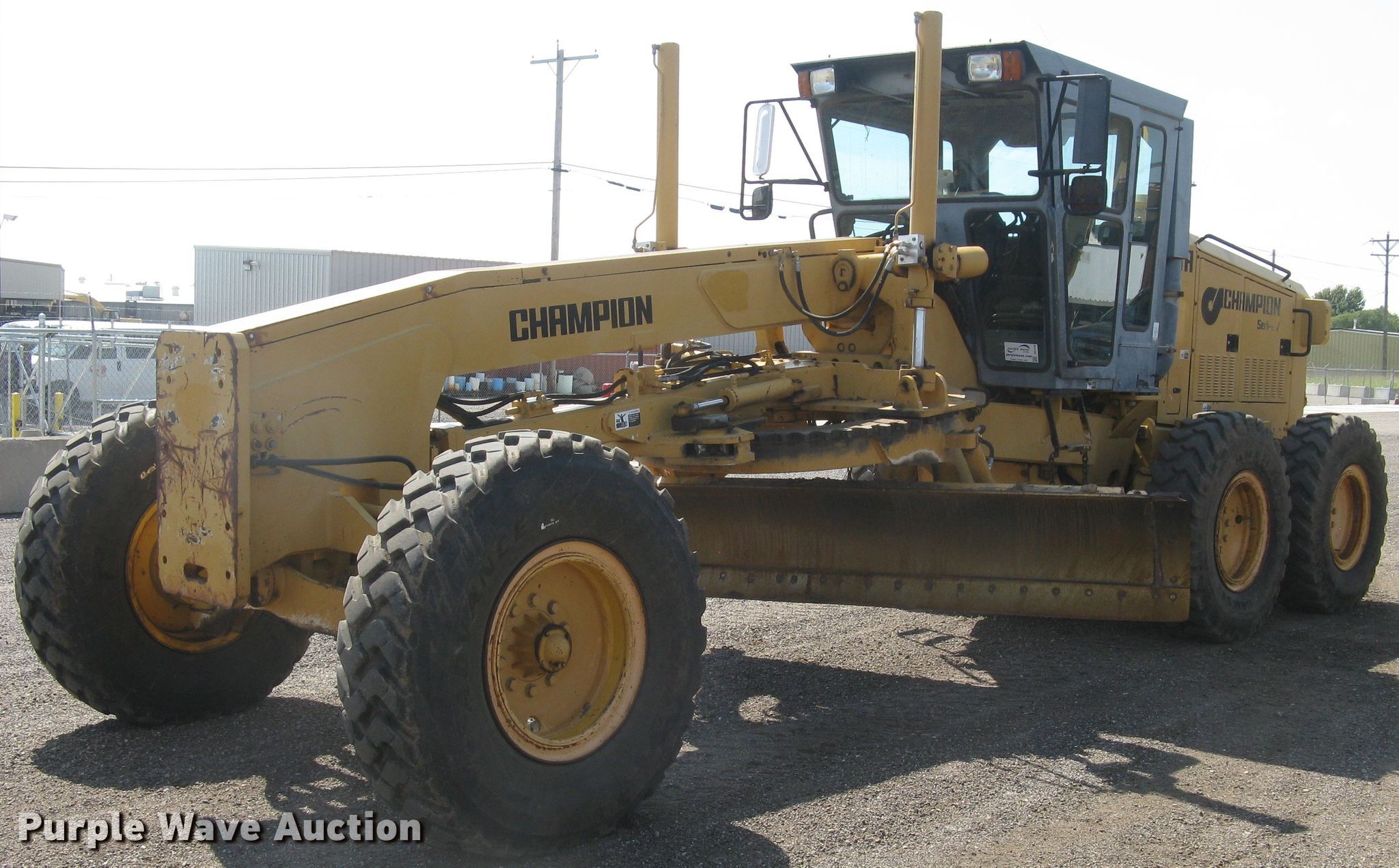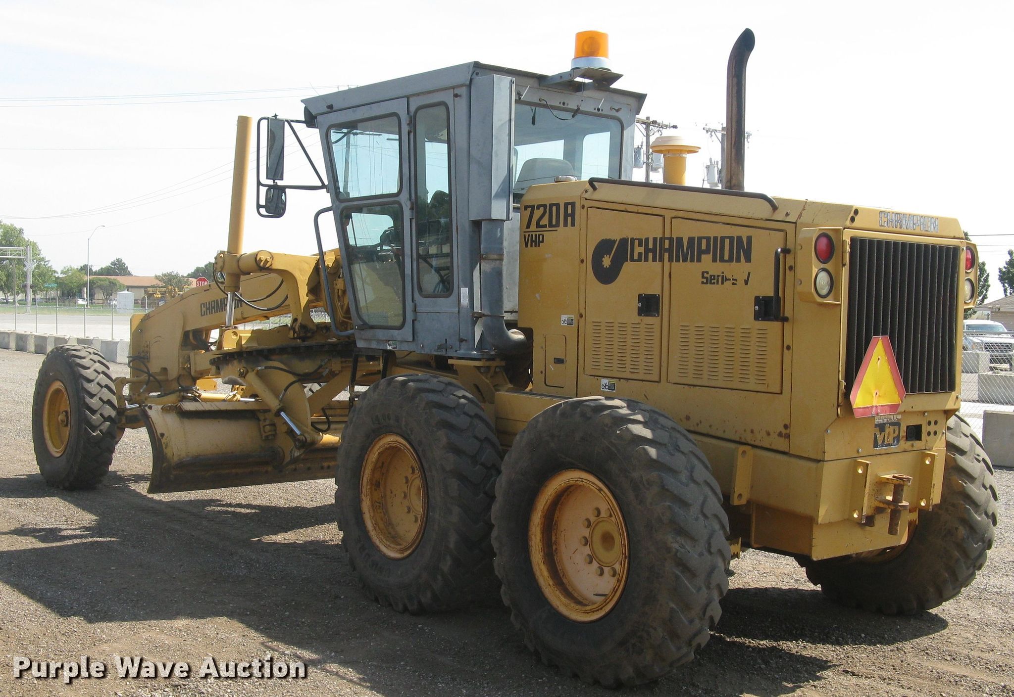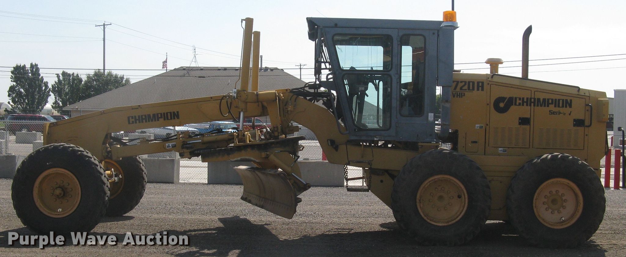 Purple Wave is selling a used Motor Grader in Kansas. This item is a 1998 Champion 720A VHP motor grader with the following: 8,826 hours on meter, Cummins six cylinder diesel engine, Powershift transmission, 8F-4R gears, EROPS, AC and heat, AM/FM, (10 ) hydraulic control valves, 12'W moldboard, Tip control, Side shift, 14.00R24 tires, Serial 028643