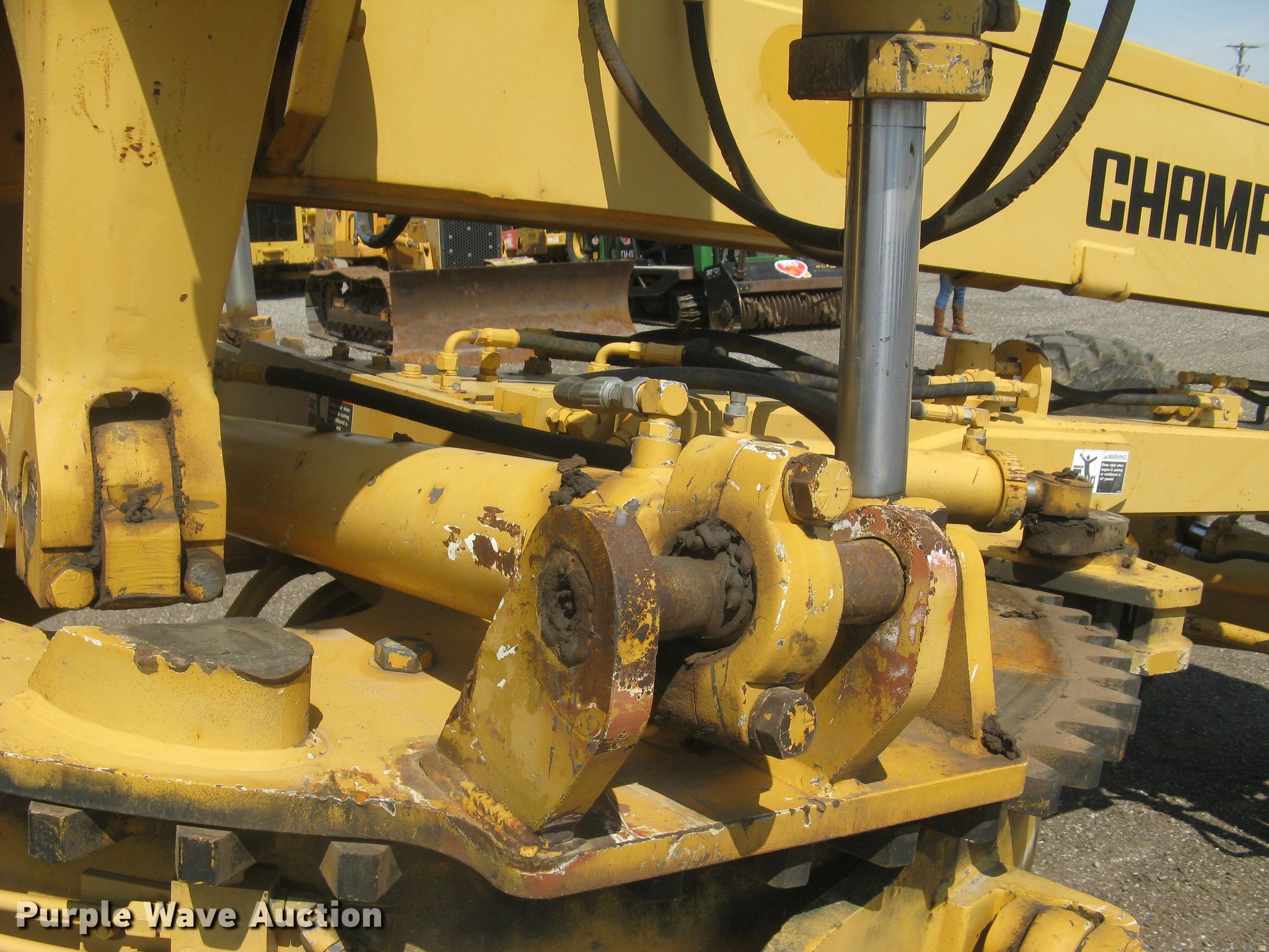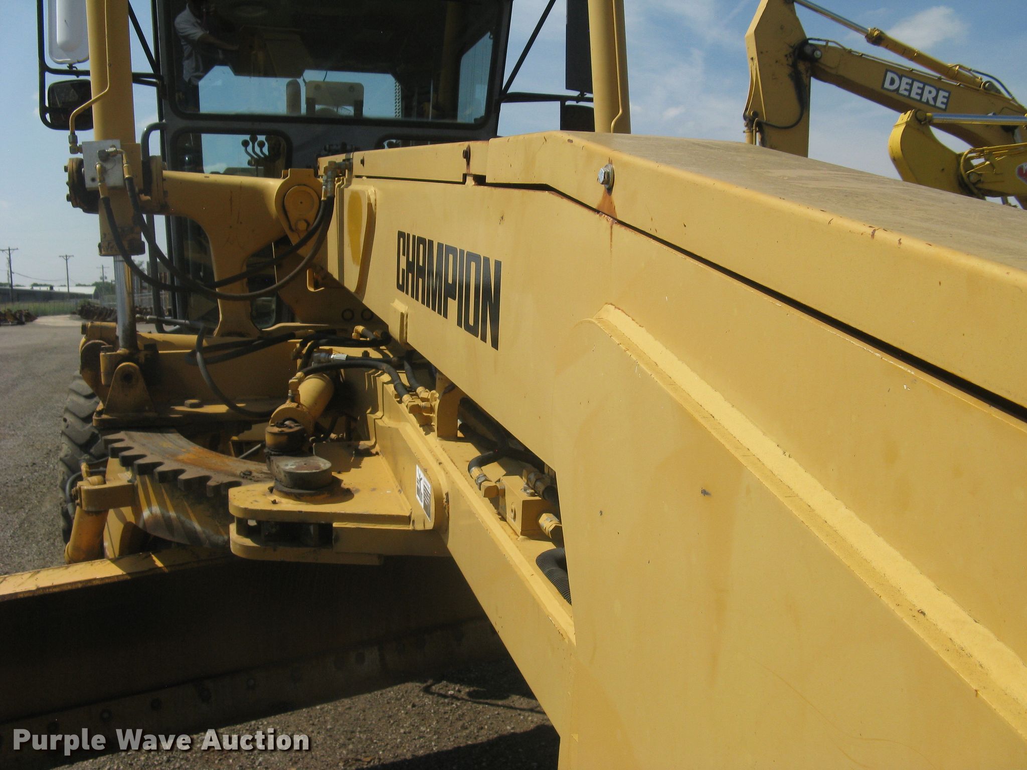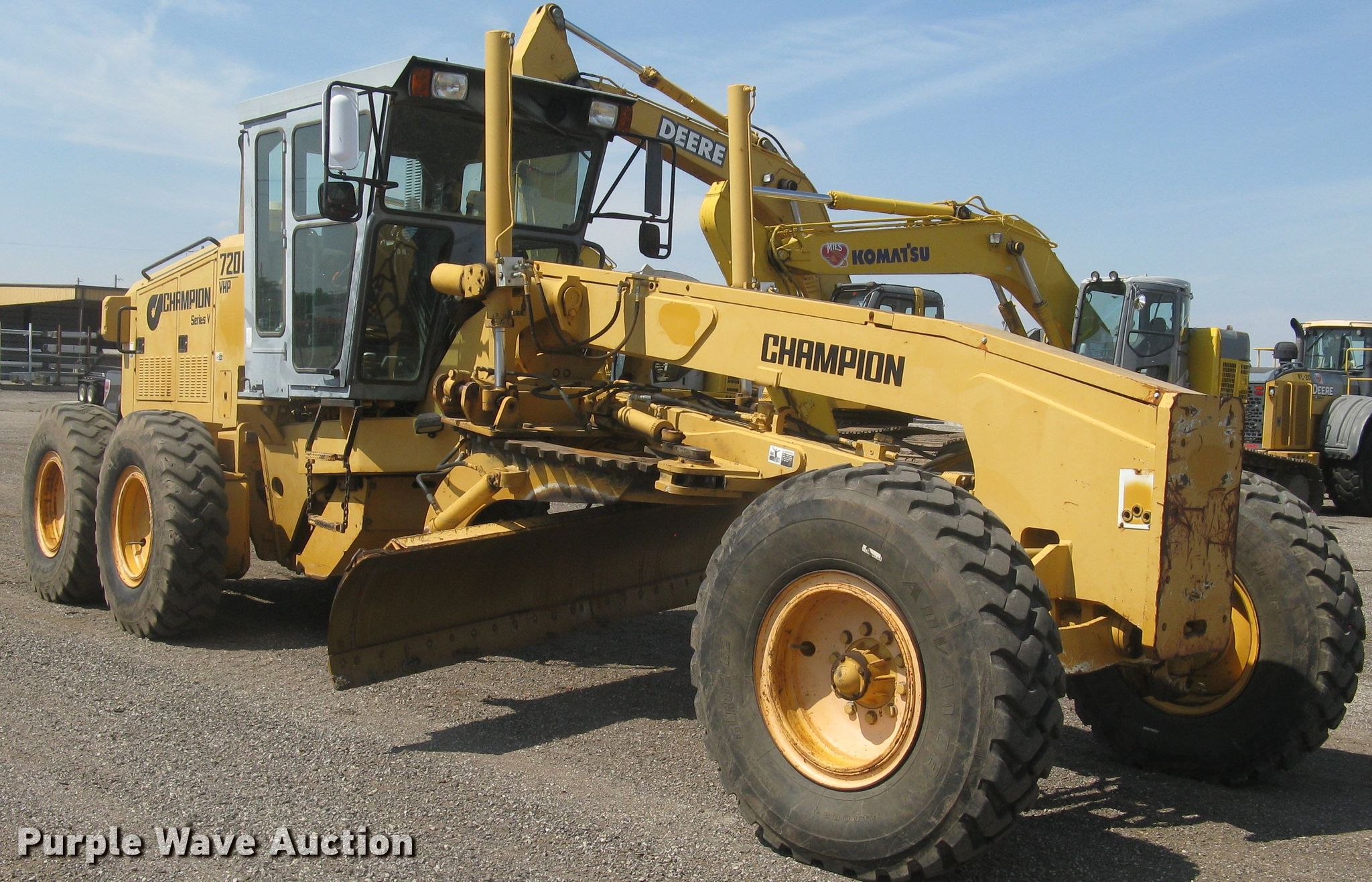 Purple Wave is selling a used Motor Grader in Kansas. This item is a 1998 Champion 720A VHP motor grader with the following: 8,826 hours on meter, Cummins six cylinder diesel engine, Powershift transmission, 8F-4R gears, EROPS, AC and heat, AM/FM, (10 ) hydraulic control valves, 12'W moldboard, Tip control, Side shift, 14.00R24 tires, Serial 028643