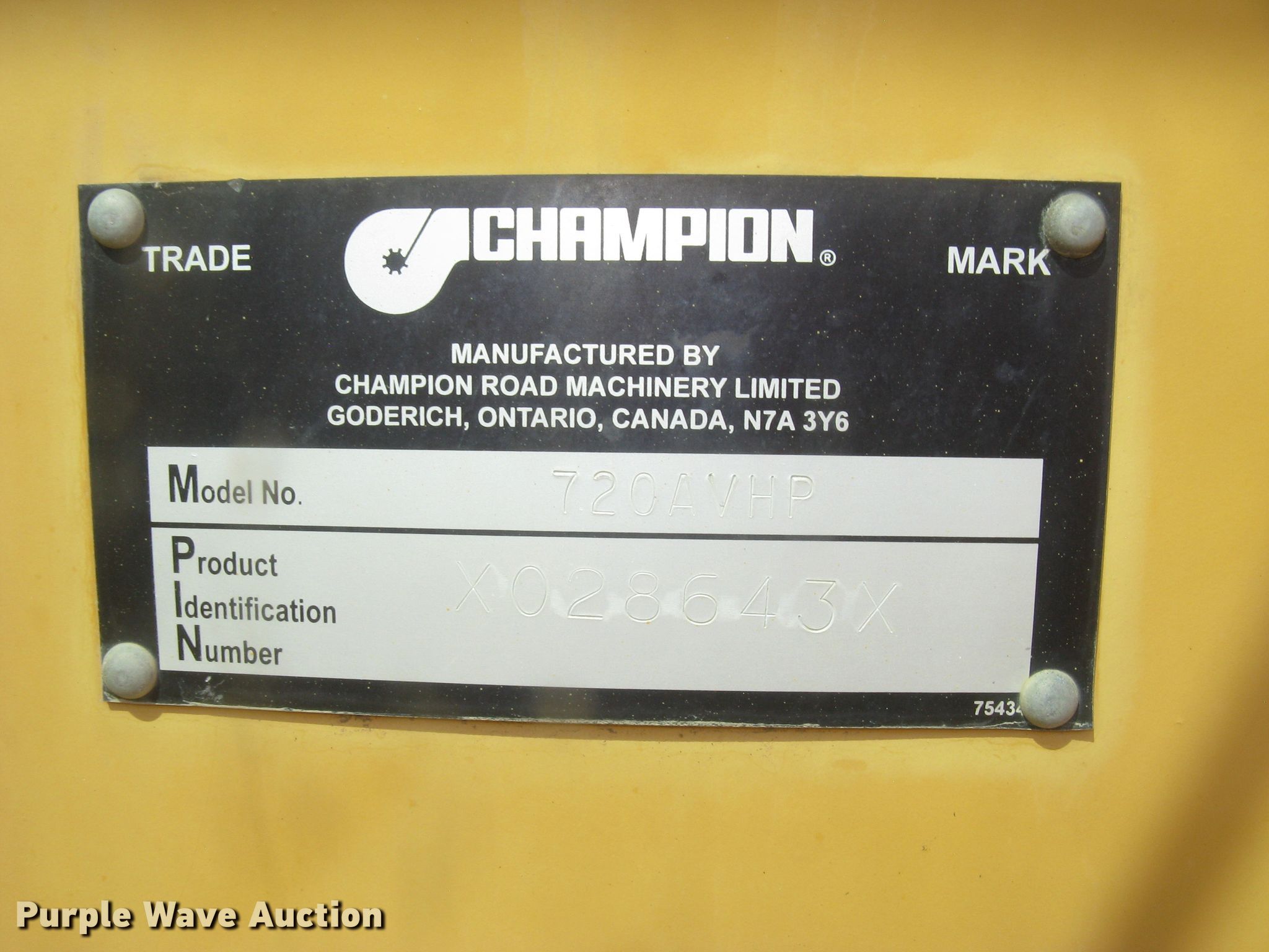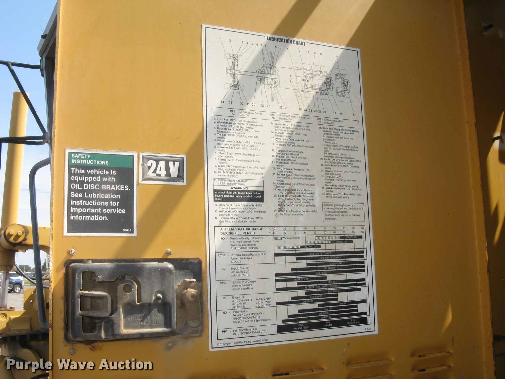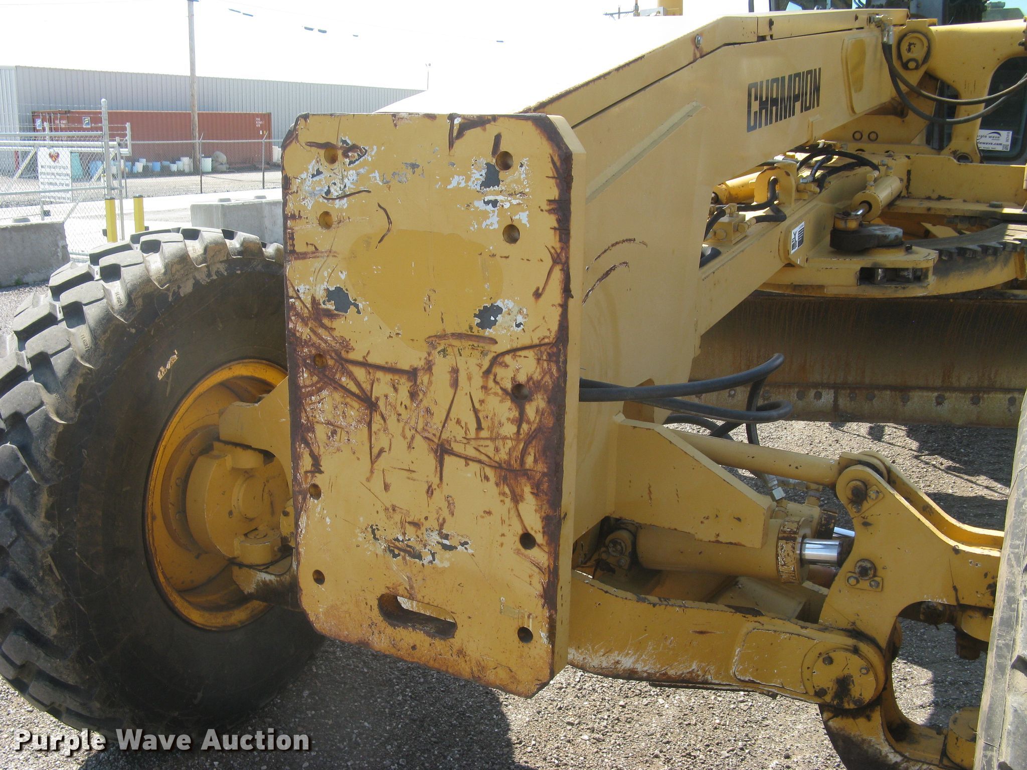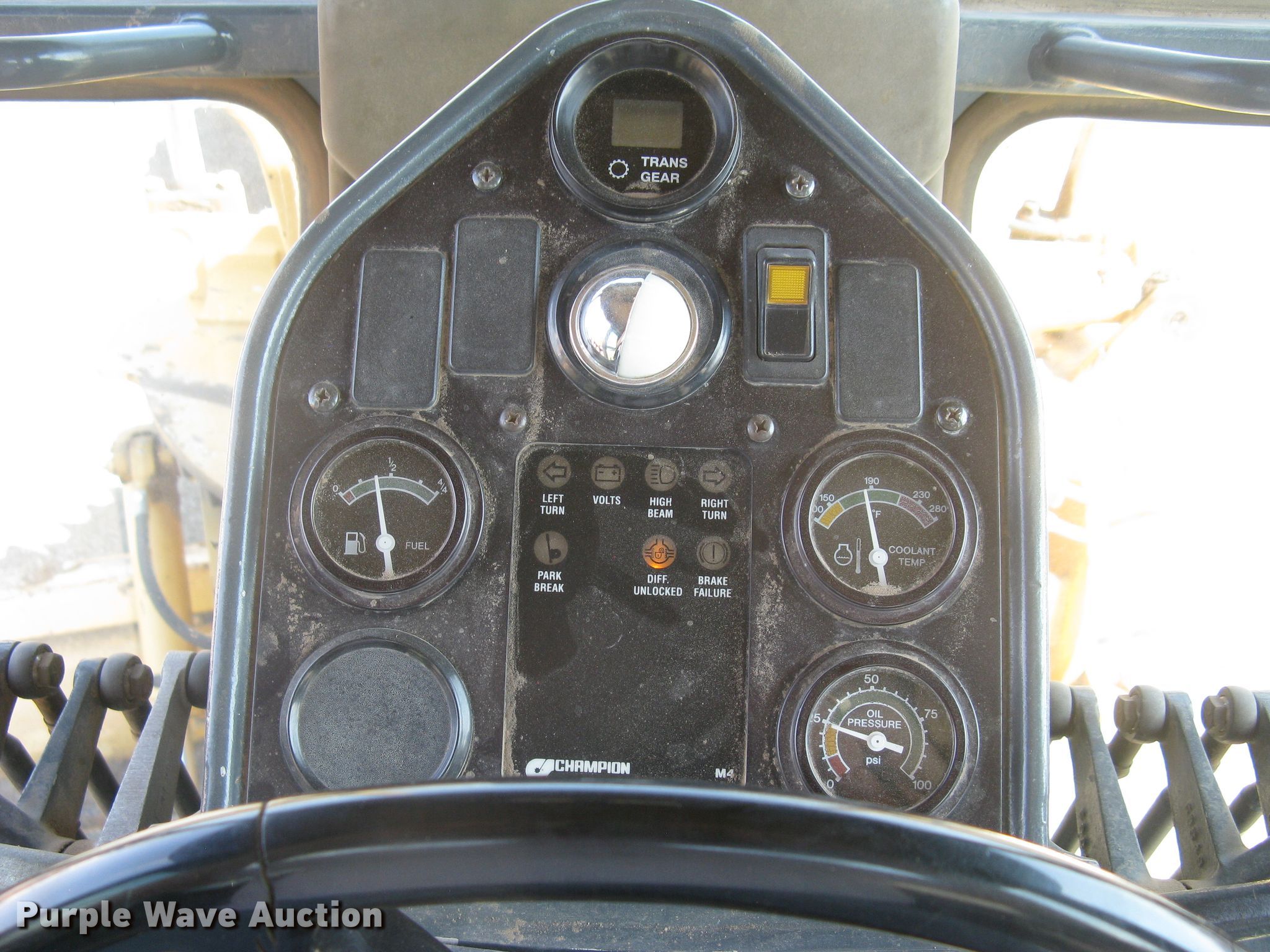 Purple Wave is selling a used Motor Grader in Kansas. This item is a 1998 Champion 720A VHP motor grader with the following: 8,826 hours on meter, Cummins six cylinder diesel engine, Powershift transmission, 8F-4R gears, EROPS, AC and heat, AM/FM, (10 ) hydraulic control valves, 12'W moldboard, Tip control, Side shift, 14.00R24 tires, Serial 028643