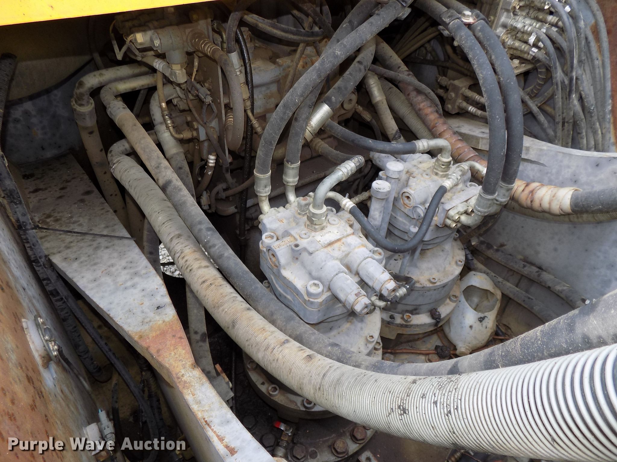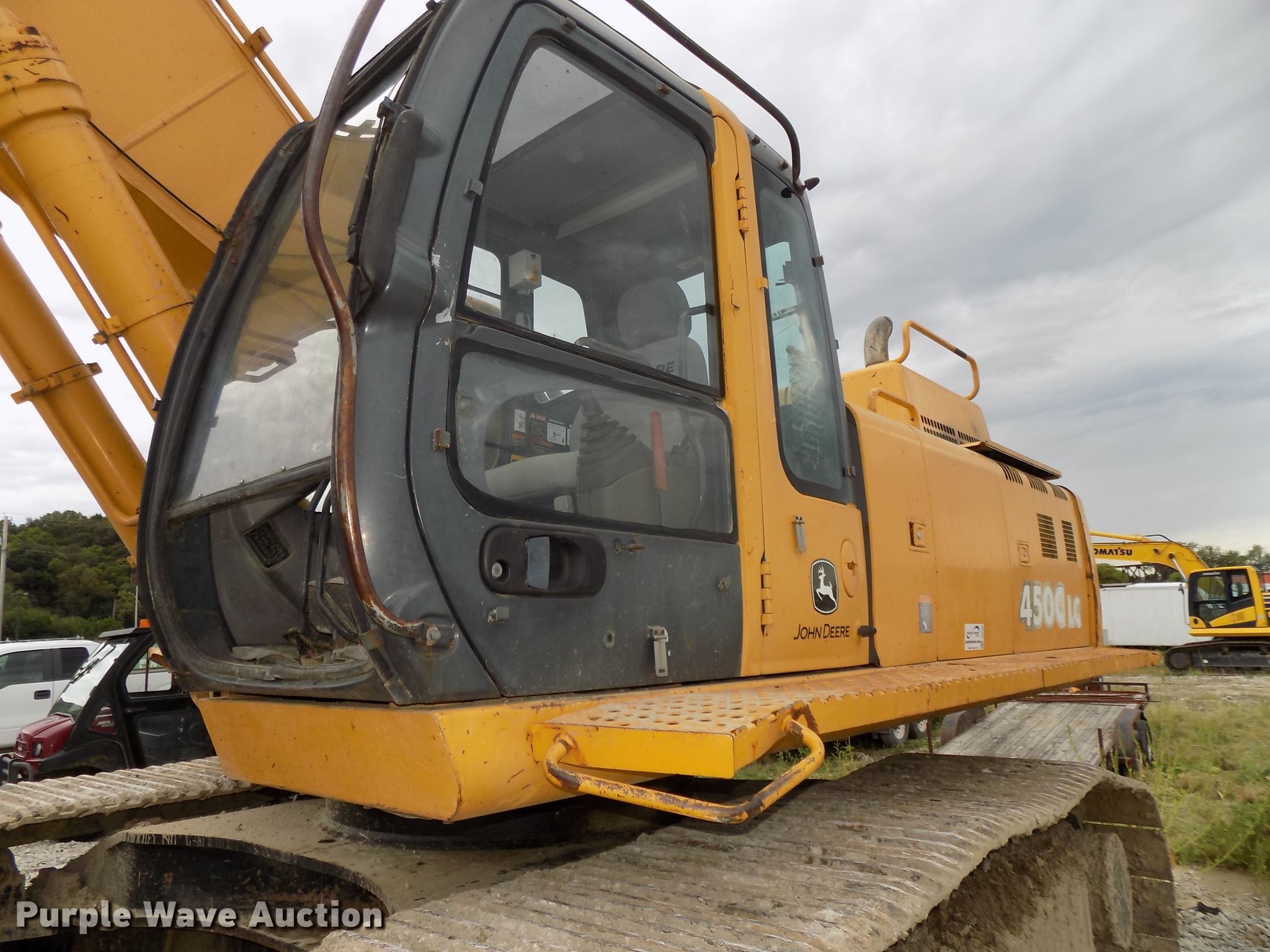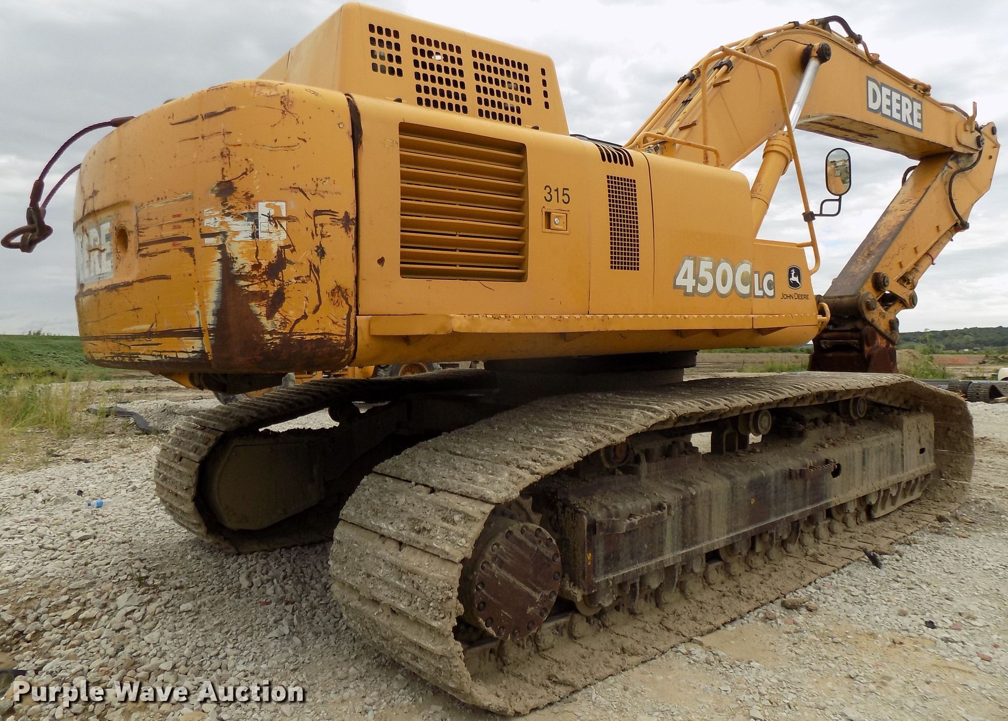 Purple Wave is selling a used Hydraulic Excavator in Iowa. This item is a 2003 John Deere 450C LC excavator with the following: 11,912 hours on meter, John Deere 12.5L six cylinder diesel engine, Two speed hydrostatic transmission, Enclosed cab, AC and heat, AM/FM, Standard boom, 194" stick length, Jib hydraulic quick coupler, Esco 30"W bucket, (4) teeth, 35.5"W steel triple grouser track pads, Glass cracked, Serial FF450CX091332
