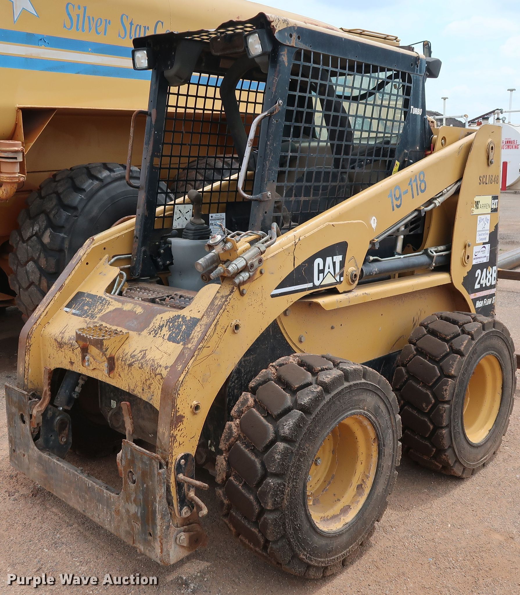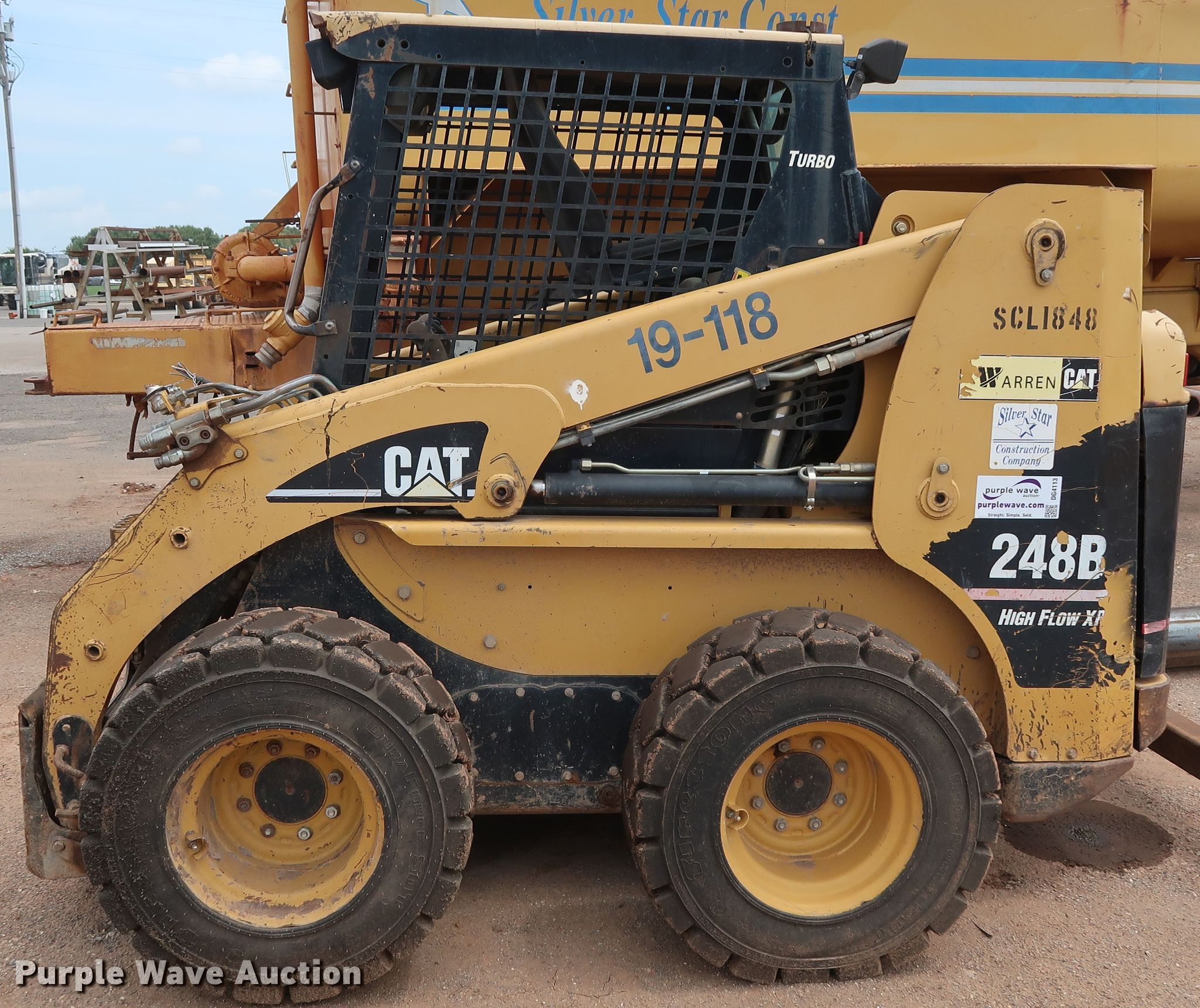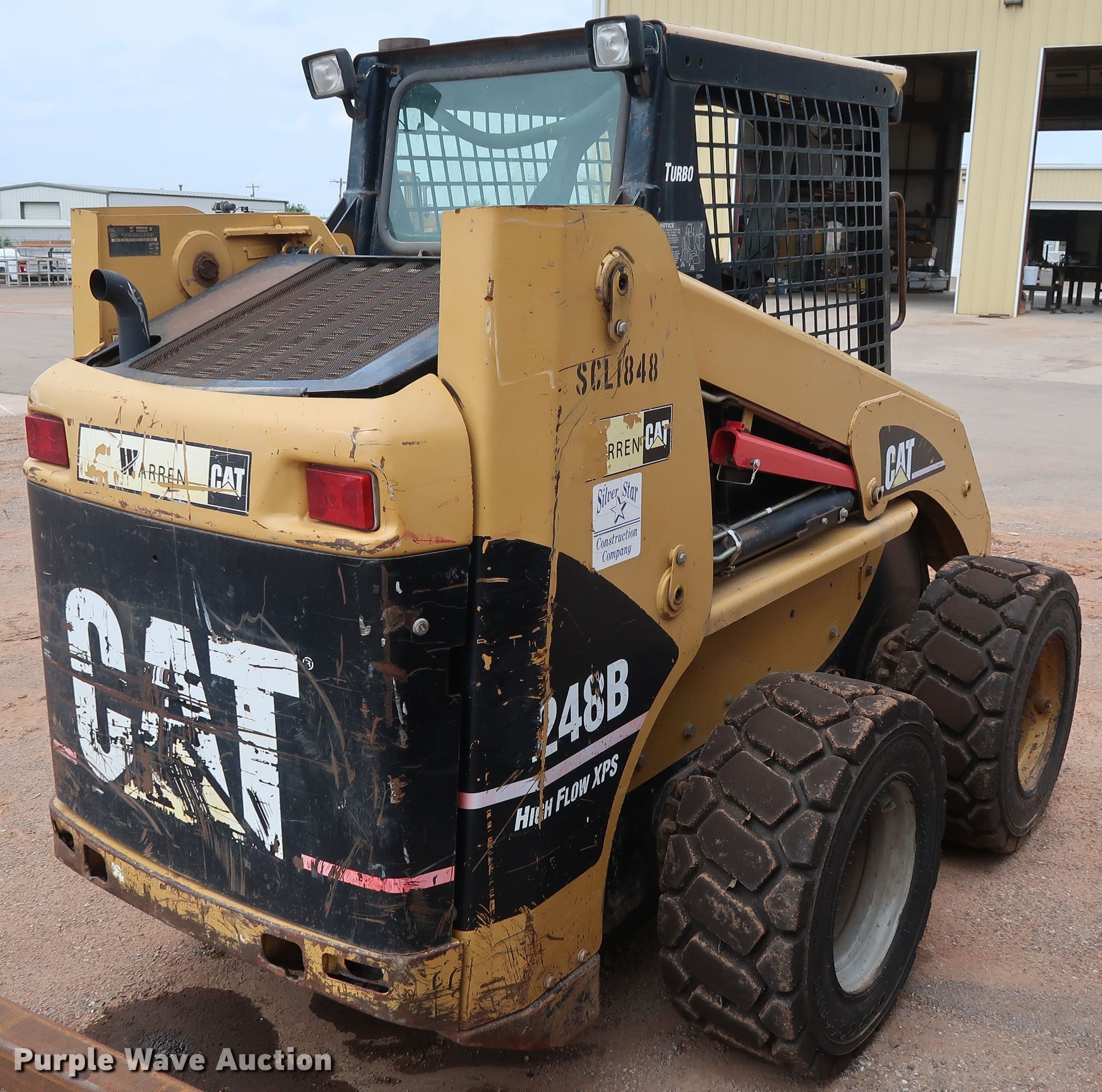 Purple Wave is selling a used Skid Steer Loader in Oklahoma. This item is a 2007 Caterpillar 248B skid steer with the following: 2,006 hours on meter, Caterpillar 3044C 3.3L four cylinder diesel engine, 80 HP, Hydrostatic transmission, Open station/canopy, Hand bucket controls, Manual quick coupler, Auxiliary hydraulics, 305/70D16.5 NHS tires, 12-16.5 NHS tires, Serial CAT0248BVSCL01848, Unit# 19-118