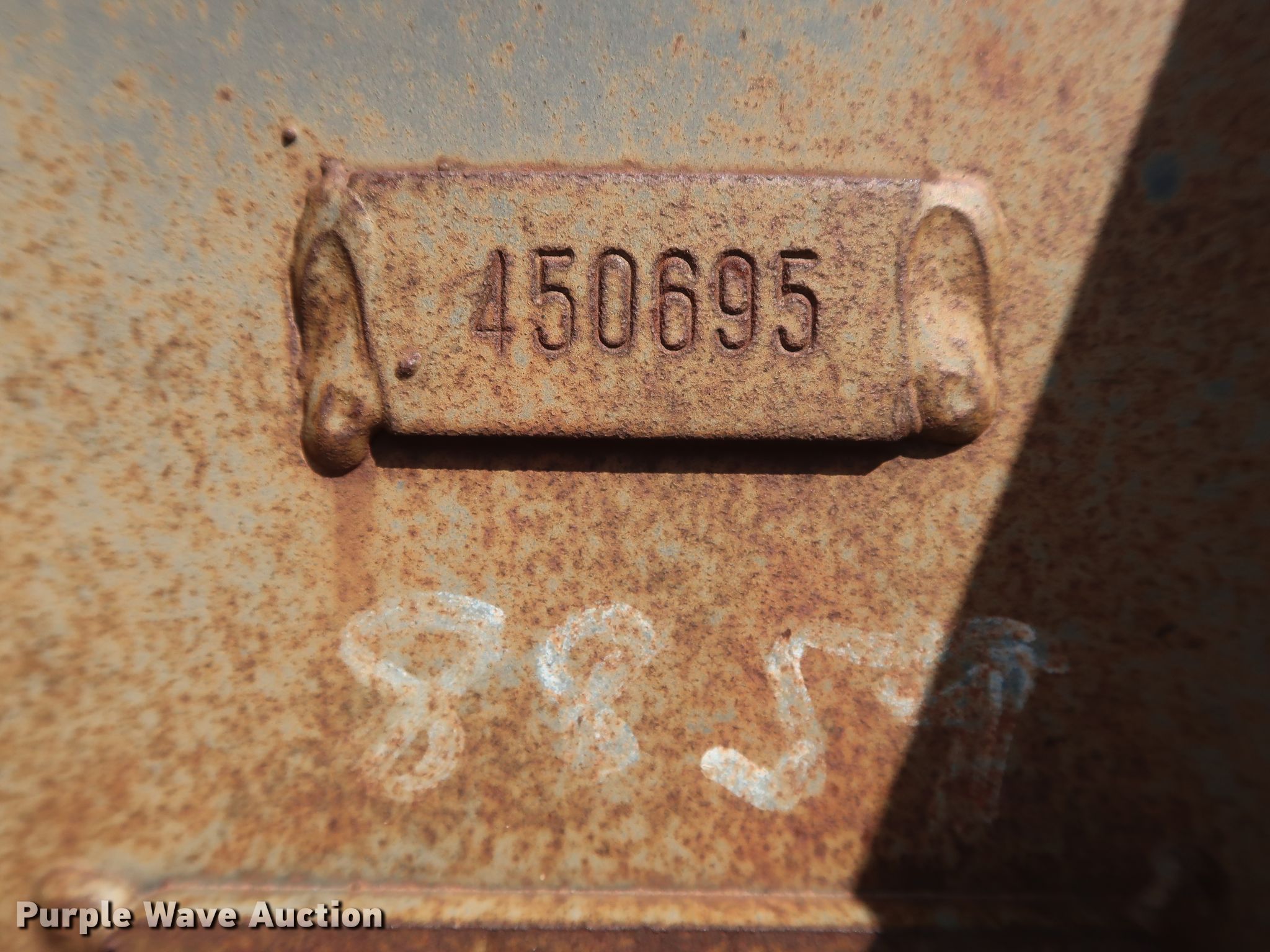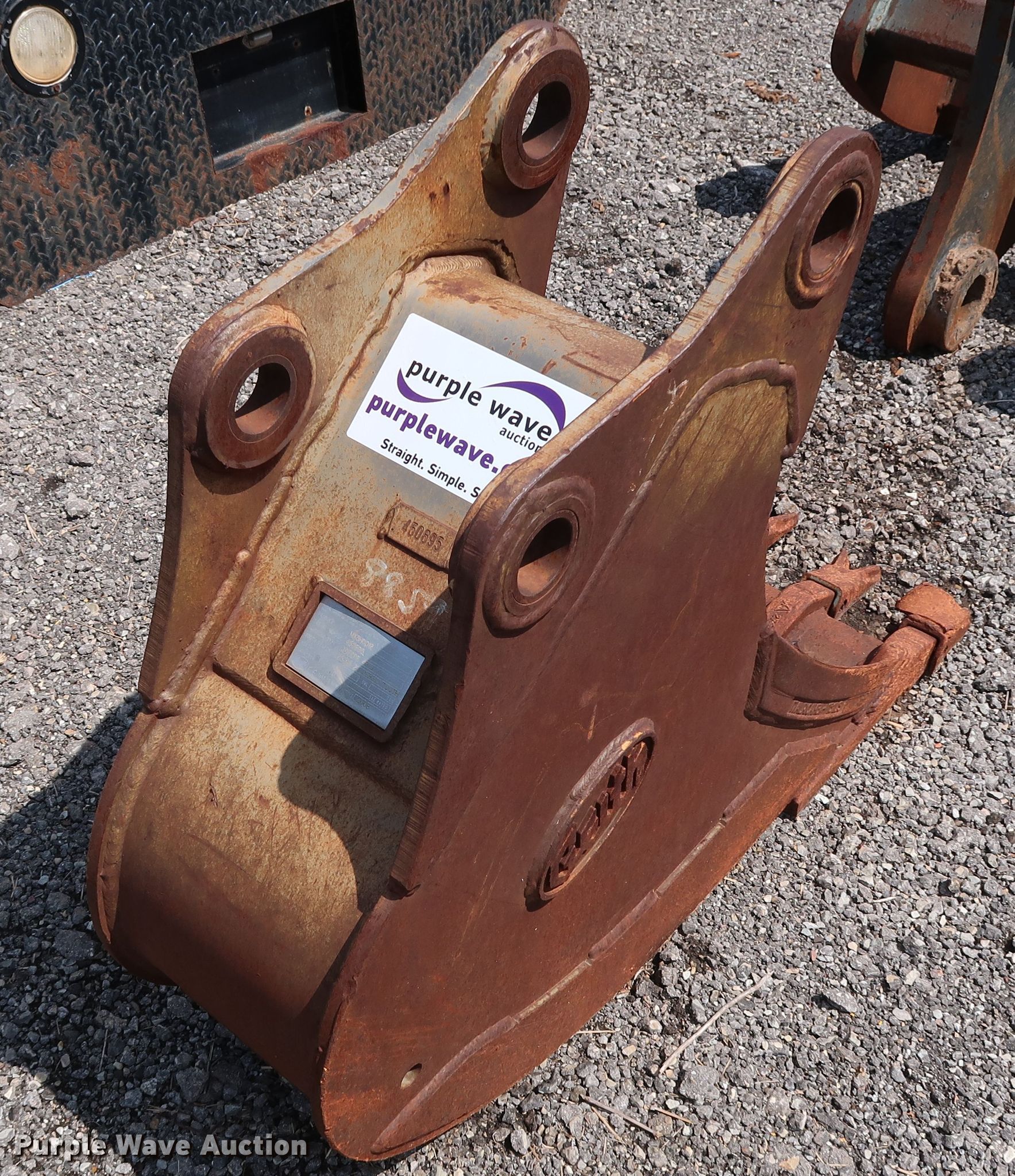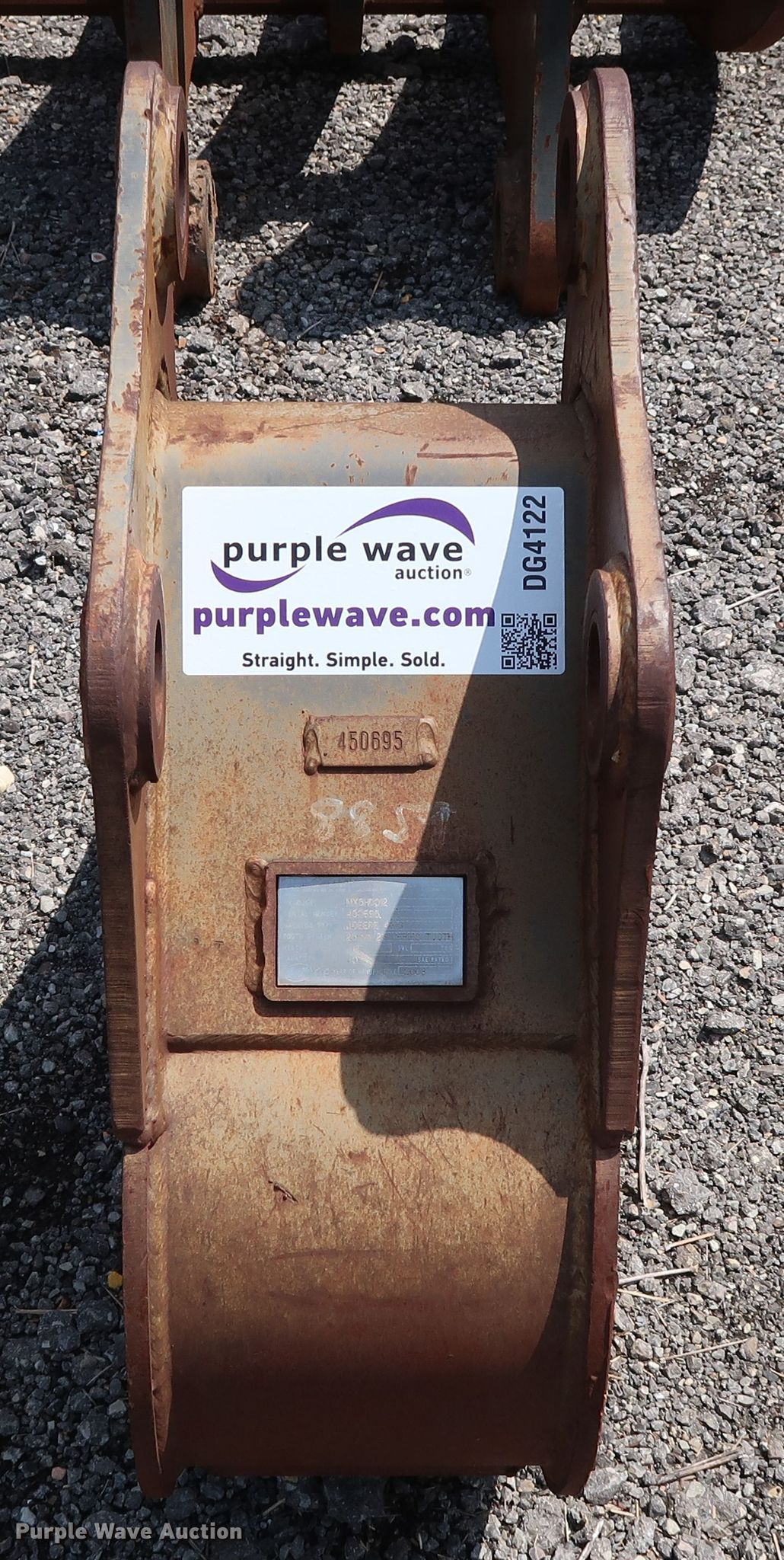 Purple Wave is selling a used Backhoe Attach. in Oklahoma. This item is a Geith 12"W backhoe bucket with the following: (3) bolt-on teeth, 2" pin diameter, 8"W mount clearance, Fits John Deere 410G backhoe, Serial 450695