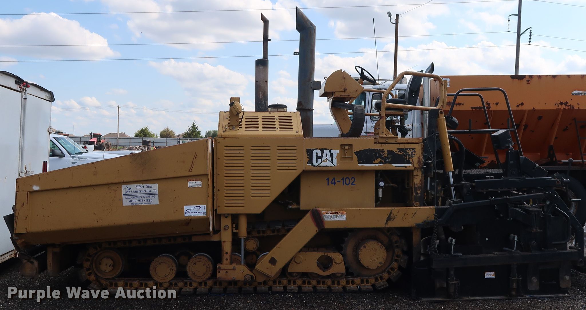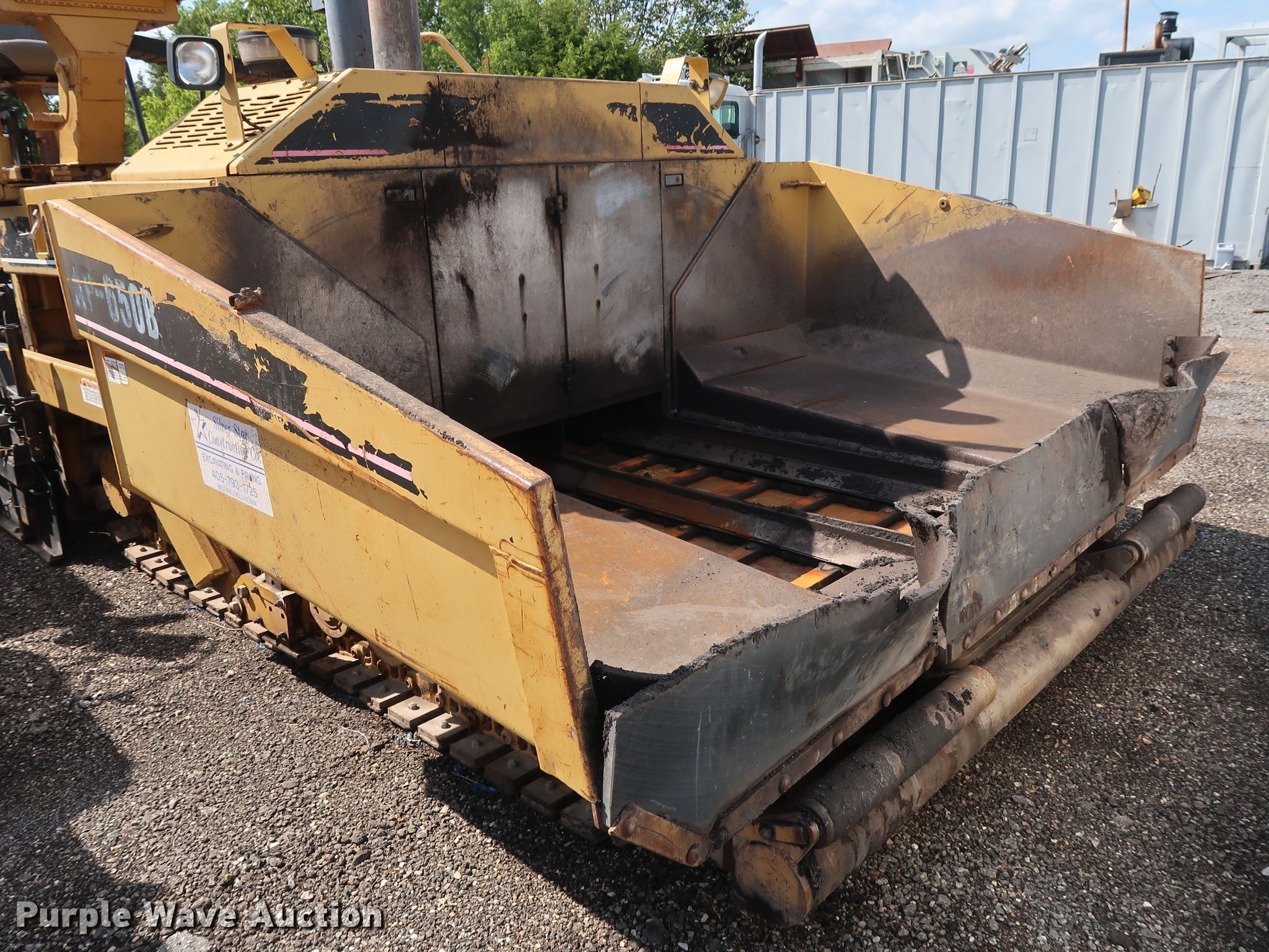 2000 Caterpillar AP-650B paver. 6,910 hours on meter, Perkins 2PKXL039AM1 four cylinder gas engine Serial AM144-6192NT1812006, Hydrostatic transmission, Caterpillar 8-16B screed 8' to 16' paving width, (2) extensions, Serial 7MR02132, 48"W material conveyor, 14"W rubber tracks, Travel issue, Serial 9DN00423, Unit# 14-102. Silver Star Construction Co., Inc.. 2401 S Broadway Ave. Moore, OK 73160