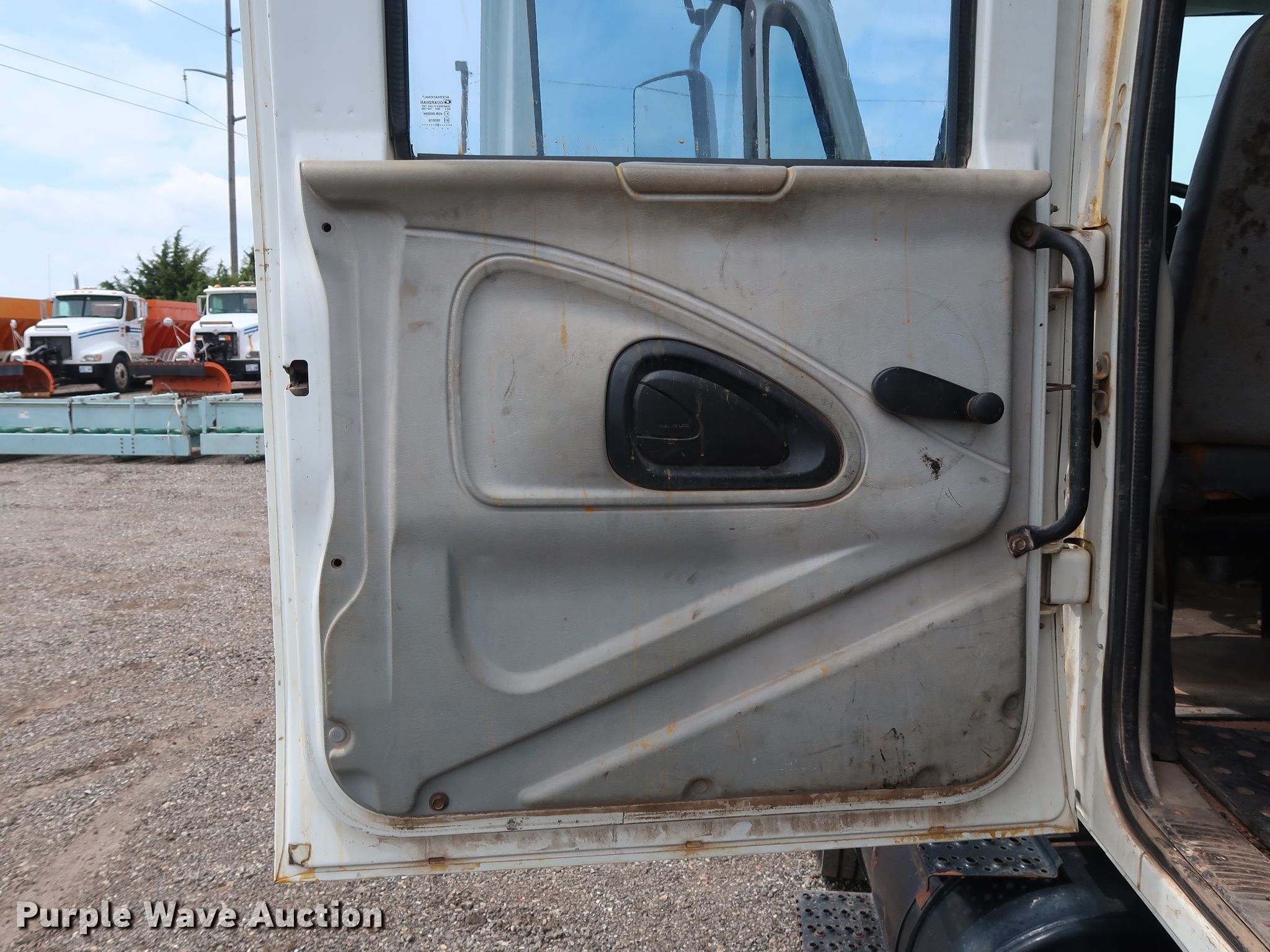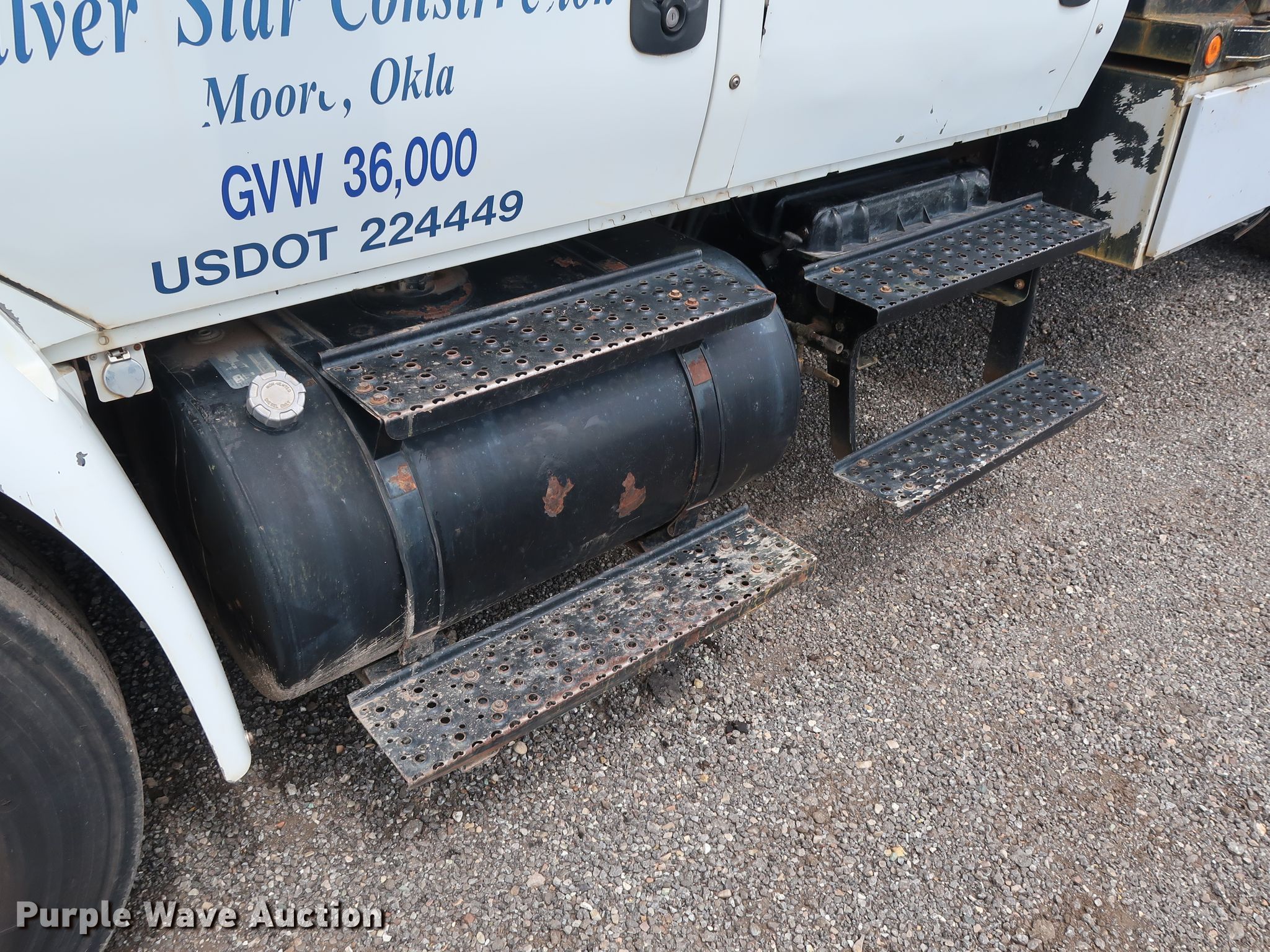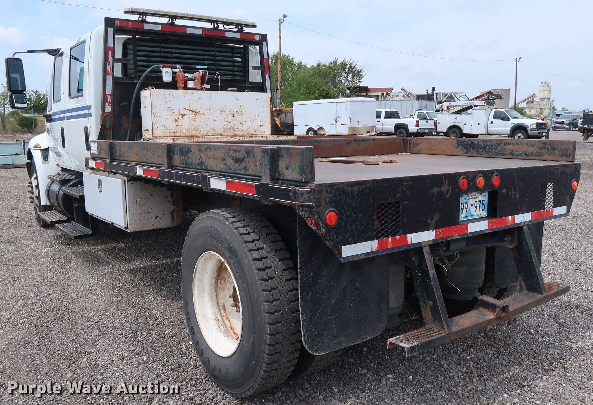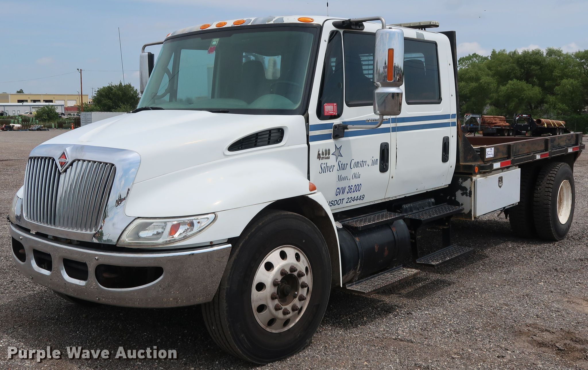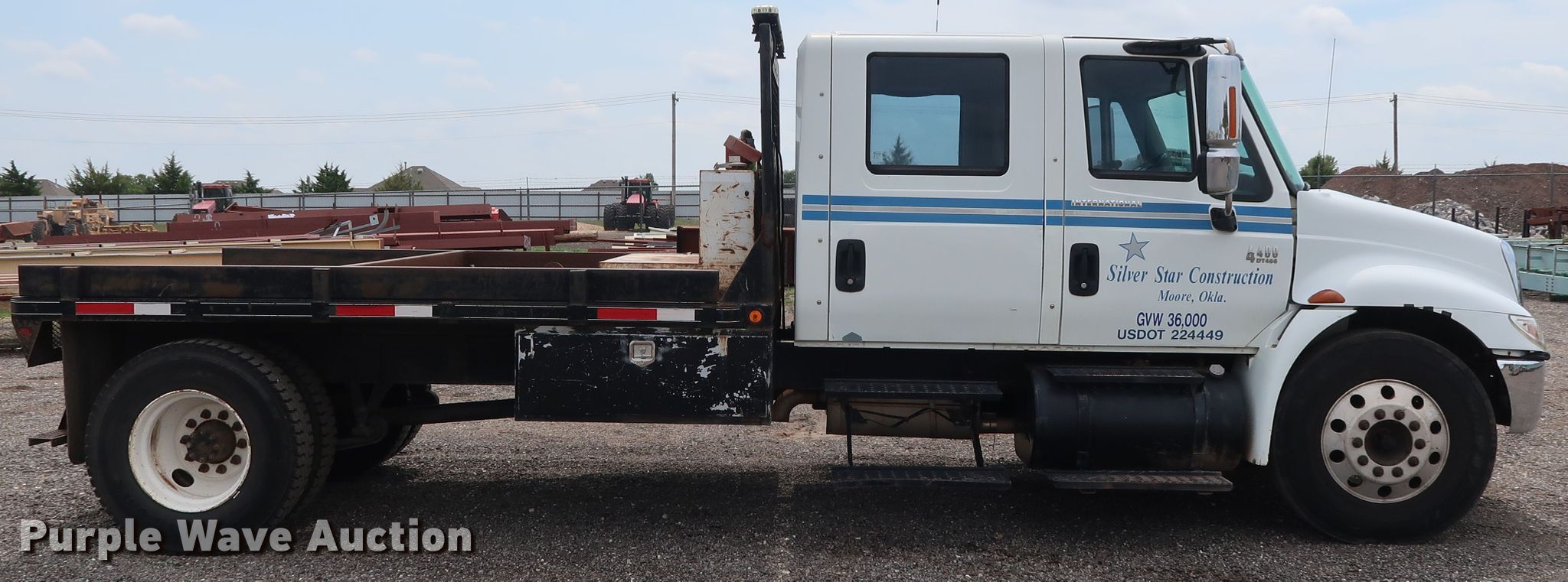 Purple Wave is selling a used Flat Bed Truck in Oklahoma. This item is a 2003 International 4400 Crew Cab flatbed truck with the following: 257,048 miles on odometer, International DT466 7.6L L6 diesel engine, Eaton Fuller six speed manual transmission, Single axle, AC and heat, Heated mirrors, Brake controller, 12'L x 96"W flatbed, Auxiliary fuel tank, 88 gallon capacity, Fill-Rite pump, hose, and nozzle assembly, Air suspension, Hydraulic brakes, 226" wheelbase, Firestone 11R22.5 tires, Unit# 2-139