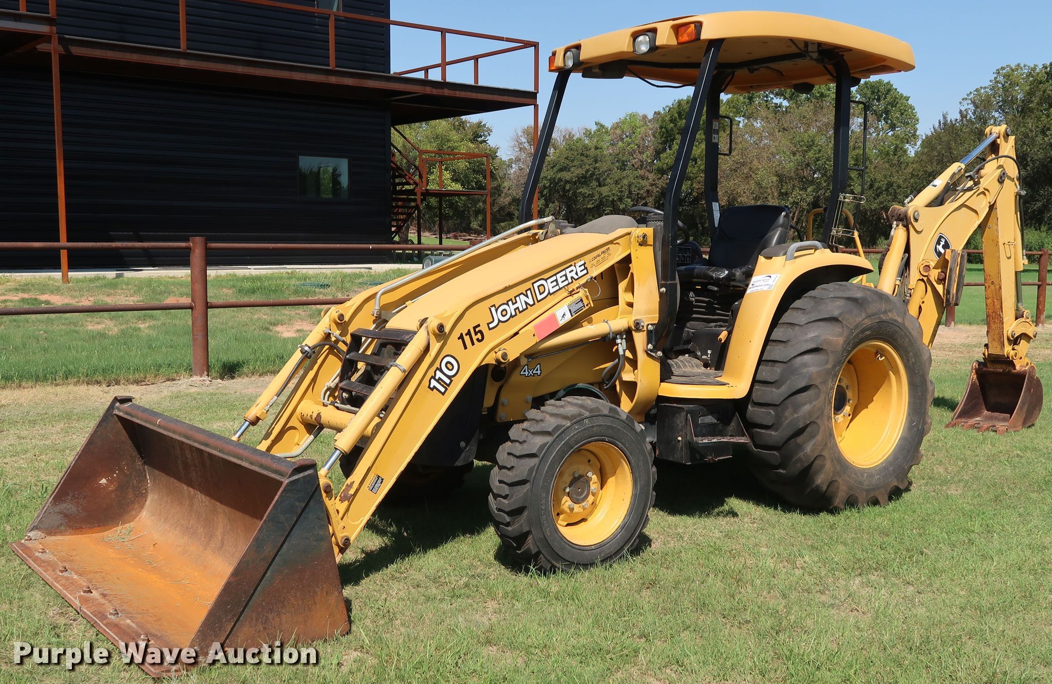 Purple Wave is selling a used Tractor Loader Backhoe in Oklahoma. This item is a 2008 John Deere 110 backhoe with the following: 2,094 hours on meter, Yanmar 4TNV88 2.2L four cylinder diesel engine, 41 HP, Three speed hydrostatic transmission, OROPS, Wobble stick backhoe controls, John Deere Worksite Pro L72 72"W loader bucket, Bolt-on cutting edge, Manual quick coupler, 18"W backhoe bucket, (4) teeth, 10-16.5 NHS front tires, 17.5L-24 rear tires, Serial LV0110T711197, T00110S111810