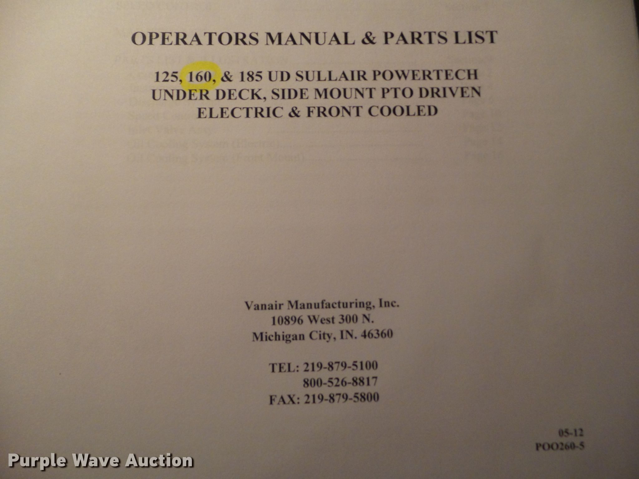 2009 Vanair UDSM air compressor. 186 hours on meter, 100 to 150 PTO, 160 CFM, Serial 200903110056. Jensen Construction. 5550 NE 22nd St. Des Moines, IA 50316