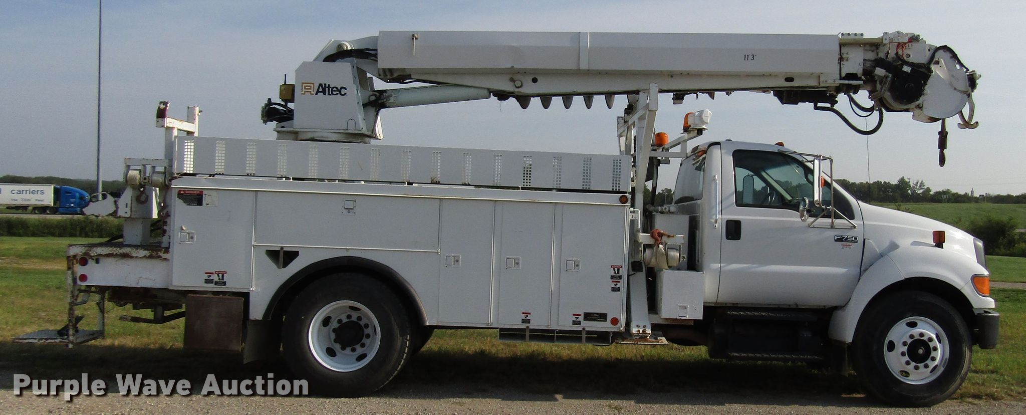 2008 Ford F750 Super Duty digger derrick truck. 107,723 miles on odometer, Caterpillar C7 7.2L L6 diesel engine, Allison automatic transmission, Single axle, AC and heat, PTO, Altec 17.5'L utility bed Serial 37-11194772, 2008 Altec DM45BR insulated, telescopic boom 35' boom length, Ground controls Remote control, Material handler, Pole guide, 18" diameter auger, Serial 0608DV3610, Winch 15,000 lbs capacity, Air brakes, Spring suspension , GVWR 33,000 lbs, 11R22.5 tires. Kansas title. Seller is a licensed motor vehicle dealer. Purple Wave Inc will collect sales tax from Kansas buyers. Title distribution may be delayed up to 30 days from verification of funds. 3FRXF75V48V084341. Reed Company, LLC. 2738 Fauna Rd NW. Lebo, KS 66856