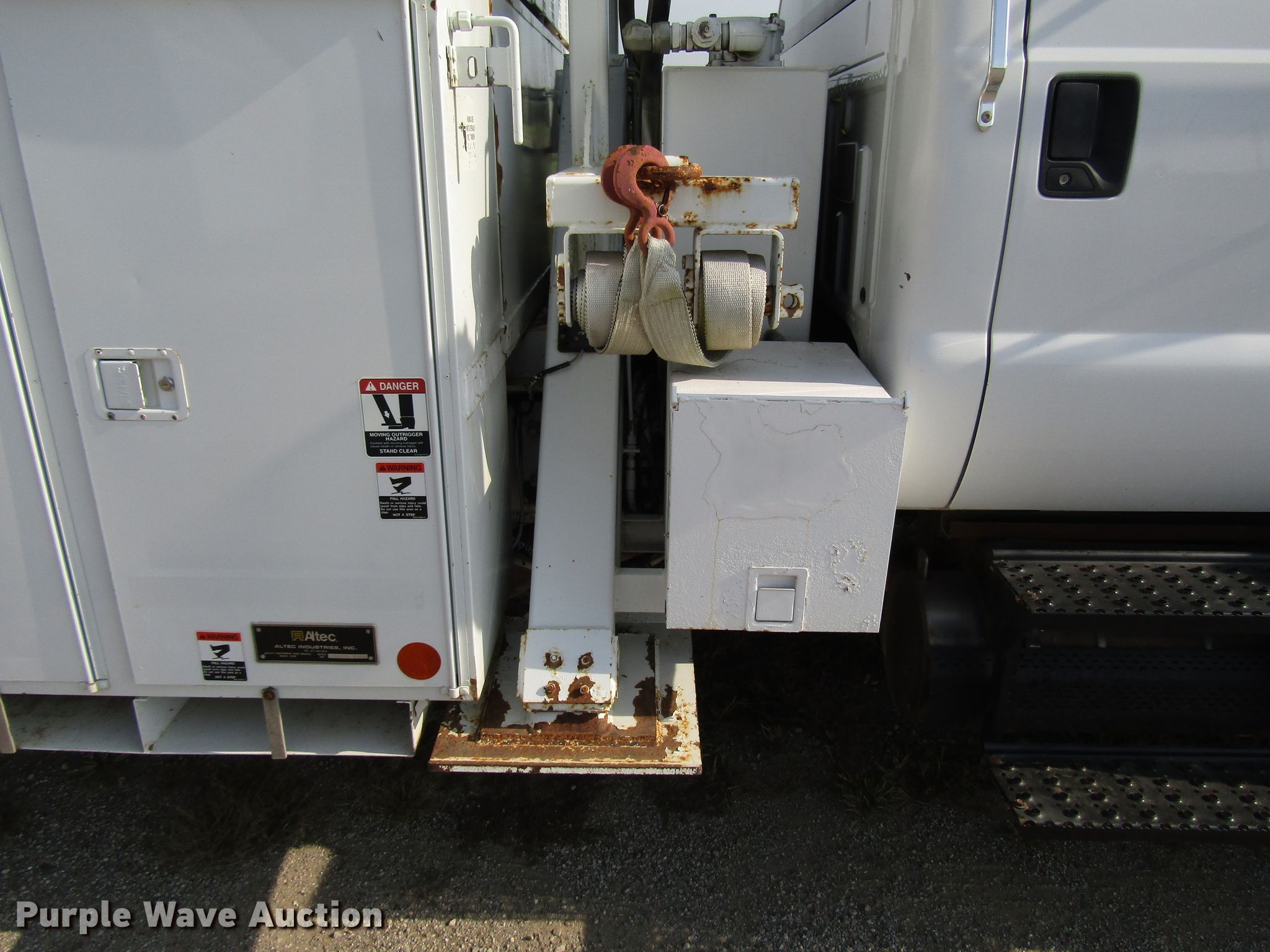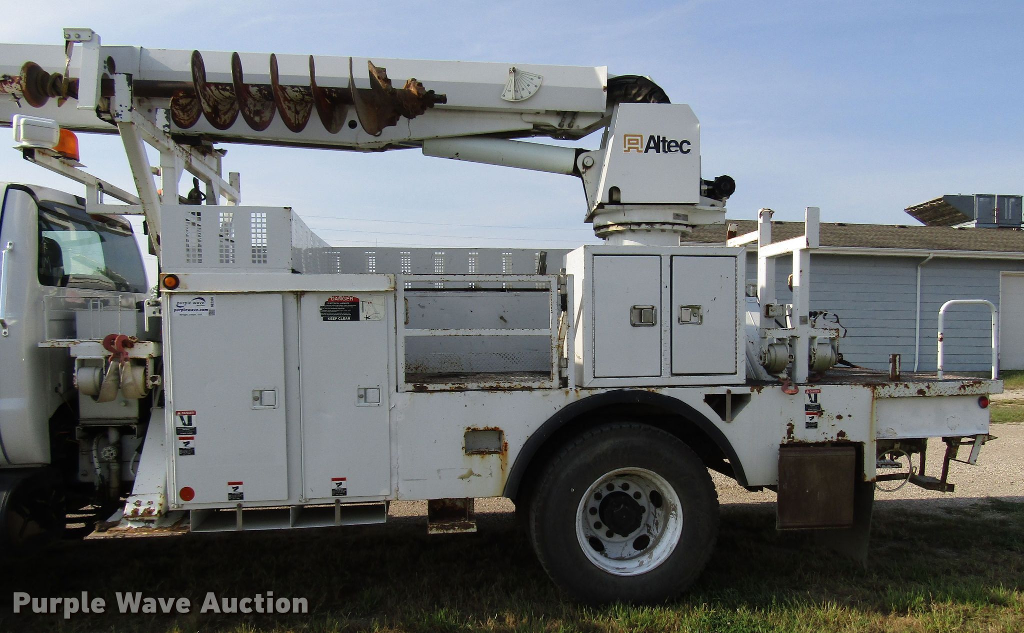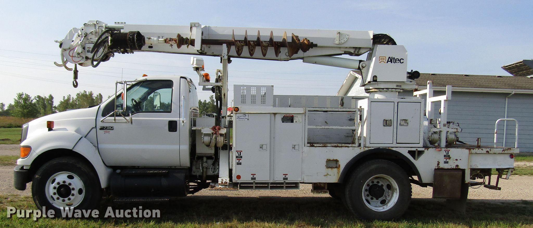 Purple Wave is selling a used Digger Derrick Truck in Kansas. This item is a 2008 Ford F750 Super Duty digger derrick truck with the following: 107,723 miles on odometer, Caterpillar C7 7.2L L6 diesel engine, Allison automatic transmission, Single axle, AC and heat, PTO, Altec 17.5'L utility bed, Serial 37-11194772, 2008 Altec DM45BR insulated, telescopic boom, 35' boom length, Ground controls, Remote control, Material handler, Pole guide, 18" diameter auger, Serial 0608DV3610, Winch, 15,000 lbs capacity, Air brakes, Spring suspension, GVWR 33,000 lbs, 11R22.5 tires