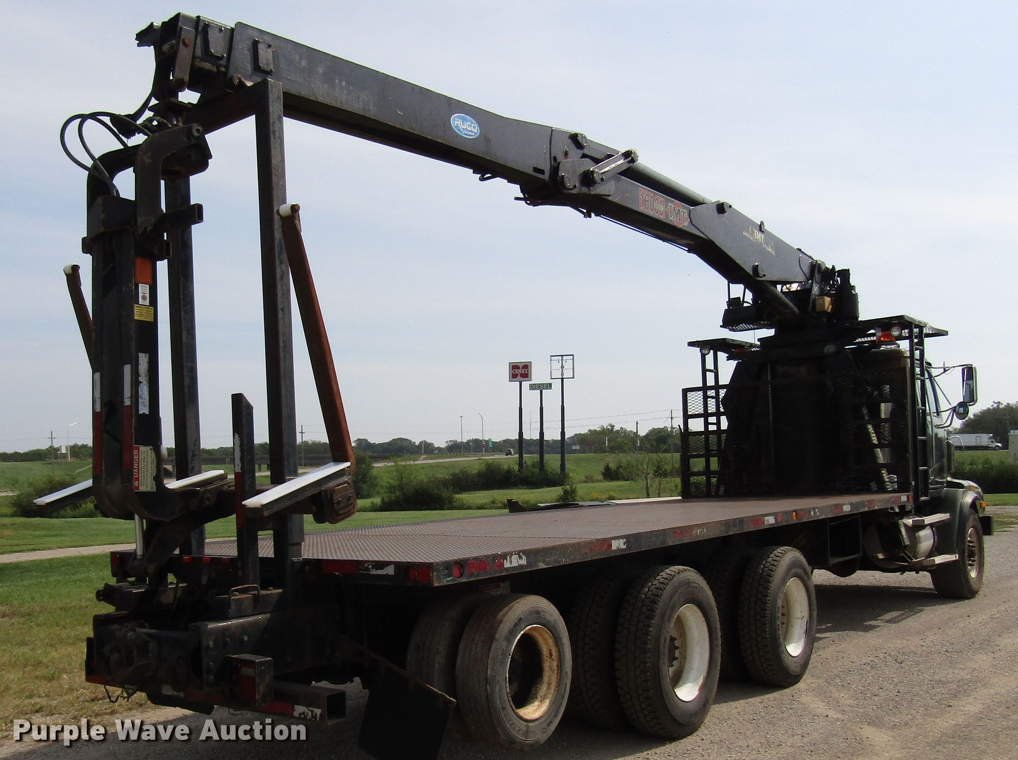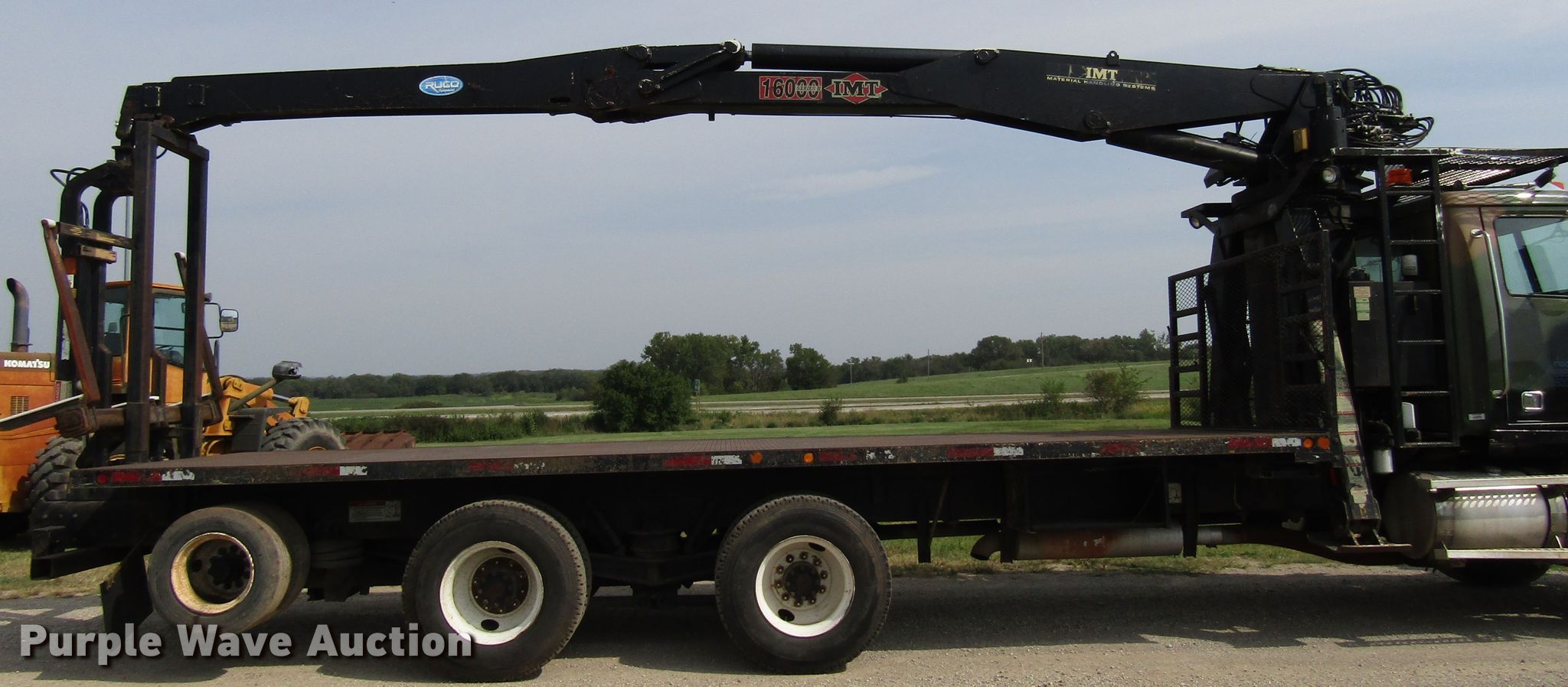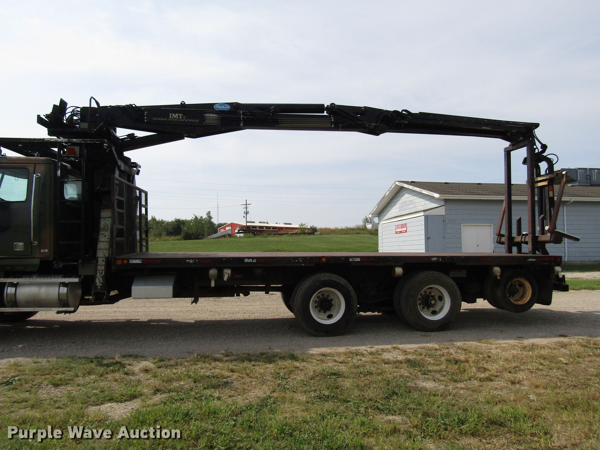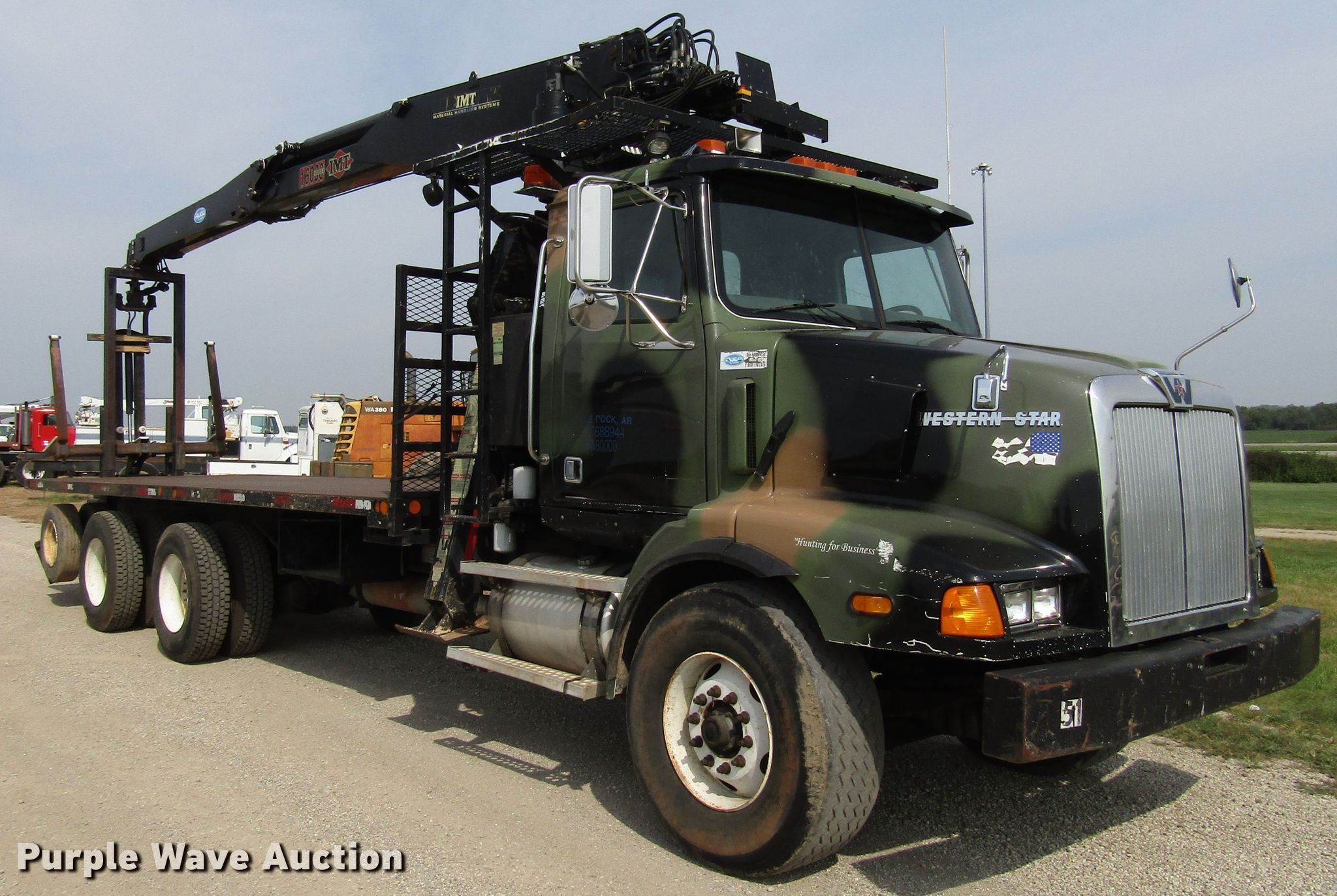 Purple Wave is selling a used Crane Truck in Kansas. This item is a 2004 Western Star crane truck with the following: 4,753 hours on meter, Mercedes Benz six cylinder diesel engine, 435 HP, Eaton Fuller 10 speed manual transmission, Tandem axle, Inter-axle differential lock, AC and heat, 24'7"L flatbed, 2003 IMT 16000S telescopic, knuckle boom crane, Three section boom, 42' boom length, 5,825 lbs maximum lift capacity, 54'3" maximum lift height, Platform controls, 44"L forks, Air brakes, 425/65R22.5 front tries, 215/75R17.5 tag axle tires, 11R22.5 rear tires, GVWR 66,000 lbs, FAWR 20,000 lbs, IAWR 23,000 lbs, RAWR 23,000 lbs