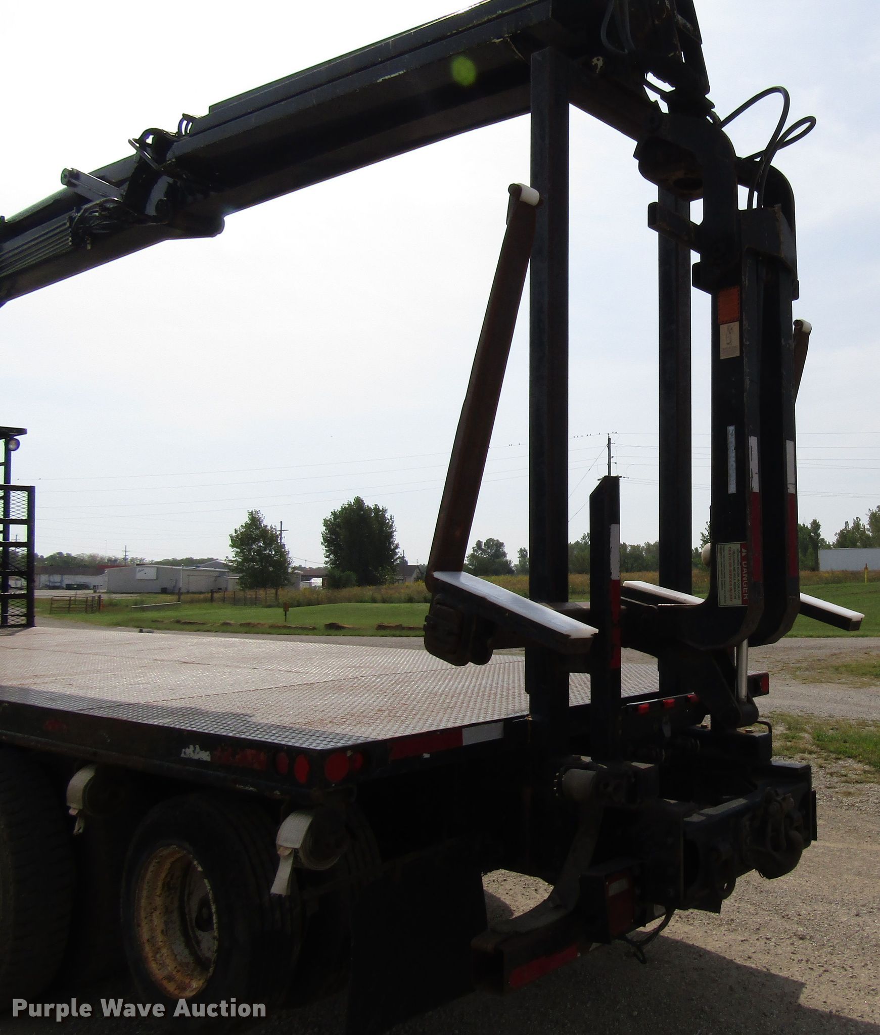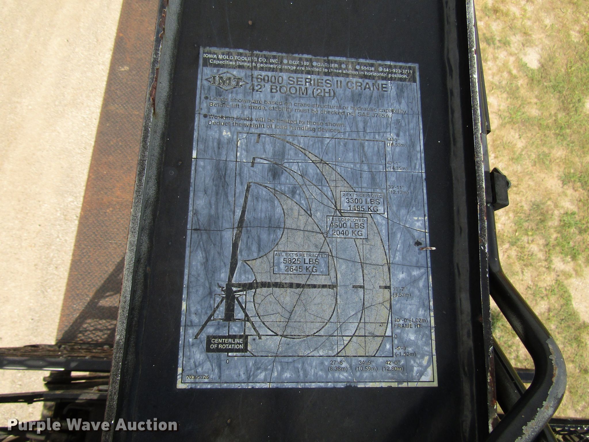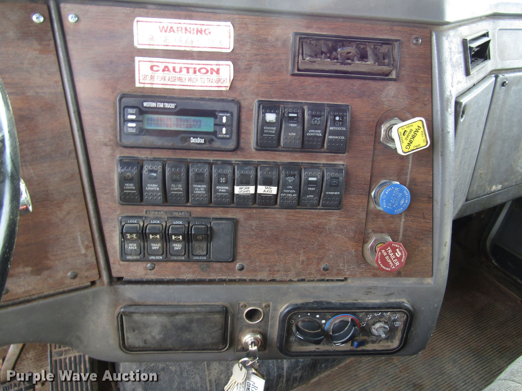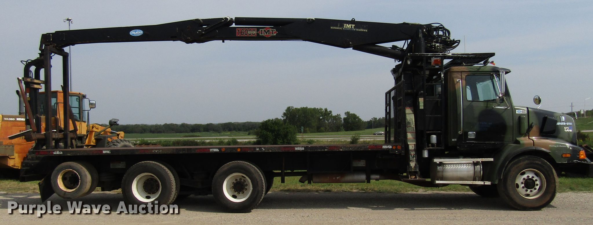 Purple Wave is selling a used Crane Truck in Kansas. This item is a 2004 Western Star crane truck with the following: 4,753 hours on meter, Mercedes Benz six cylinder diesel engine, 435 HP, Eaton Fuller 10 speed manual transmission, Tandem axle, Inter-axle differential lock, AC and heat, 24'7"L flatbed, 2003 IMT 16000S telescopic, knuckle boom crane, Three section boom, 42' boom length, 5,825 lbs maximum lift capacity, 54'3" maximum lift height, Platform controls, 44"L forks, Air brakes, 425/65R22.5 front tries, 215/75R17.5 tag axle tires, 11R22.5 rear tires, GVWR 66,000 lbs, FAWR 20,000 lbs, IAWR 23,000 lbs, RAWR 23,000 lbs