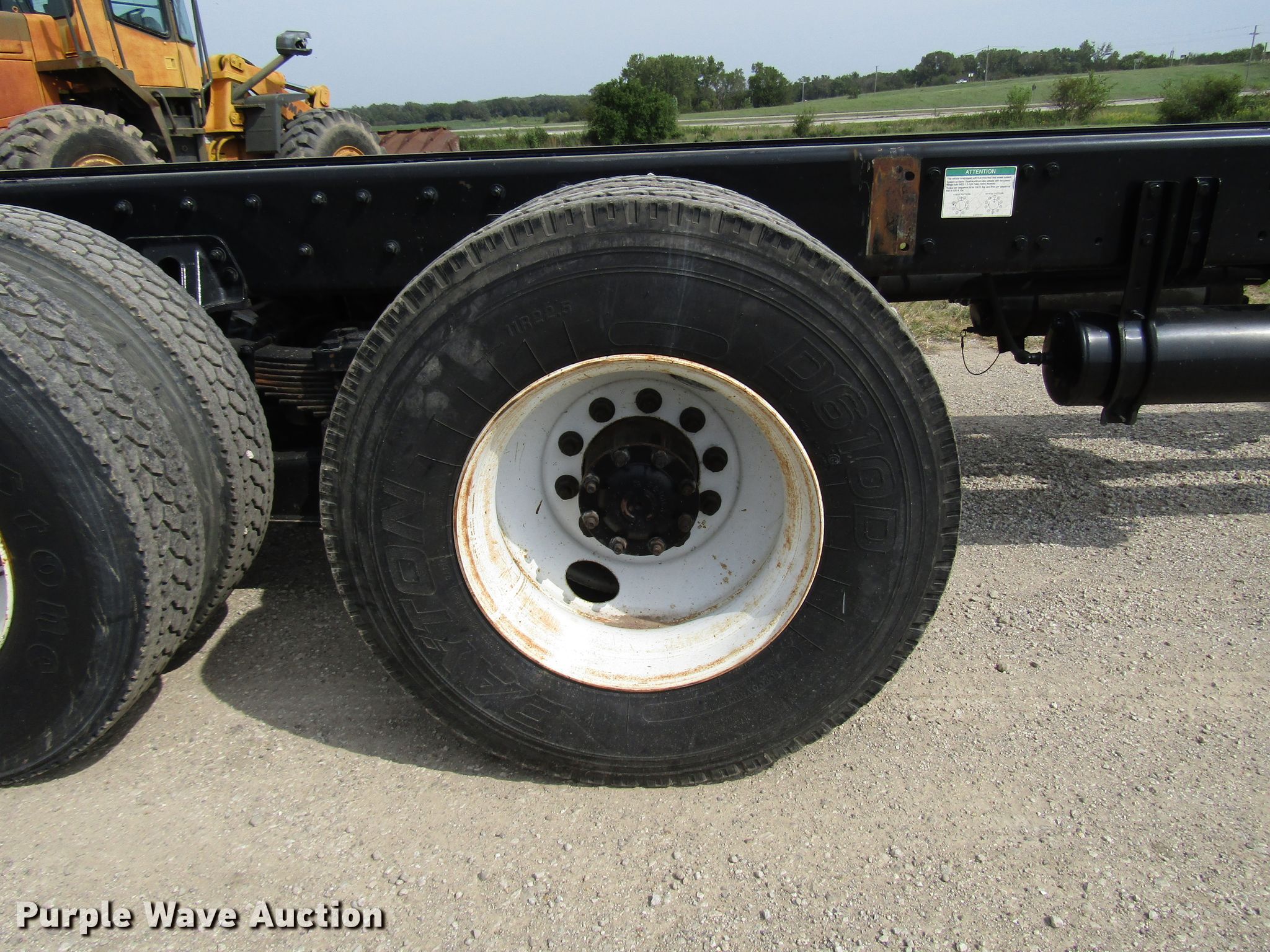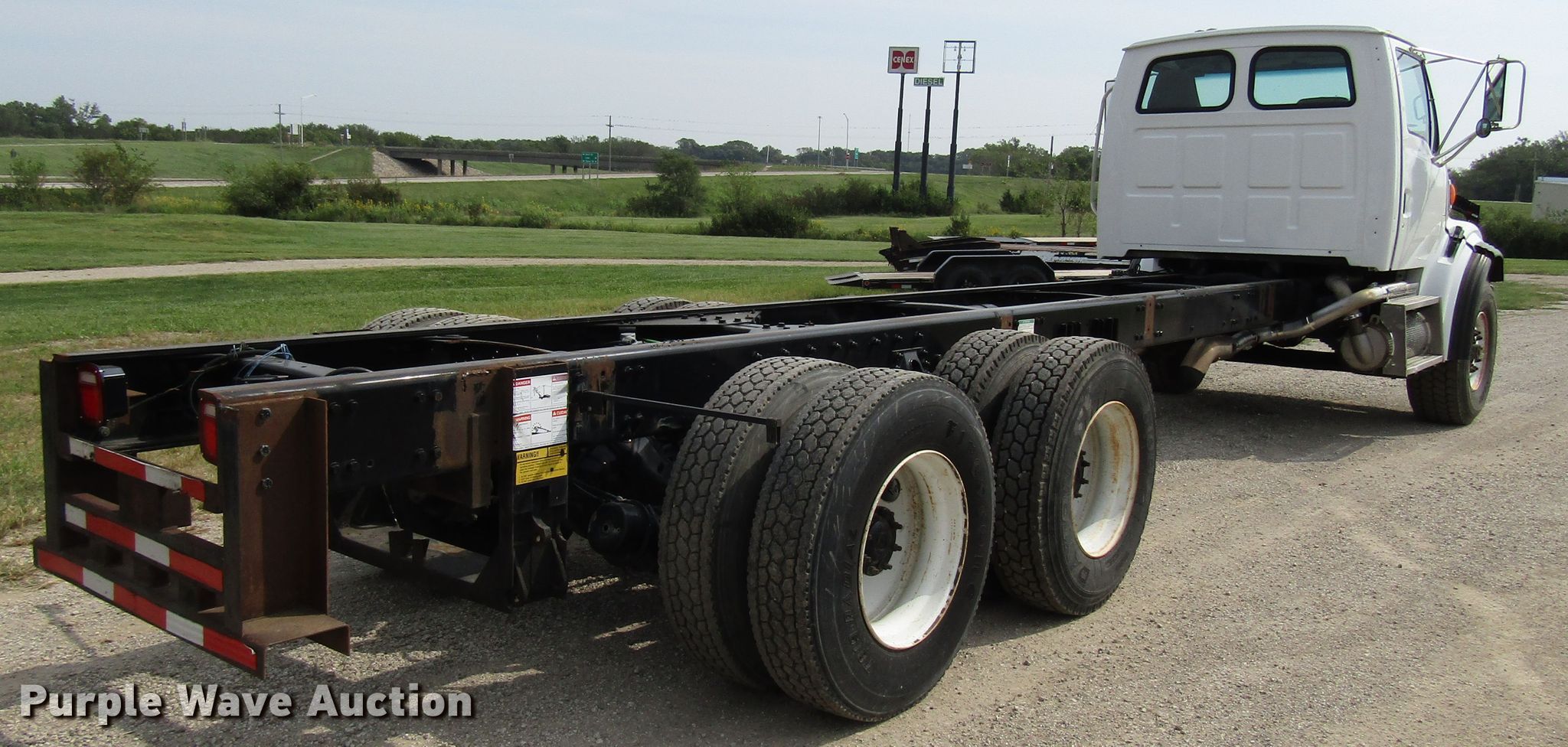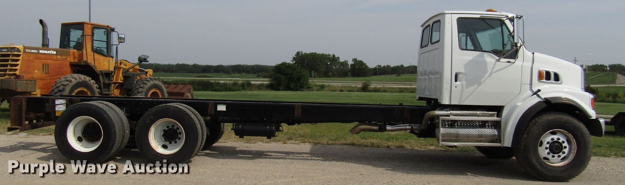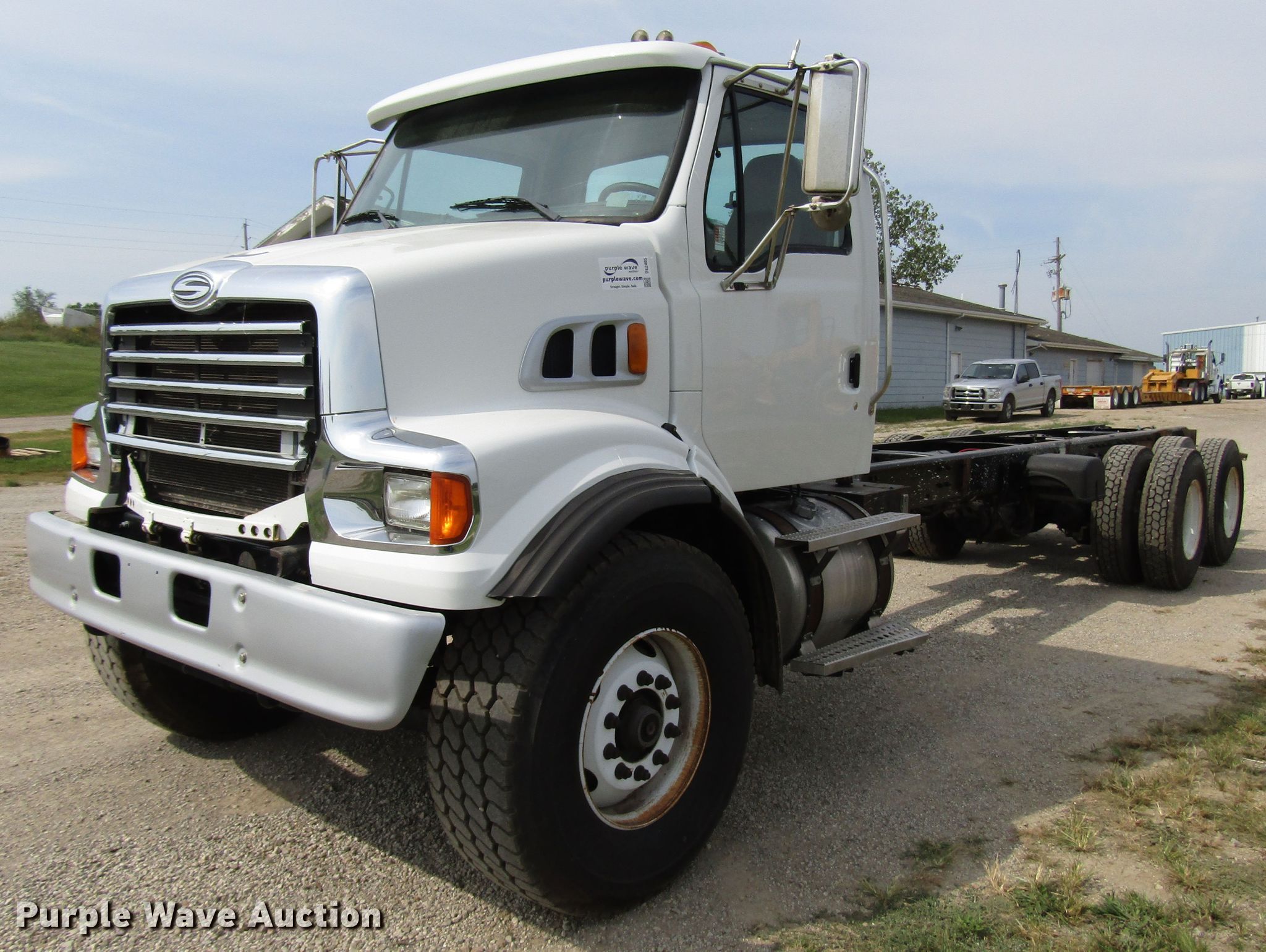 Purple Wave is selling a used Truck Chassis in Kansas. This item is a 2008 Sterling truck cab and chassis with the following: 211,637 miles on odometer, 11,120 hours on meter, Cummins six cylinder diesel engine, Eaton Fuller nine speed manual transmission, Tandem axle, Inter-axle differential lock, Full differential lock, AC and heat, PTO, 24'4"L from rear of cab to end of frame, Spring over walking beam, Air brakes, 273" wheel base, 425/65R22.5 front tires, 11R22.5 rear tires, GVWR 59,950 lbs, FAWR 20,000 lbs, IAWR 19,975 lbs, RAWR 19,975 lbs