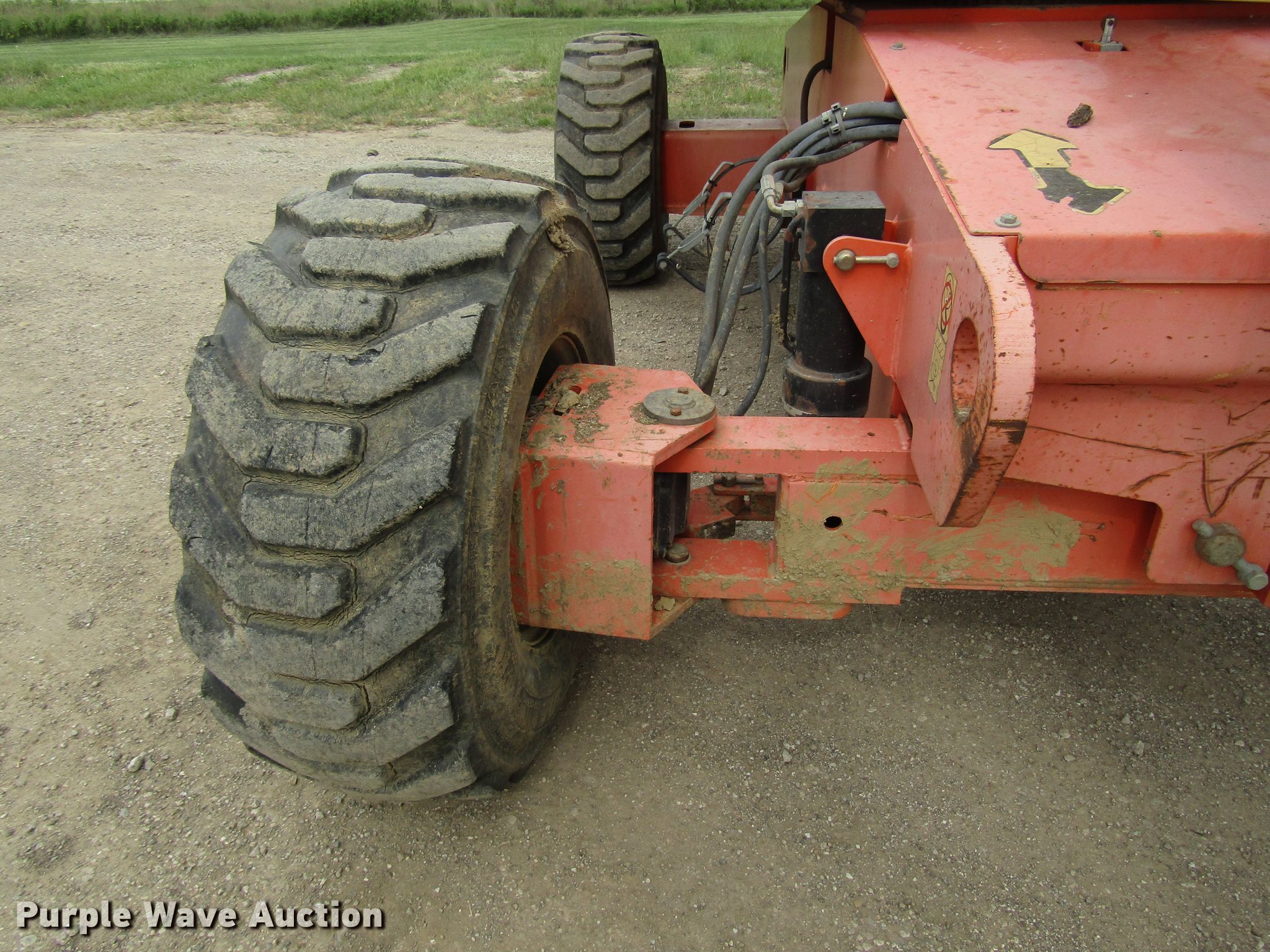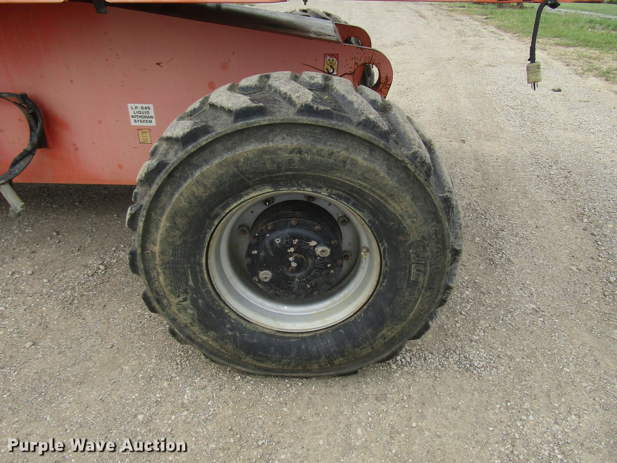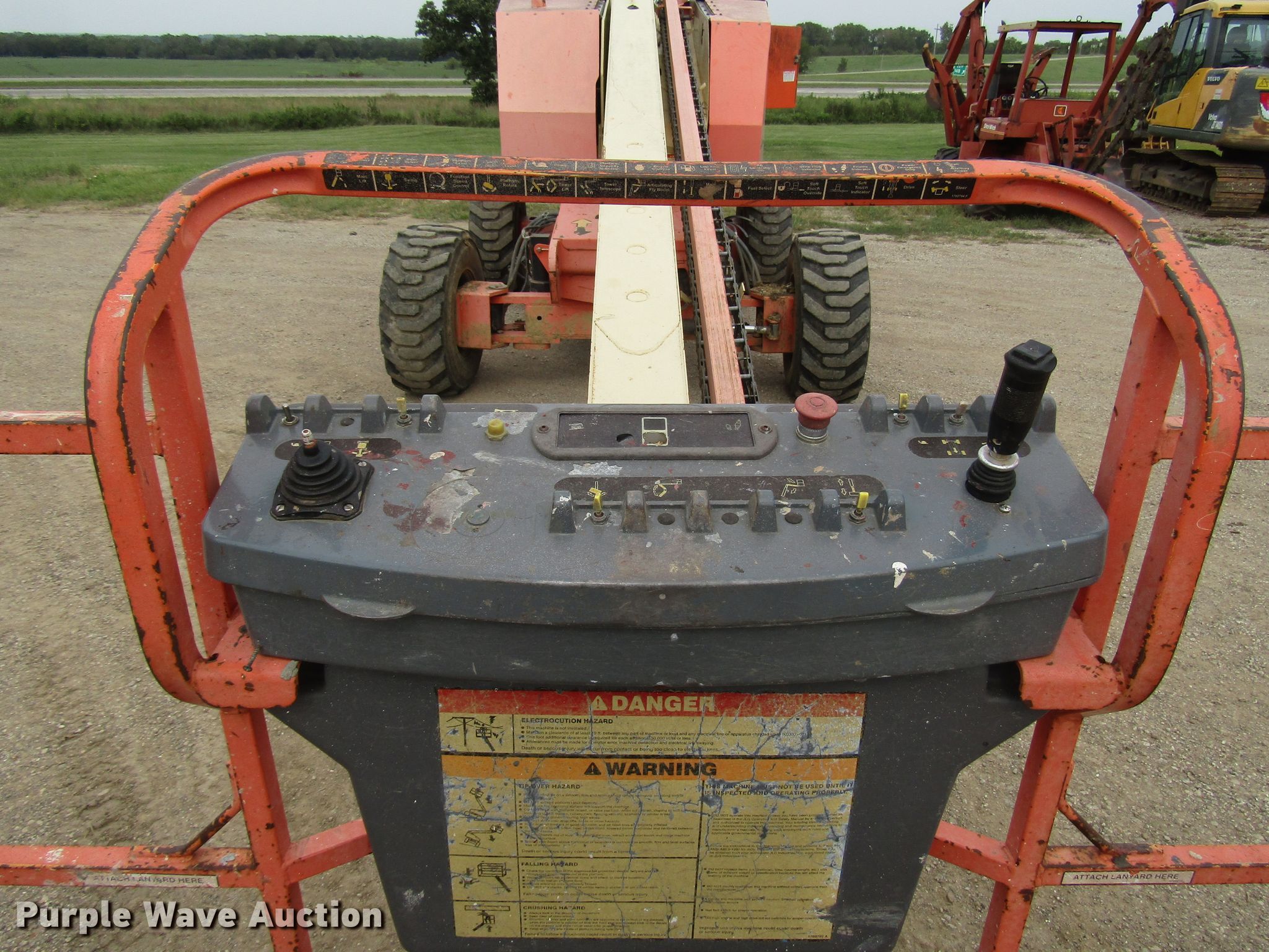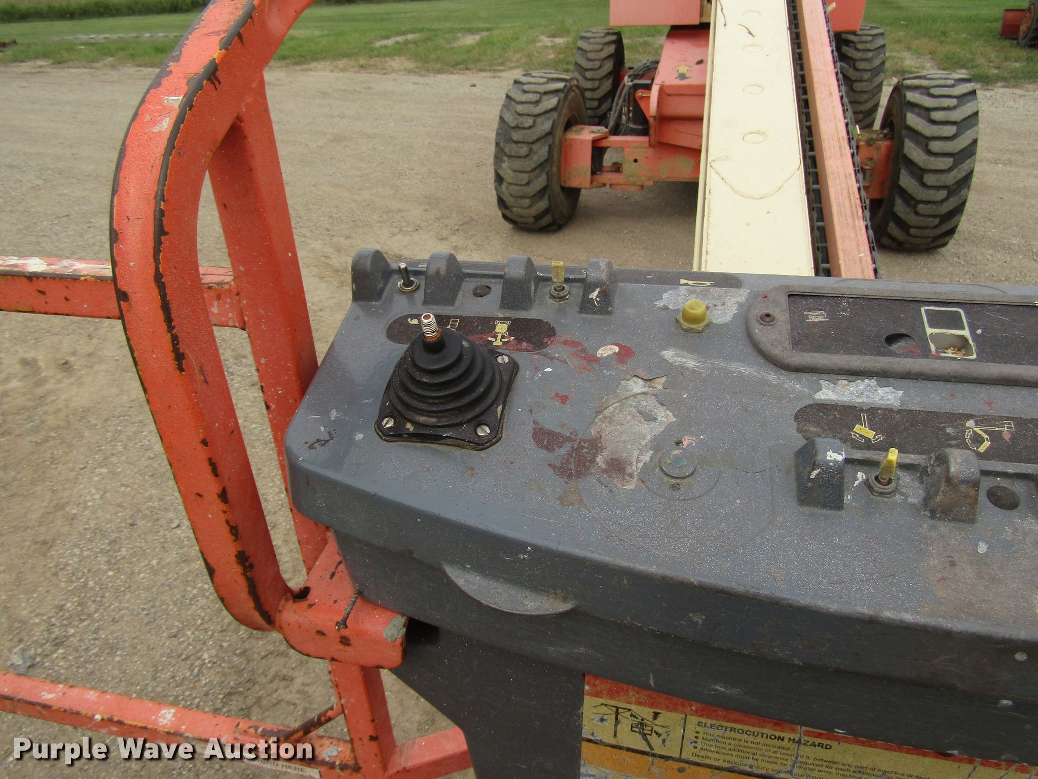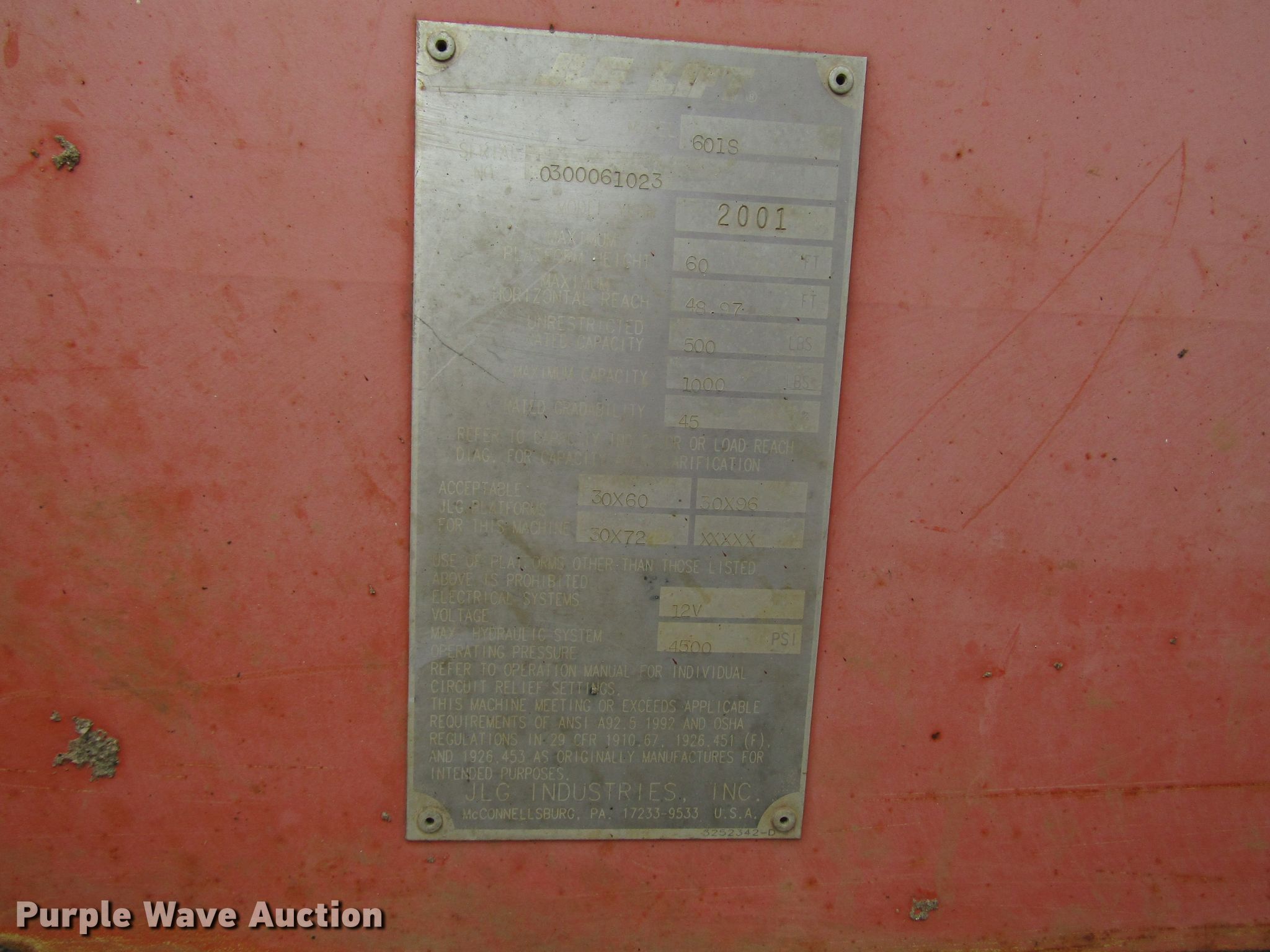 Purple Wave is selling a used Boom Lift in Kansas. This item is a 2001 JLG 601S boom lift with the following: 5,888 hours on meter, Ford four cylinder dual fuel engine, Gas and propane capable, Four wheel drive, 1,000 lbs maximum lift capacity, 48.97' maximum reach, 60' maximum lift height, 8'L x 29"W platform, Ground and platform controls, AC power outlet, 14-17.5 tires, Serial 0300061023