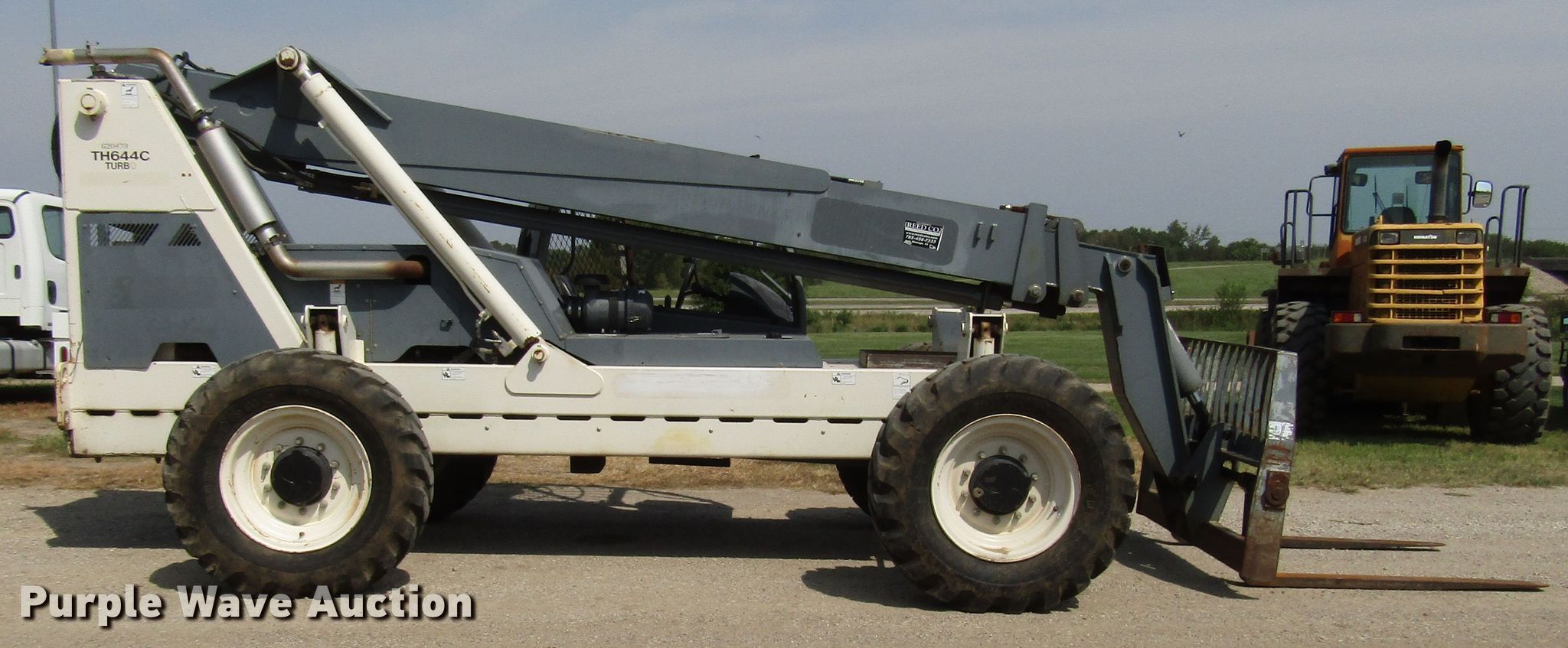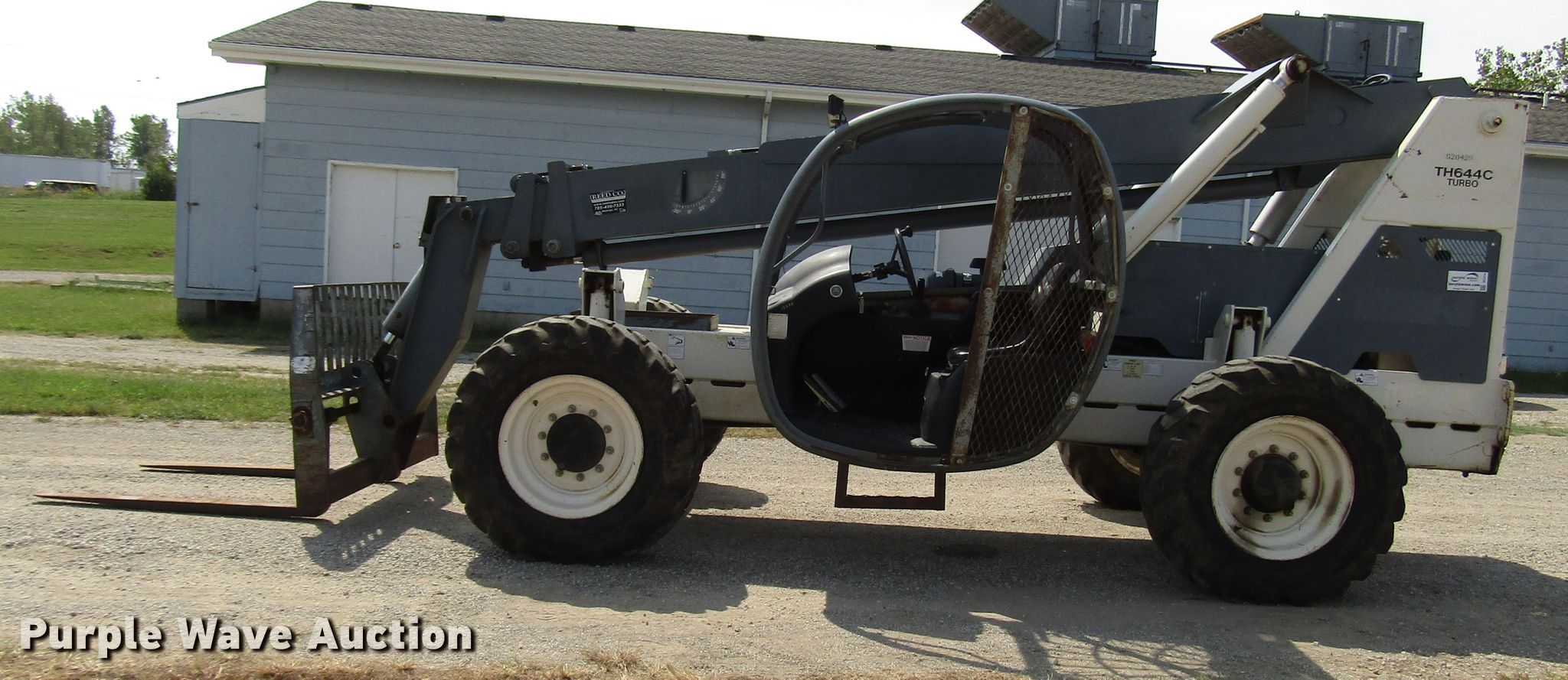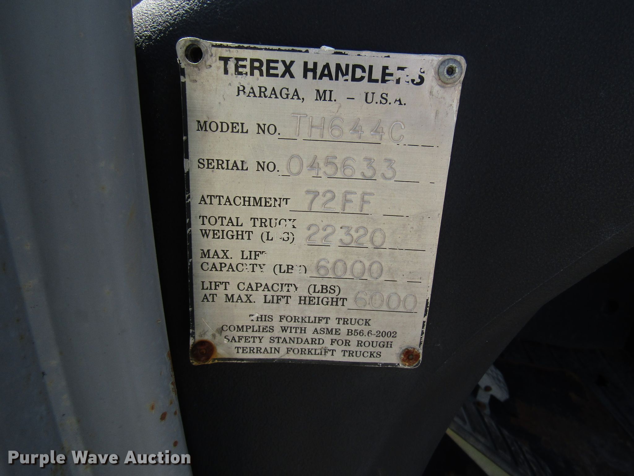 Purple Wave is selling a used Telehandler in Kansas. This item is a 2004 Terex TH644C telehandler with the following: 39 hours on meter, John Deere 4045TF270B 4.5L four cylinder diesel engine, Powershift transmission, 3F-3R gears, Four wheel drive, Four wheel steer, Crab steer, OROPS, 6,000 lbs maximum lift capacity, 44' maximum lift height, Three stage mast, 48"L forks, 13.00-24 foam-filled tires, Serial 045633