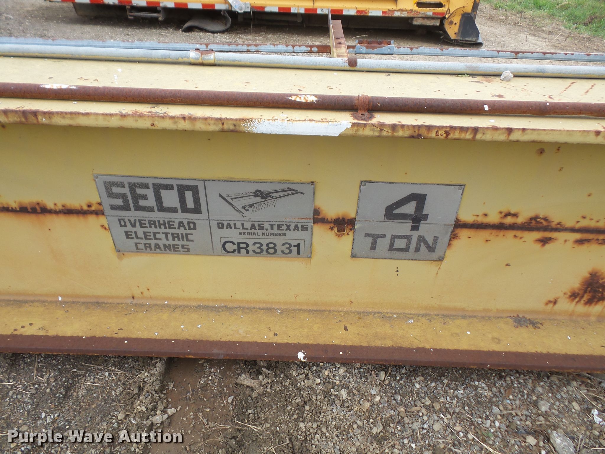 Seco overhead crane. Four ton capacity, 50'L, Unknown operating condition , Serial CR3831. Reed Company, LLC. 2738 Fauna Rd NW. Lebo, KS 66856