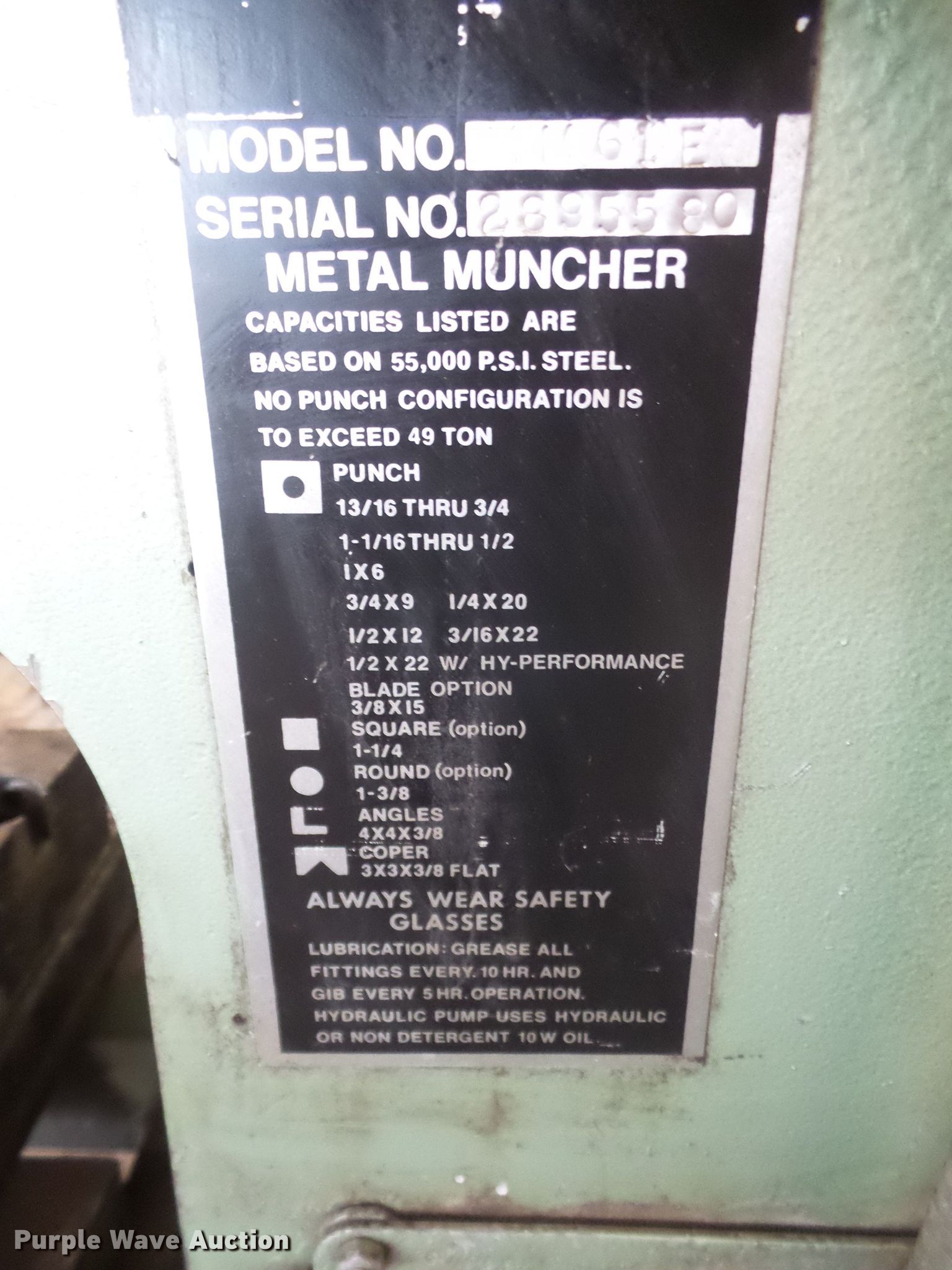 Purple Wave is selling a used Machine Shop Tools and Equip. in Kansas. This item is a Metal Muncher MM61E iron worker with the following: Three phase, 240V, Serial 2895580
