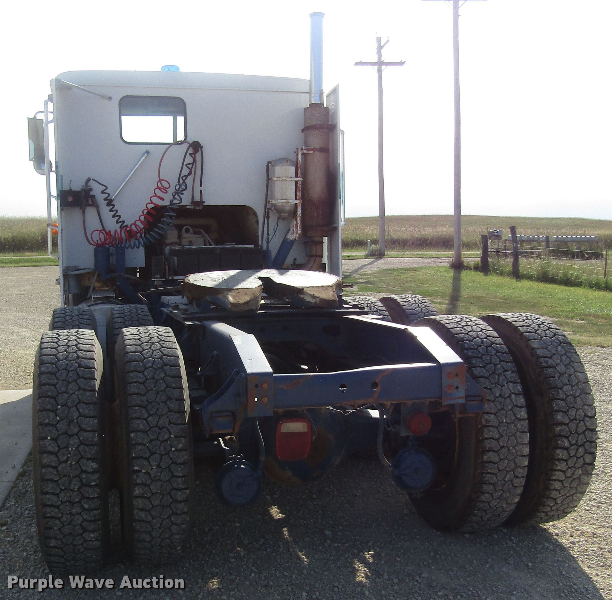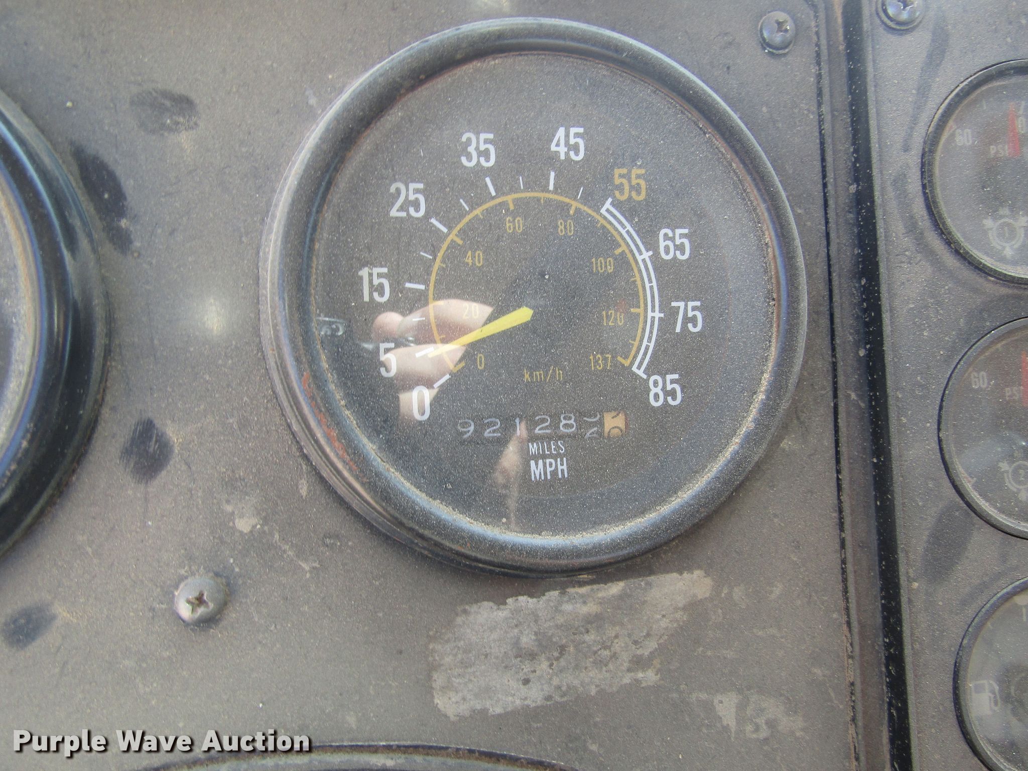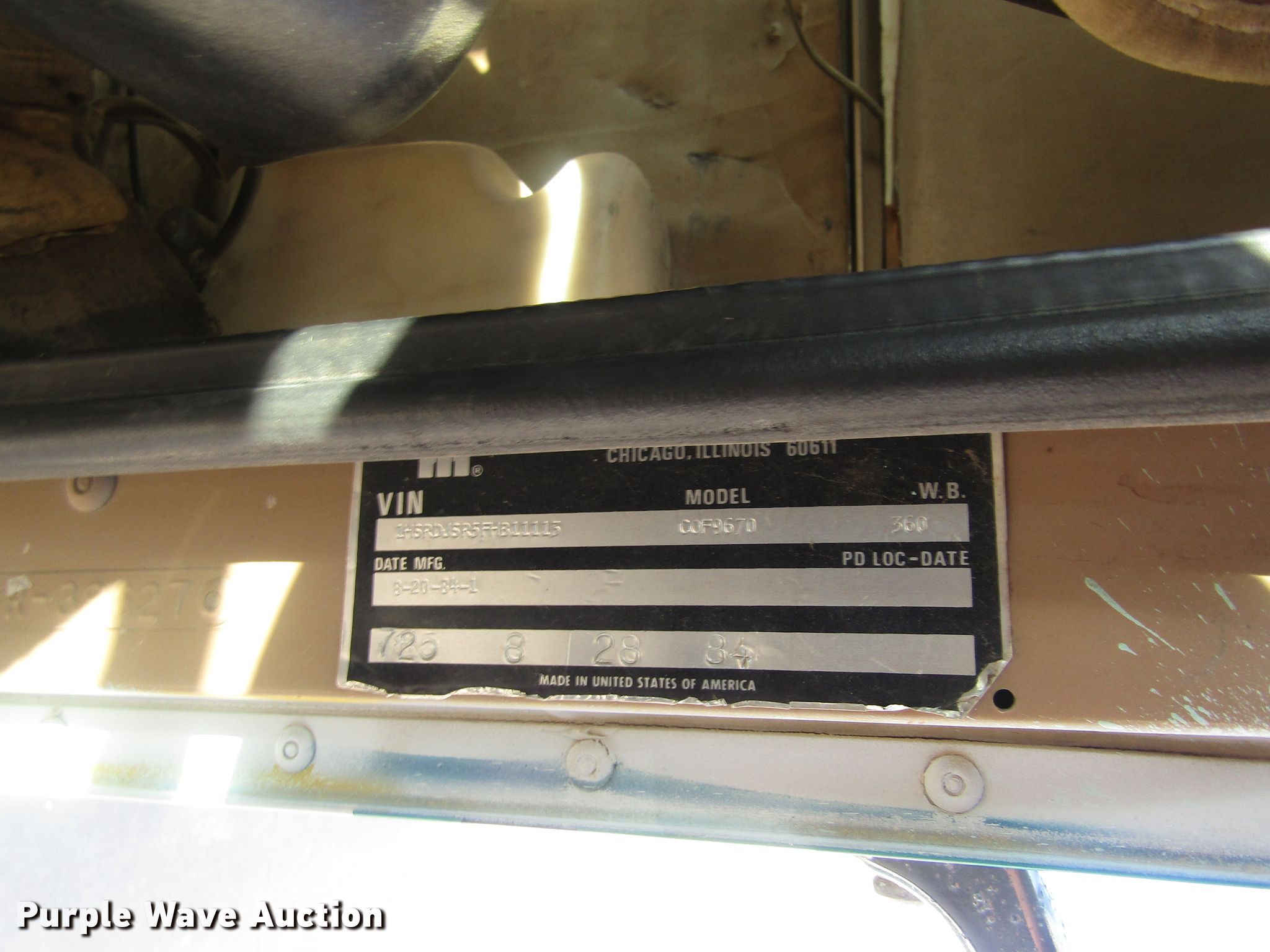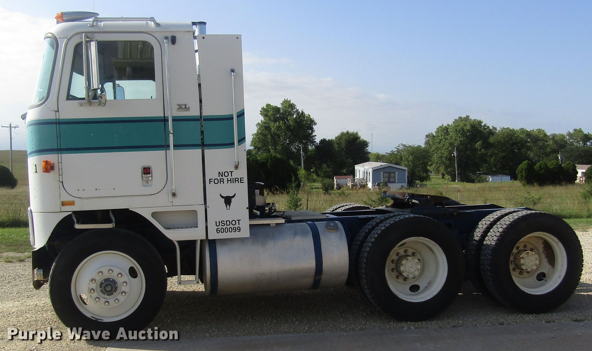Purple Wave is selling a used Truck Tractor in Kansas. This item is a 1985 International COF9670 Series XL semi truck with the following: 921,286 miles on odometer, Cummins six cylinder diesel engine, Eaton Fuller Road Ranger nine speed manual transmission, Tandem axle, Inter-axle differential lock, Heat, Air ride cab, Aluminum deck plate, Fixed fifth wheel plate, Dual fuel tanks, Air suspension, Air brakes, 140" wheelbase, 285/75R24.5 tires, Cracked windshield
