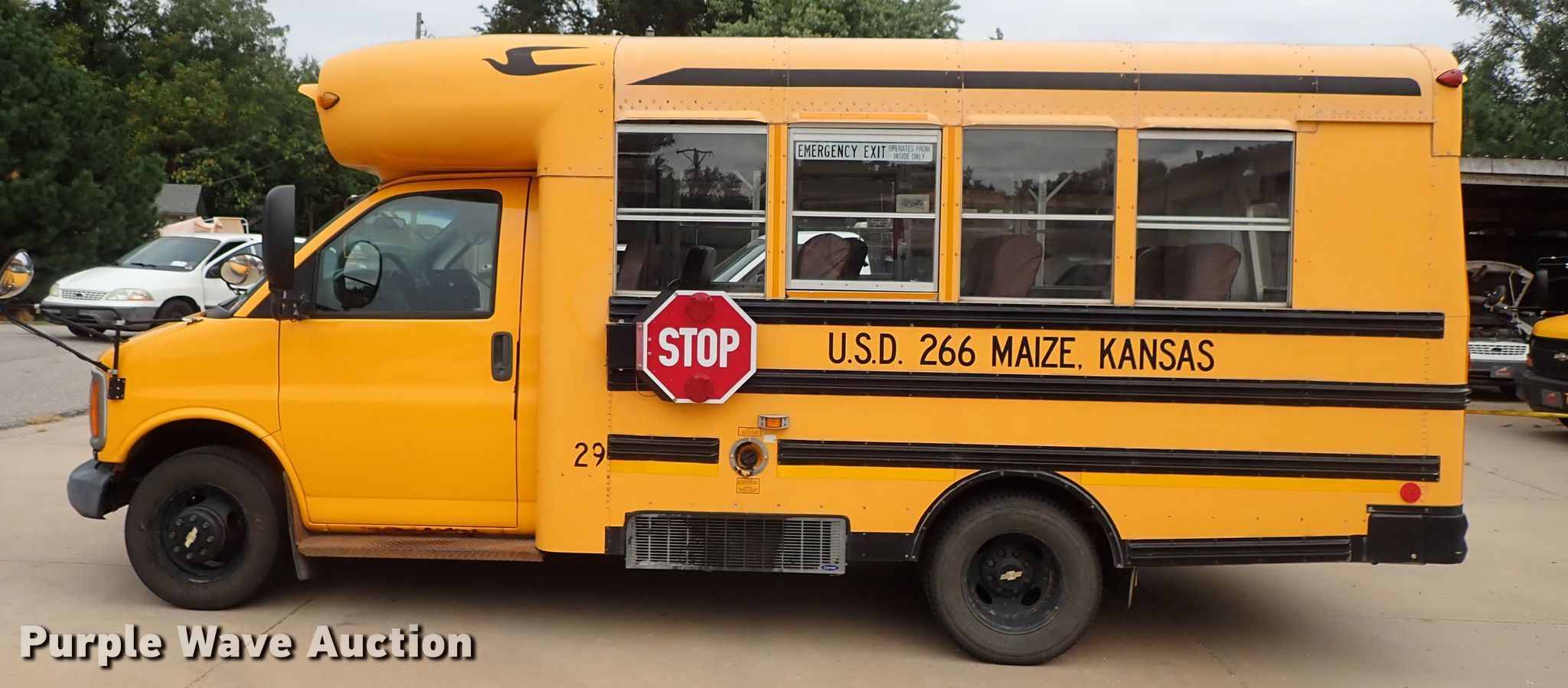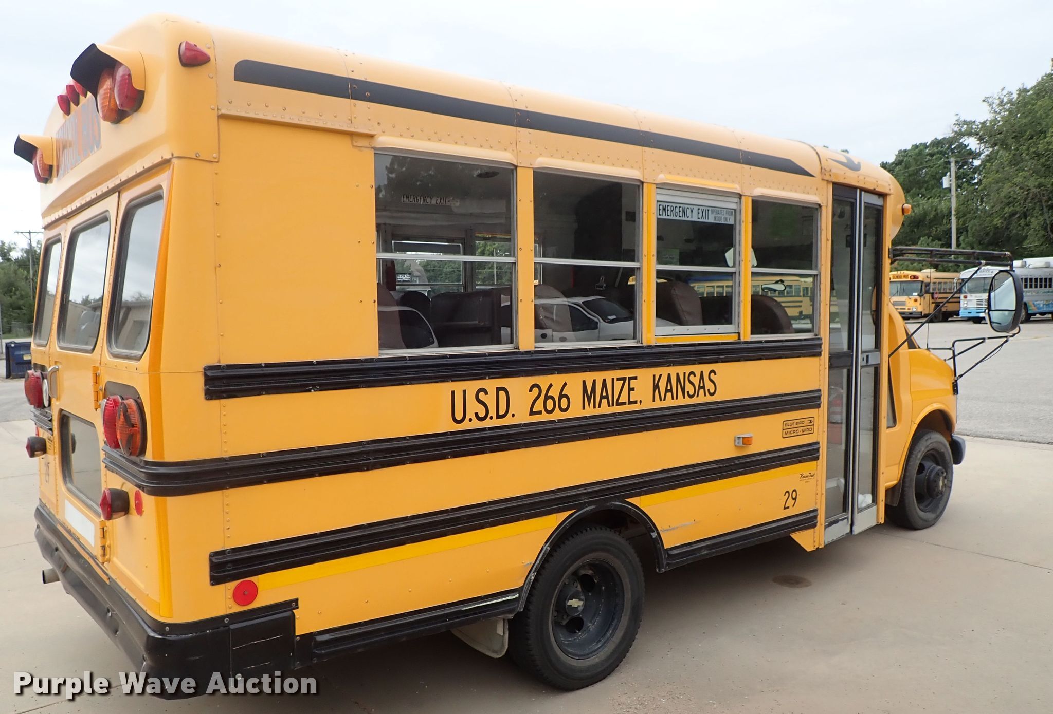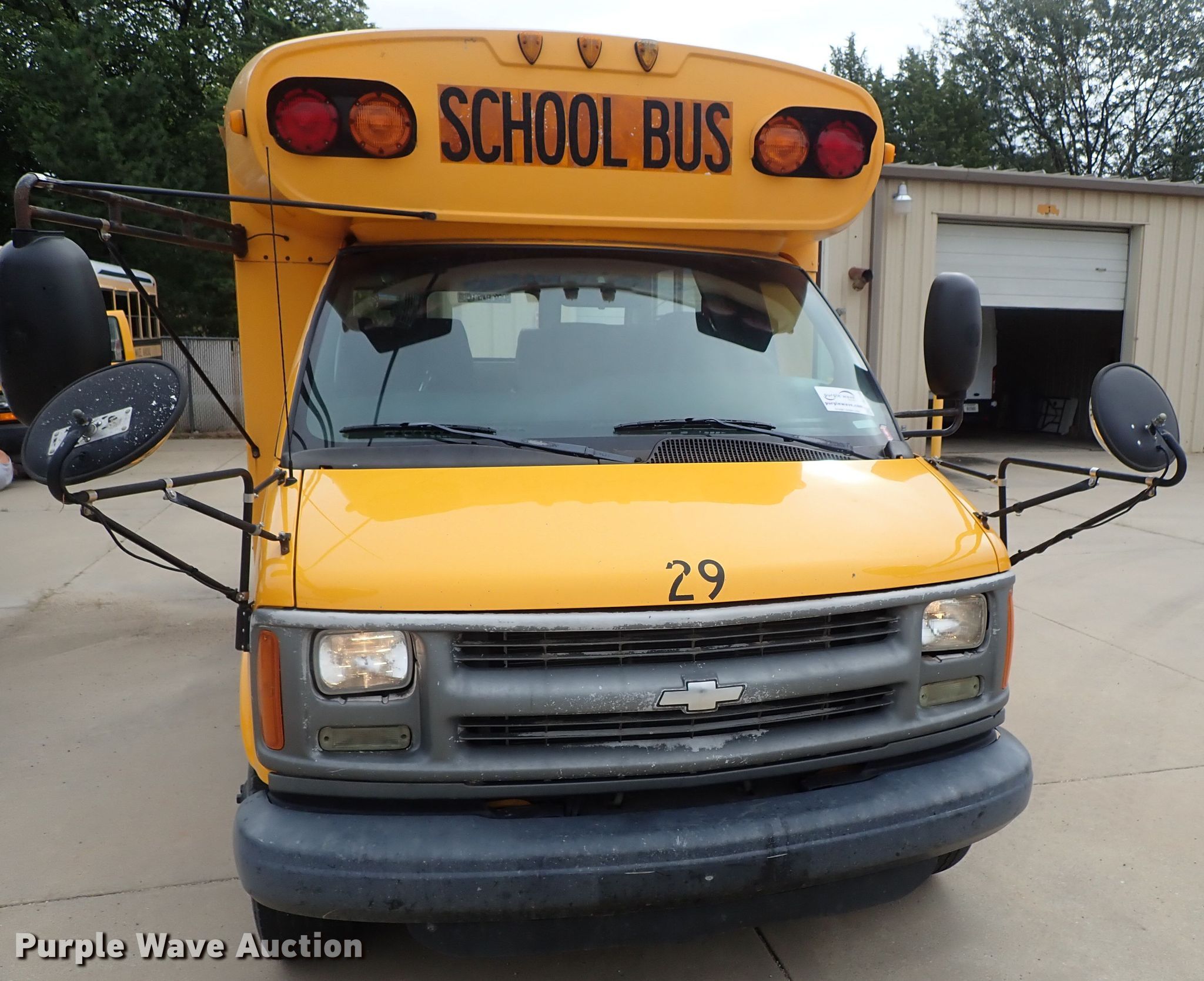 Purple Wave is selling a used Bus in Kansas. This item is a 2002 Chevrolet Express G3500 Blue Bird school bus with the following: 204,054 miles on odometer, 5.7L V8 OHV 16V gas engine, Automatic transmission, Single axle, AC and heat, 14 passenger capacity, Spring suspension, Hydraulic brakes, LT225/75R16 tires, Weak battery, Unit# 29