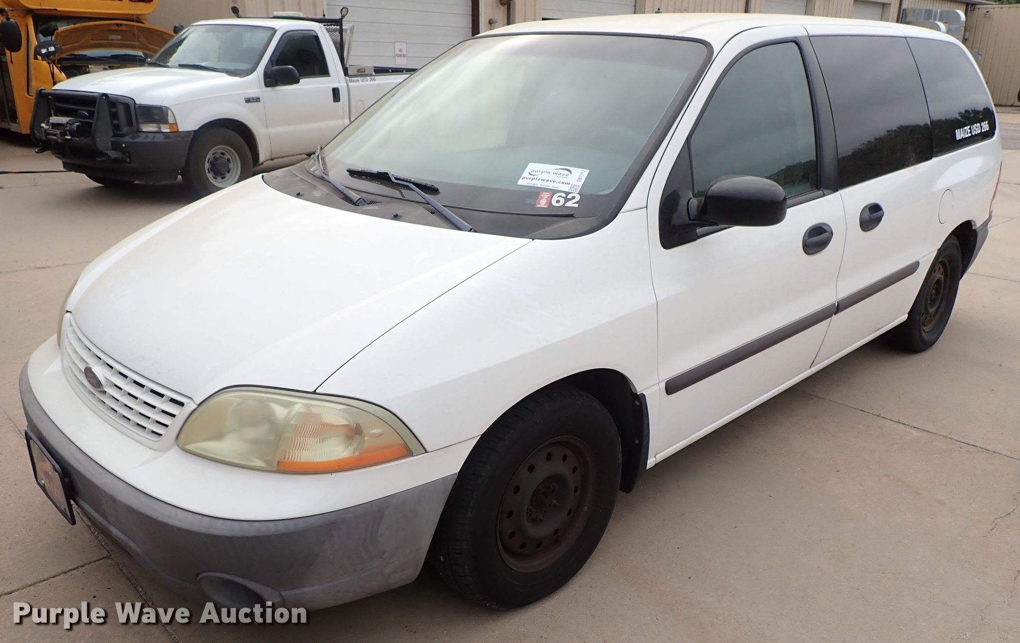 Purple Wave is selling a used Passenger Vehicle in Kansas. This item is a 2002 Ford Windstar van with the following: 158,029 miles on odometer, 3.8L V6 OHV 12V gas engine, Automatic transmission, AC and heat, Cruise, Power windows and locks, 215/70R15 tires, Weak battery, Unit# 62