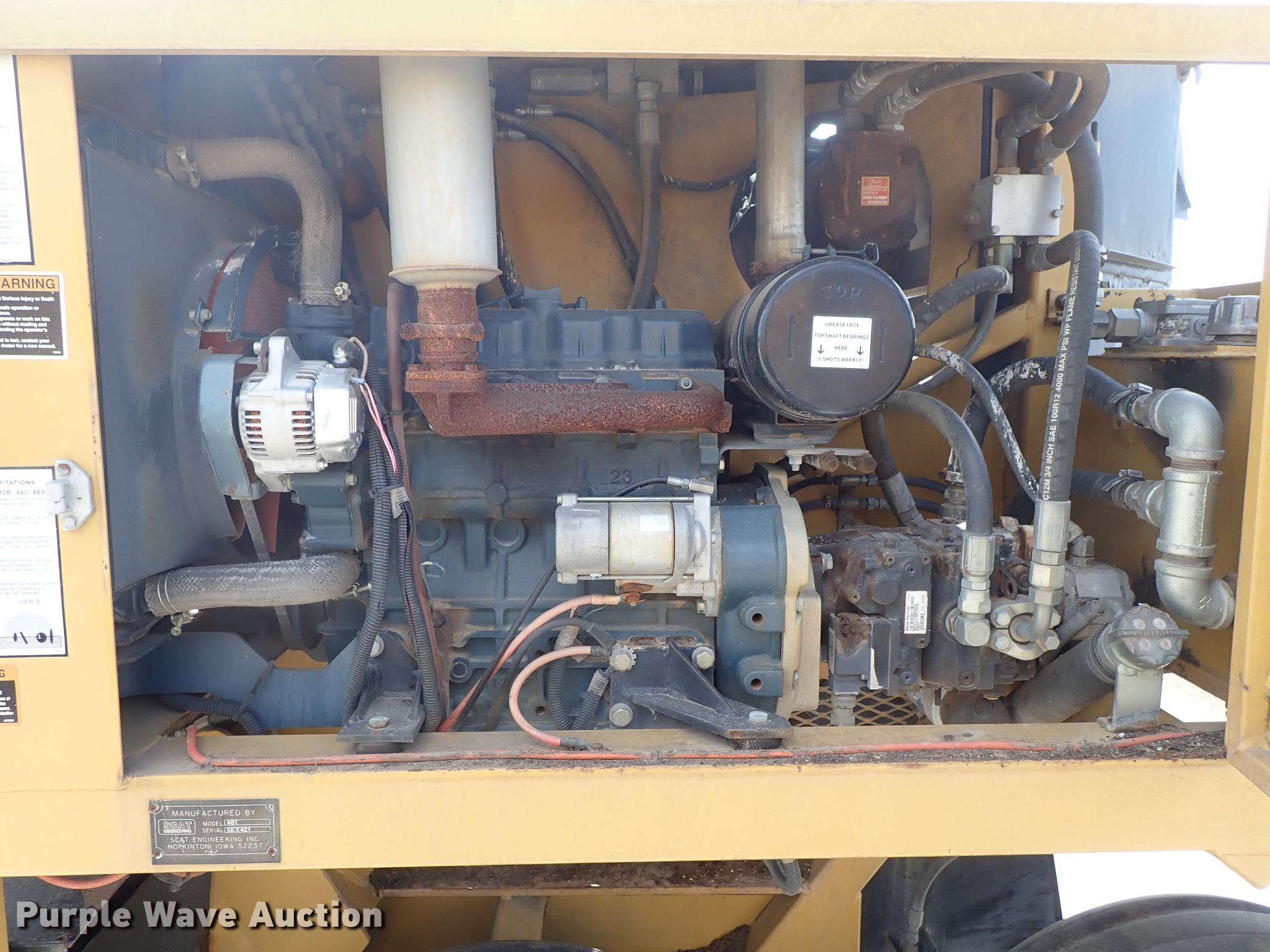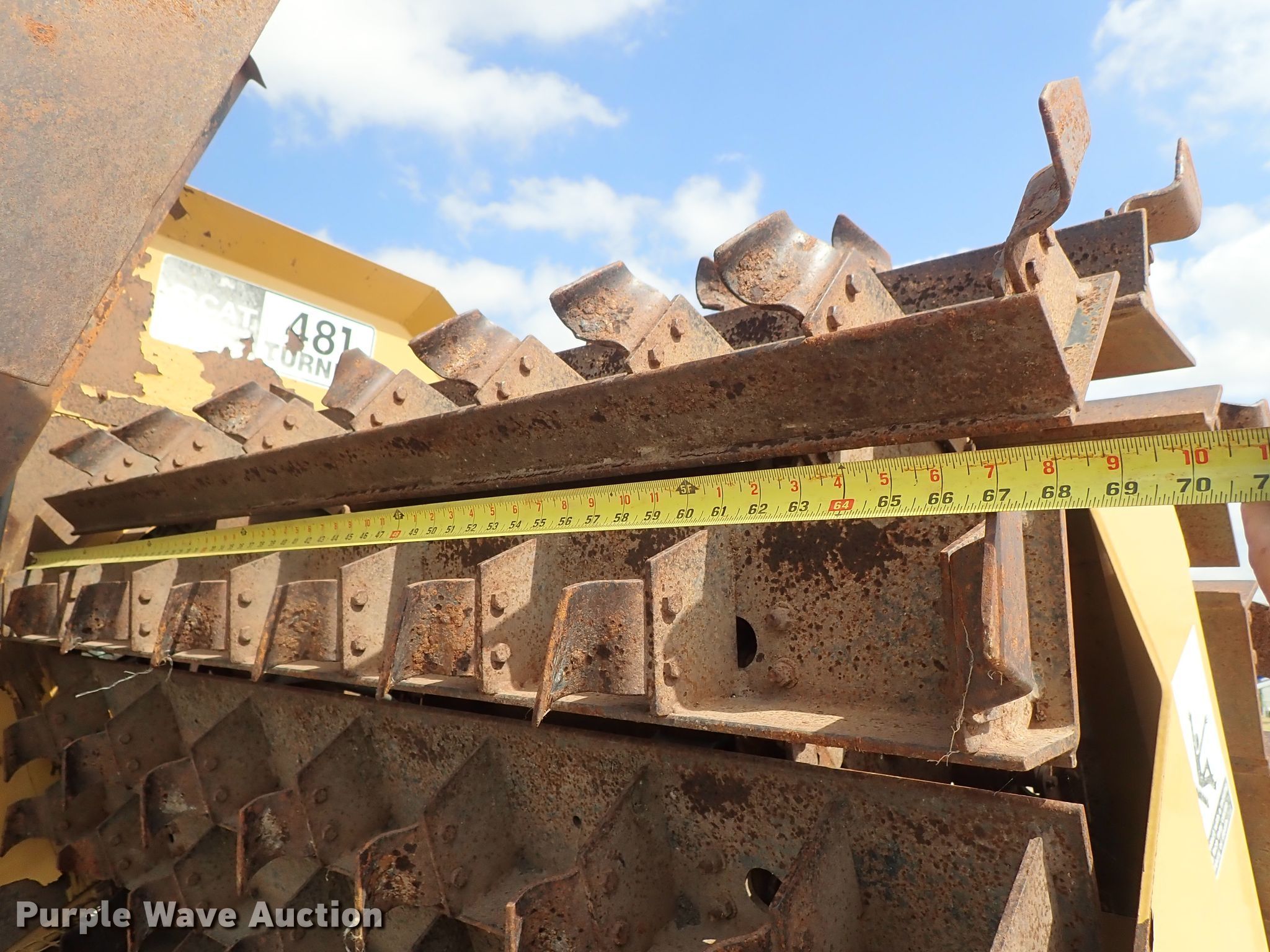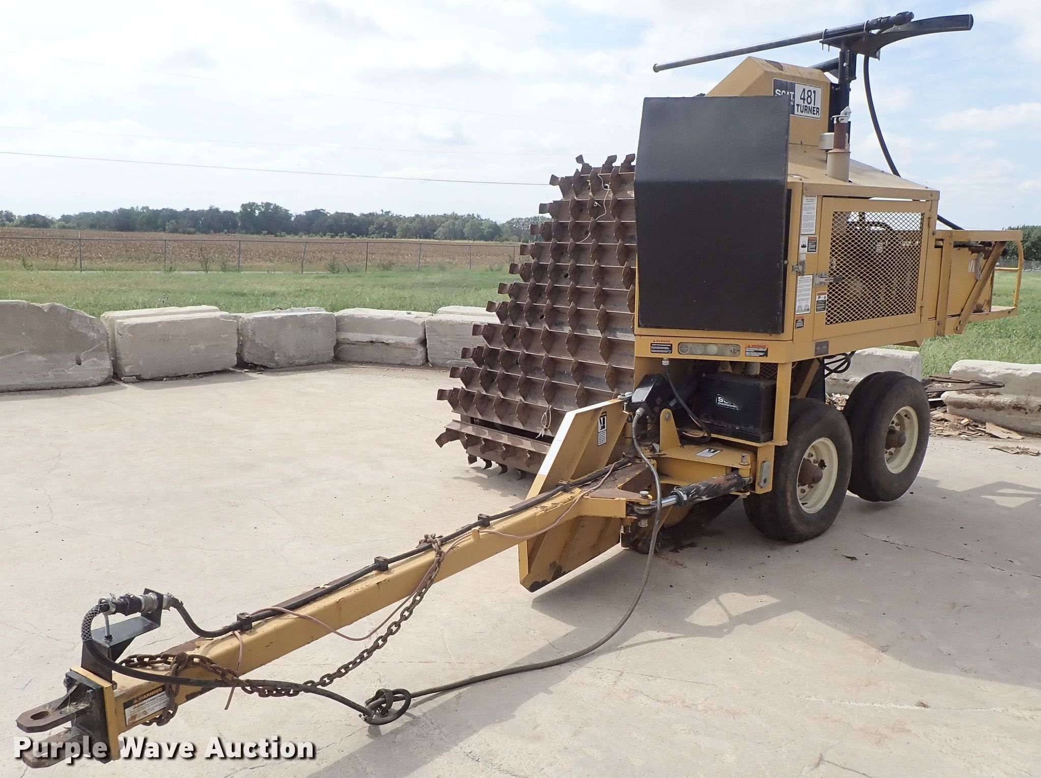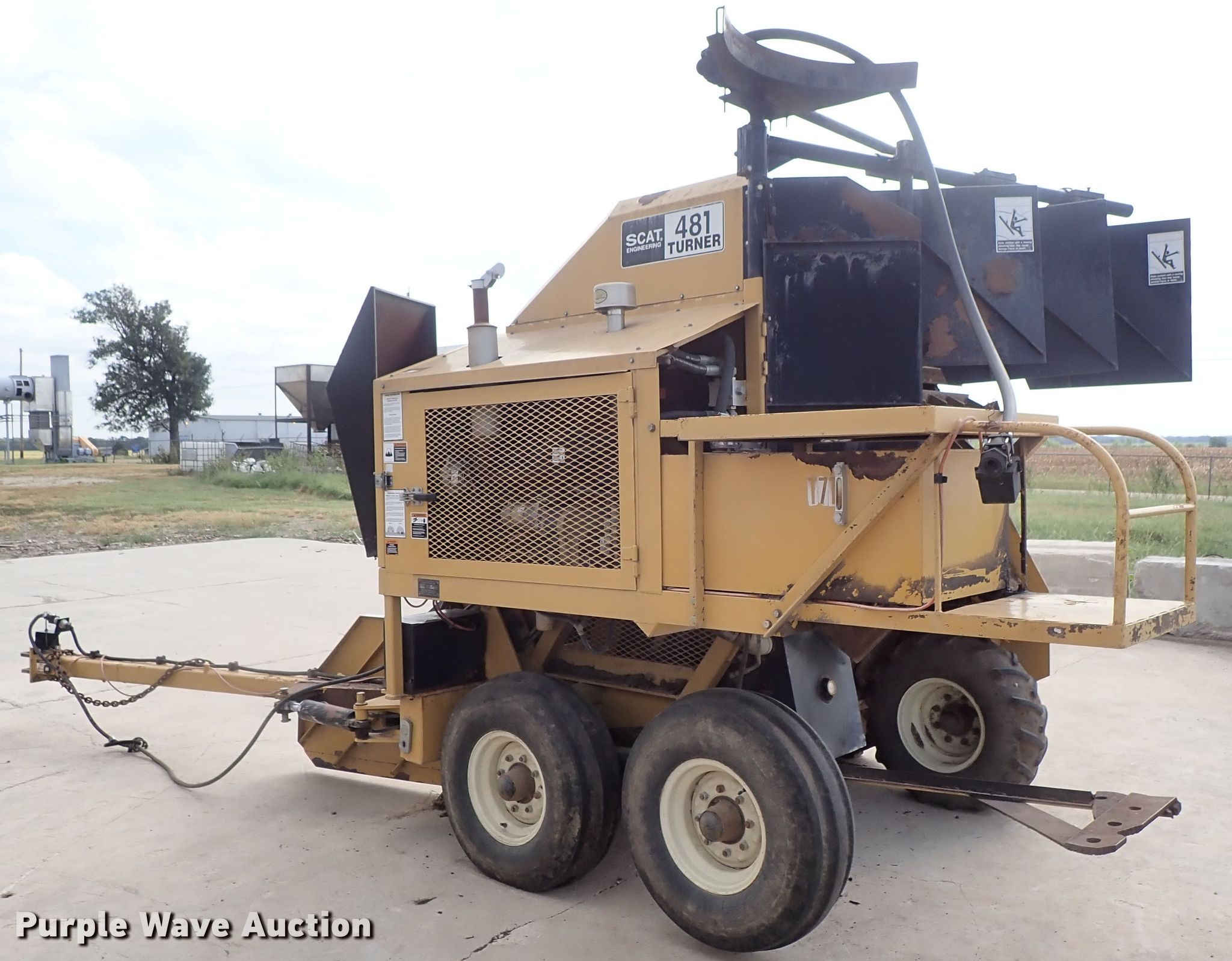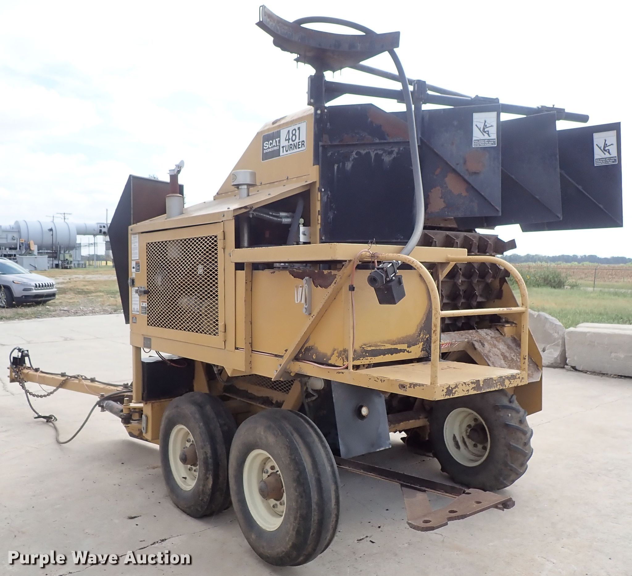 Scat 481 compost turner. 367 hours on meter, Approx. 67"W, Kubota V2203-E four cylinder diesel engine, Tethered pendant, Hydraulic angle, Pin hitch, 12.5L-15 tires, Serial 5EX421. Harvey County Solid Waste. 3205 SW 24th. Newton, KS 67114